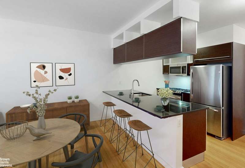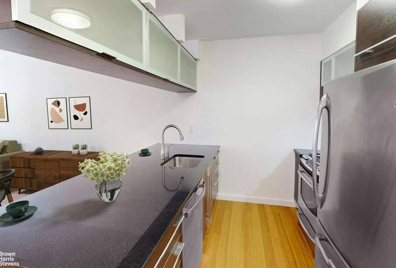 Discover modern elegance meets comfort in this stunning 1-bedroom apartment with a private balcony. This generously spacious home showcases a perfect blend of style and functionality, featuring an open kitchen adorned with stainless steel GE appliance package, anti-slam cabinetry made of Wenge wood, professional-grade granite countertops, Kohler fixtures, and ceramic tile backsplashes, plus dishwasher. The beautiful Bamboo floors throughout are both aesthetically pleasing and environmentally conscious , this residence exudes brightness and warmth. Retreat to the oversized bedroom, designed for relaxation and tranquility, where you can easily accommodate a king-size bed and In-unit laundry for ultimate convenience. Take advantage of exceptional amenities that elevate your living experience, including a charming common courtyard, a virtual doorman for added security, and a rooftop deck boasting breathtaking city views and no excuses, there is a fitness room. Home is pre-wired for Verizon Fios and Spectrum. PTAC units in each room for efficient central air and heating.