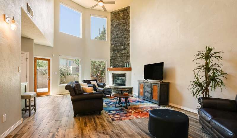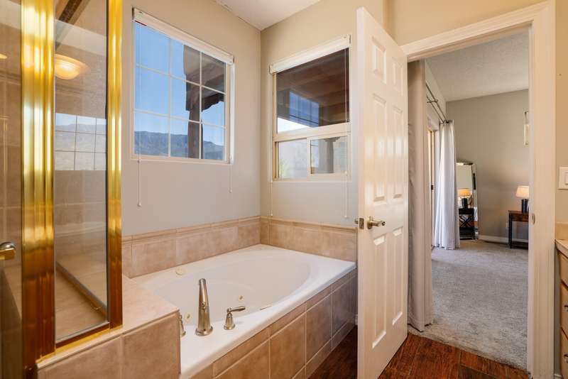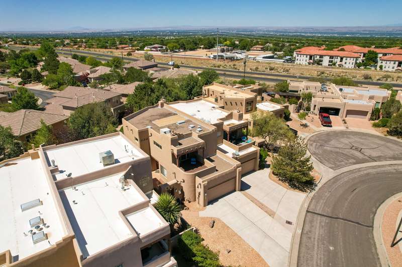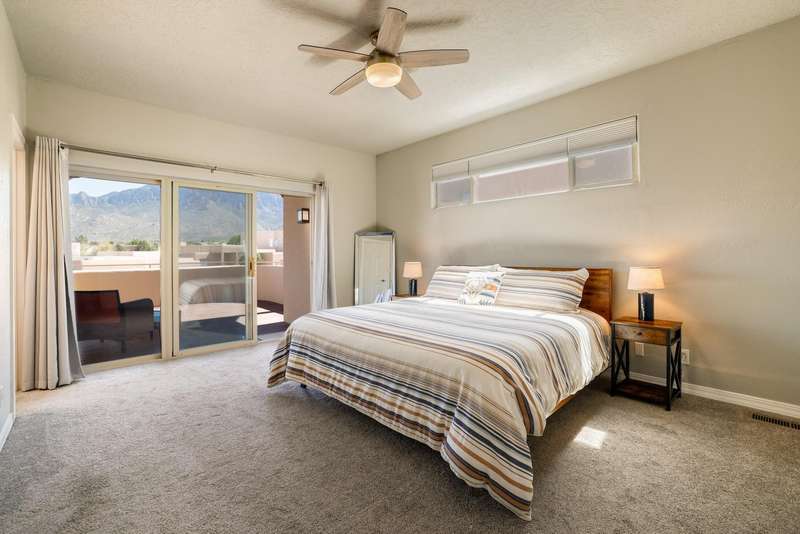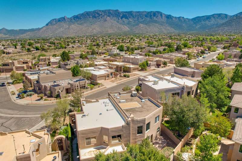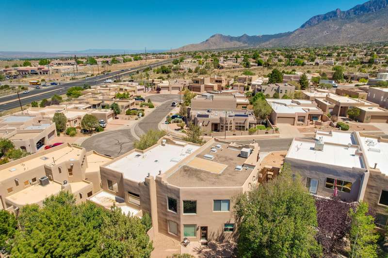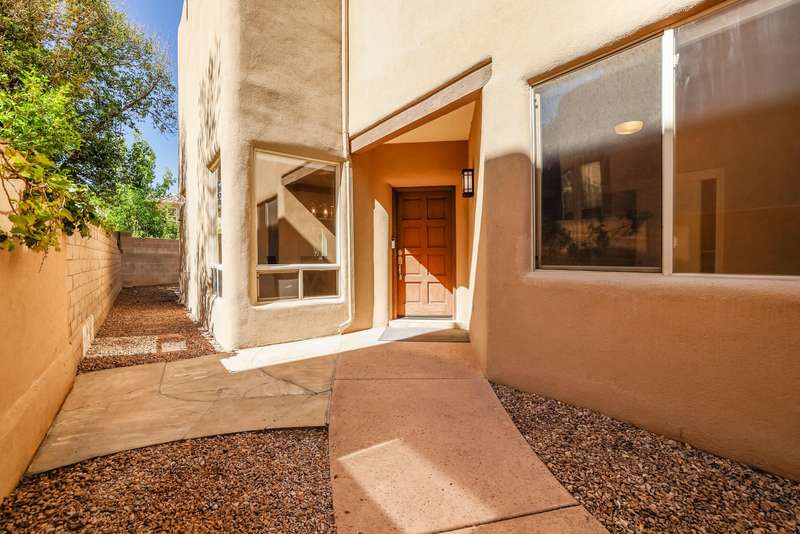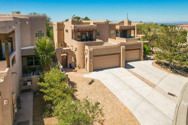 PRICED REDUCED AND FABULOUS VIEWS! This home is light & bright w/ a functional floor plan. Home is entered through through a private courtyard gate. 1 bdrm on the main with use of 3/4 bath. Large living room has soaring ceilings w/ a stacked stone fireplace, wood accents & room for 2 seating areas or nook. Primary bdrm features walk in closet, separate bath & shower + 2 sinks. Balcony w/ great views of the Sandias! Updated tile flooring throughout. Newer stainless oven, microwave, dishwasher, water heater & furnace. Location makes it an easy commute to most places in ABQ & offers quick access to both freeways. Close to foothill trails & High Desert park w/ both tennis courts & playground.