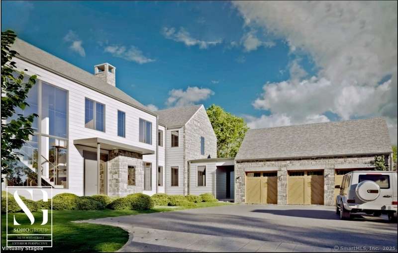 Exceptional commanding luxury estate under development in prime mid country location. The 2.39 acre gated & elevated site includes a 13,326 SF main house with 6 bedrooms / 8.3 bathrooms across 4 levels of custom crafted living space with indoor parking for 7 cars - plus an outfitted 800 SF luxury pool house with vaulted ceilings, heated floors, stone fireplace & full bathroom overlooking a large terrace, 50 ft. pool with integrated spa & sundeck plus a sprawling lawn area with sunken fire pit & Bocce court. Designed by the SOHO Group, this striking transitional home with soaring ceilings & tremendous light is perfectly layered in clapboard, hand chiseled fieldstone & oversize glass. A 3-stop elevator plus an amenity-filled lower level complete the offering. Est. completion date: Dec. 2025
