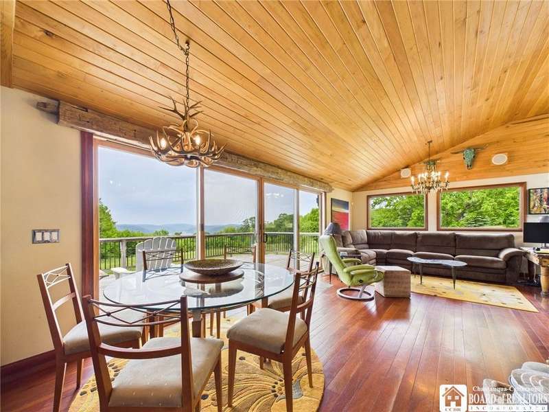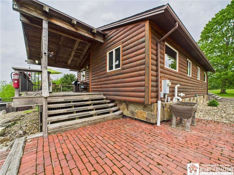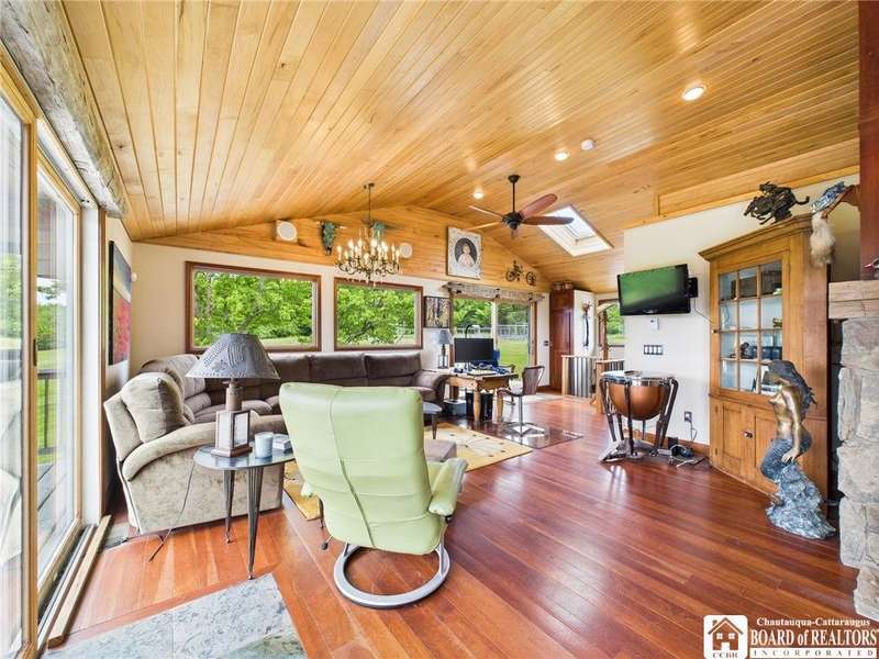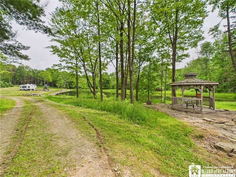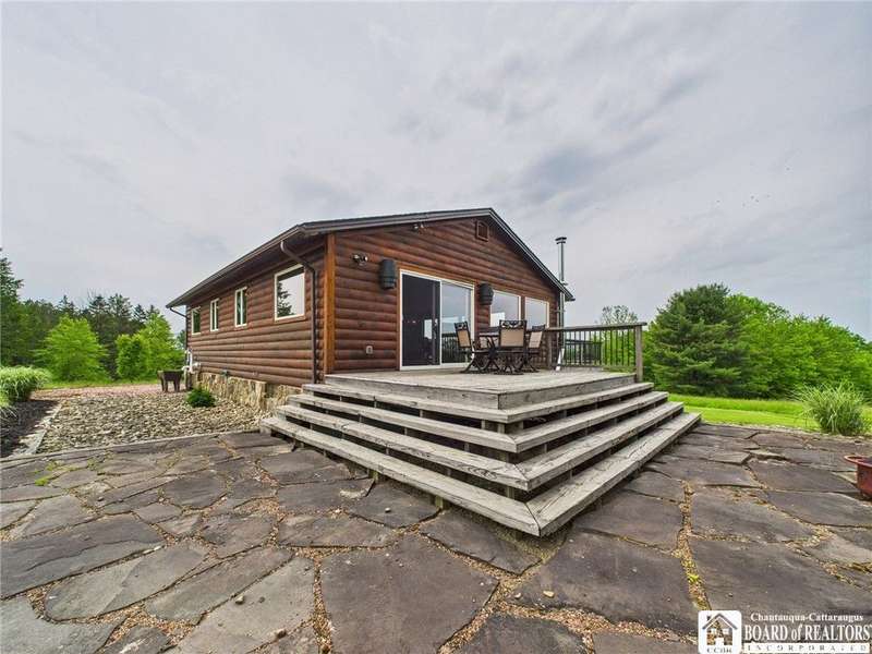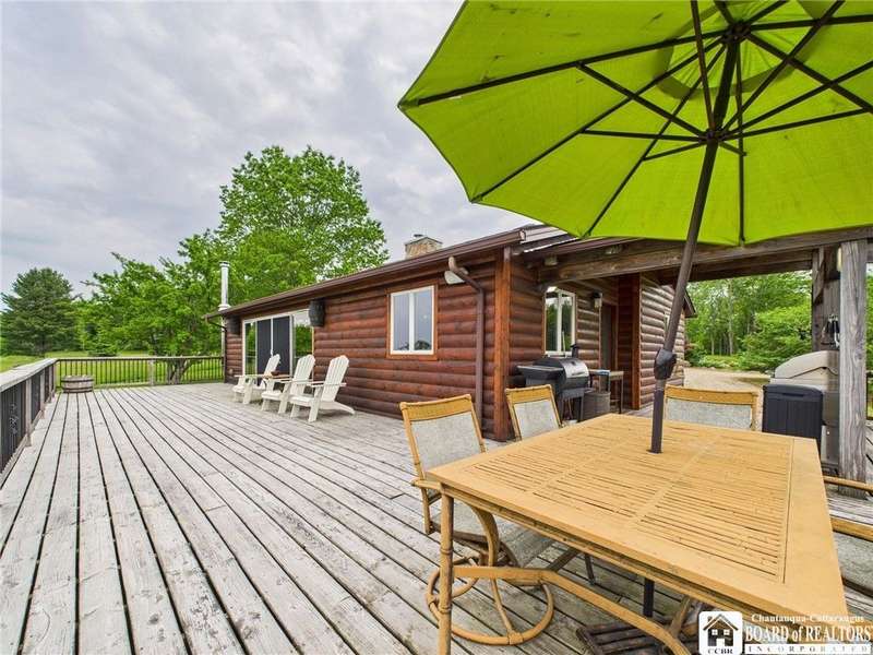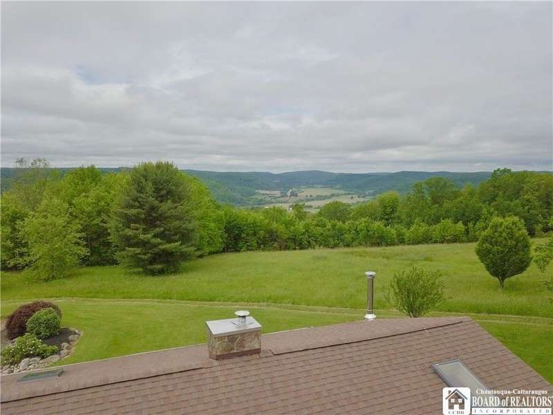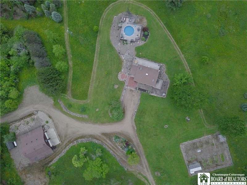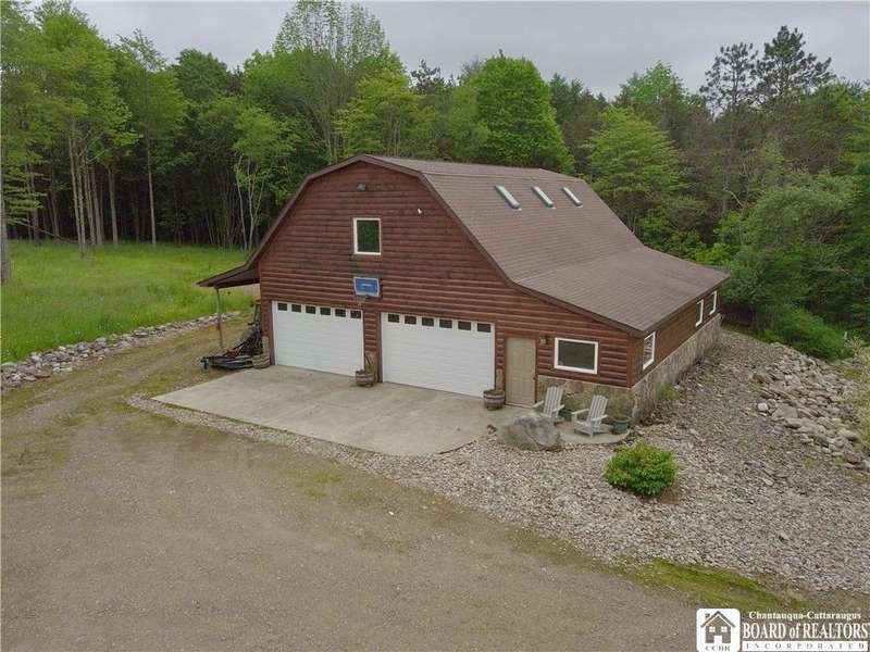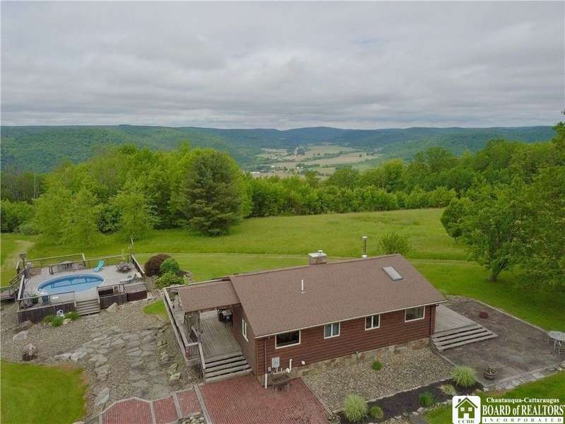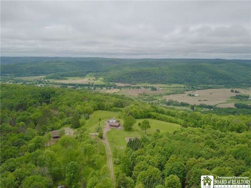 Discover a rare gem just minutes from Ellicottville?77 acres of private, picturesque country living with unbeatable outdoor access. This one-of-a-kind ranch-style property shares its border with the 832-acre Raecher Hill State Forest, offering limitless possibilities for hiking, wildlife watching, and exploring right from your backyard. The main home features two spacious bedrooms and two full bathrooms, with grand cathedral ceilings, hardwood and natural stone floors, a beautifully updated bathroom, and breathtaking views of Holiday Valley that stretch for miles. The basement features heated electric floors, a wood stove, another full bath and even a sauna. With approximately 2,200 square feet of living space?not including the barn or guest apartment?there's room to relax, entertain, and enjoy life in every season. It is about ten minutes from Holiday Valley and bustling downtown Ellicottville. Two private pond enhances the serene setting, creating the perfect spot to unwind. The barn-style garage is a standout feature, offering an upstairs private bar room for entertaining, and a fully appointed garage apartment with heated floors, a private bathroom, and its own cozy living space?ideal for guests or short-term rentals. A second outbuilding provides ample space for storing a tractor, outdoor equipment, or anything else you can dream up. As a bonus, the property also includes a well-maintained camper, perfect for temporary stays, visiting guests, or even your secluded weekend hideaway. The camper has solar panels and water to make it even more convenient. Whether you're seeking a private retreat, a base for adventure, or a flexible property with room to grow, this ranch delivers it all.