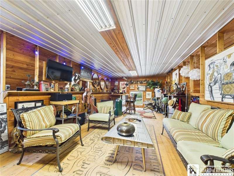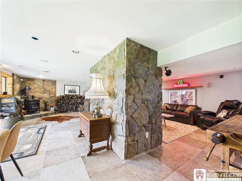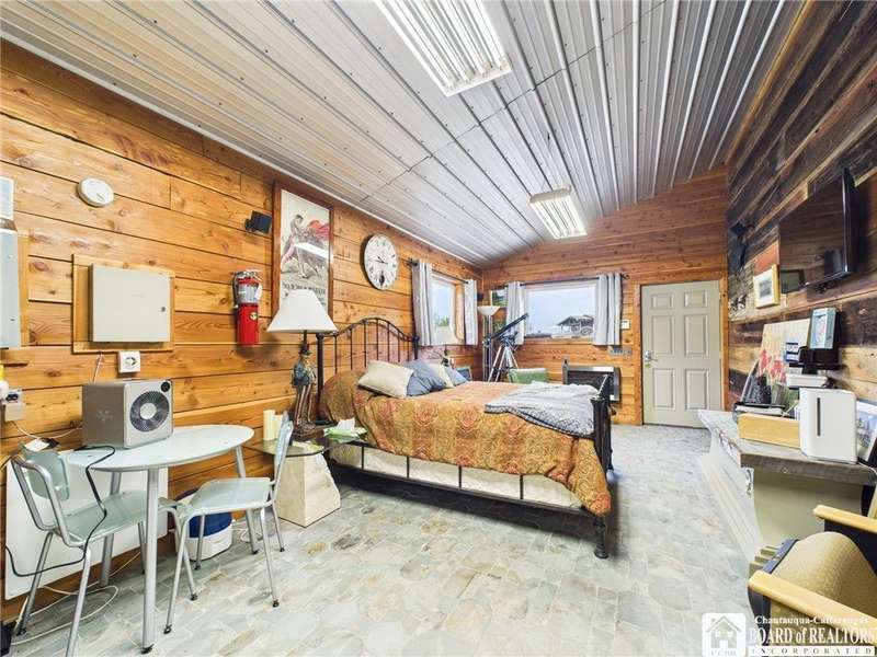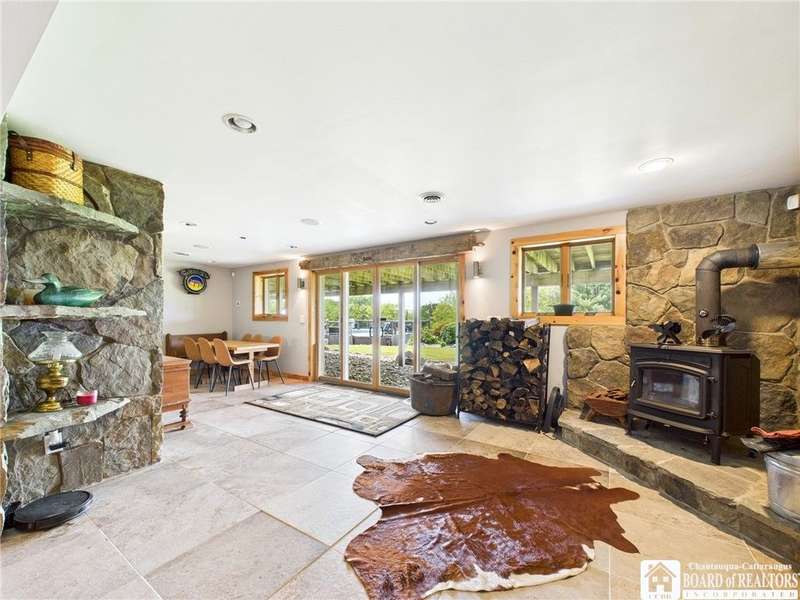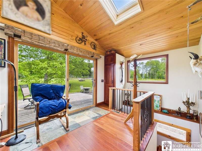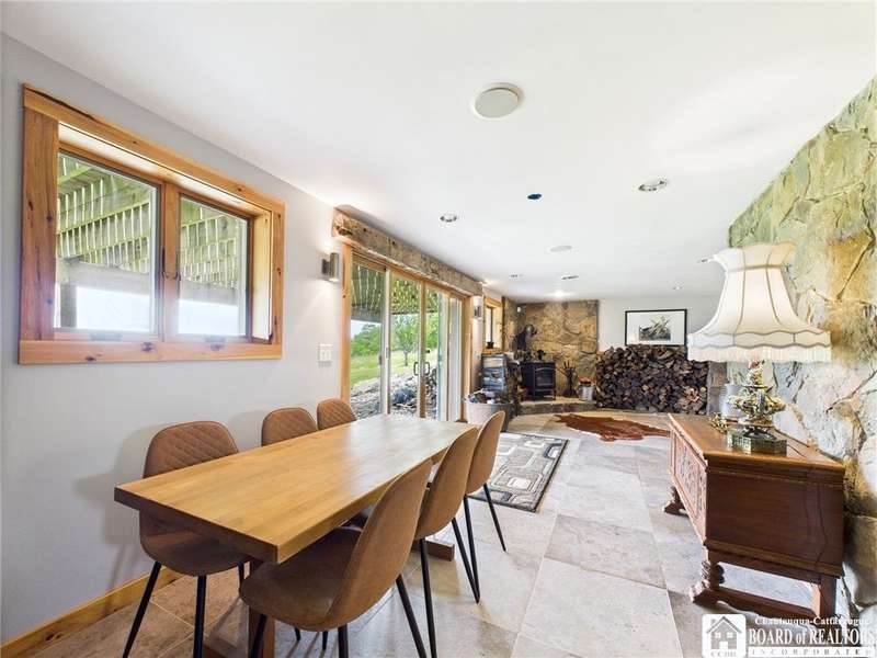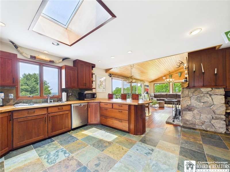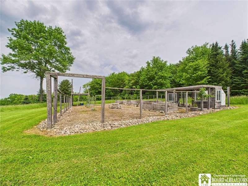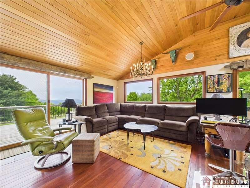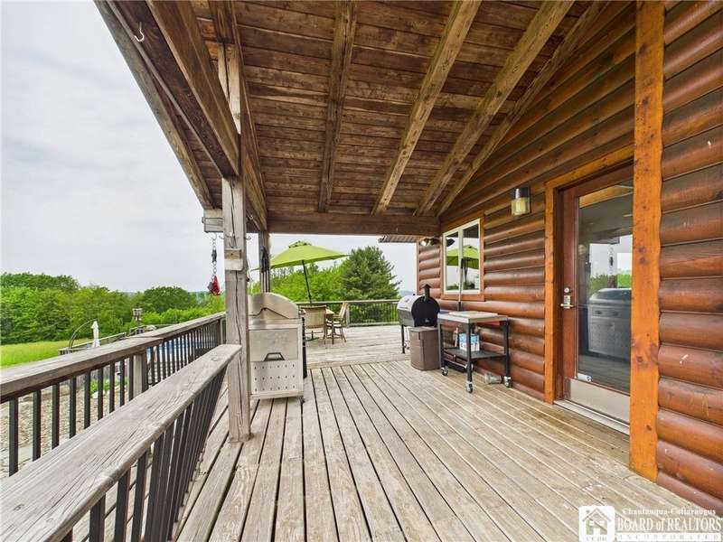 Discover a rare gem just minutes from Ellicottville?77 acres of private, picturesque country living with unbeatable outdoor access. This one-of-a-kind ranch-style property shares its border with the 832-acre Raecher Hill State Forest, offering limitless possibilities for hiking, wildlife watching, and exploring right from your backyard. The main home features two spacious bedrooms and two full bathrooms, with grand cathedral ceilings, hardwood and natural stone floors, a beautifully updated bathroom, and breathtaking views of Holiday Valley that stretch for miles. The basement features heated electric floors, a wood stove, another full bath and even a sauna. With approximately 2,200 square feet of living space?not including the barn or guest apartment?there's room to relax, entertain, and enjoy life in every season. It is about ten minutes from Holiday Valley and bustling downtown Ellicottville. Two private pond enhances the serene setting, creating the perfect spot to unwind. The barn-style garage is a standout feature, offering an upstairs private bar room for entertaining, and a fully appointed garage apartment with heated floors, a private bathroom, and its own cozy living space?ideal for guests or short-term rentals. A second outbuilding provides ample space for storing a tractor, outdoor equipment, or anything else you can dream up. As a bonus, the property also includes a well-maintained camper, perfect for temporary stays, visiting guests, or even your secluded weekend hideaway. The camper has solar panels and water to make it even more convenient. Whether you're seeking a private retreat, a base for adventure, or a flexible property with room to grow, this ranch delivers it all.