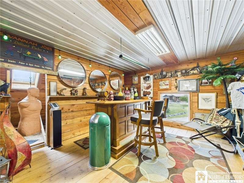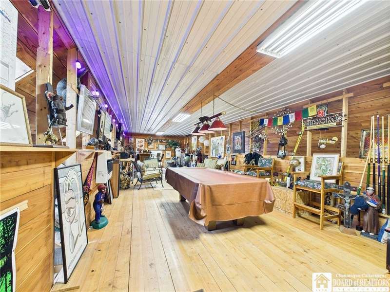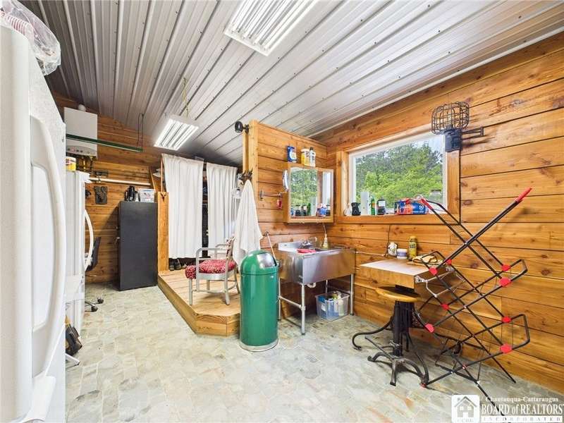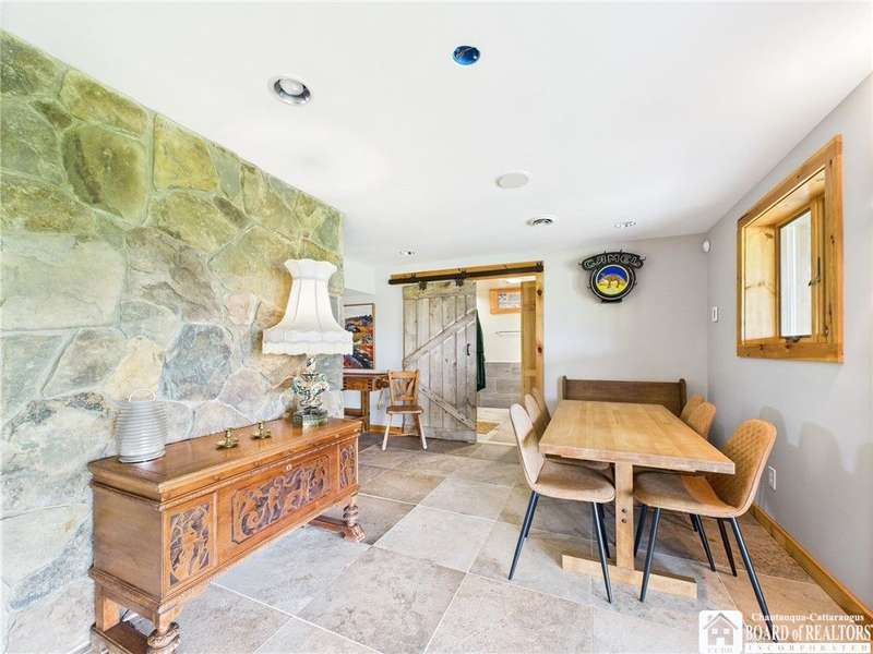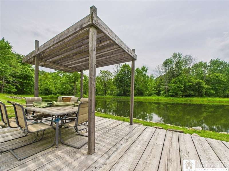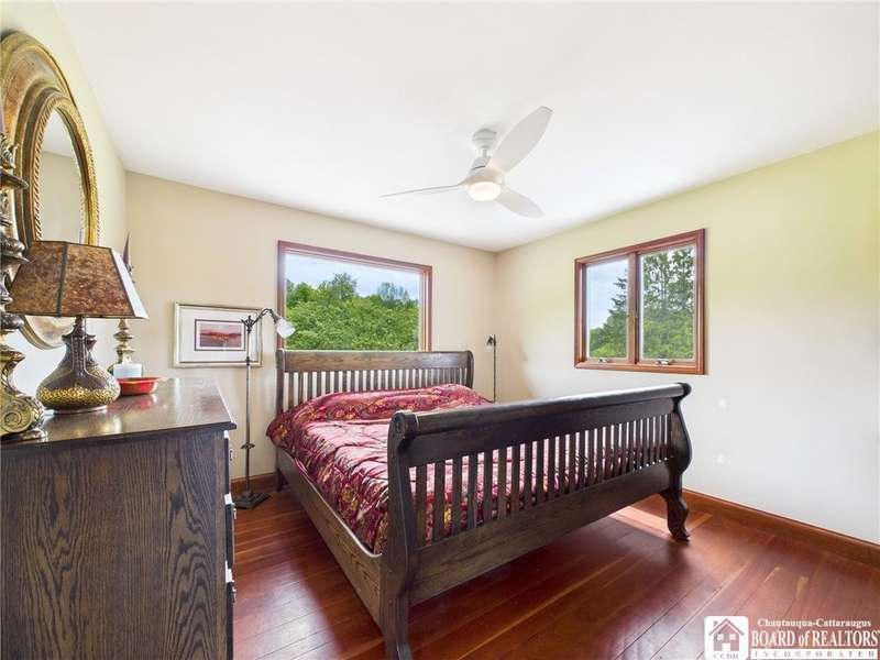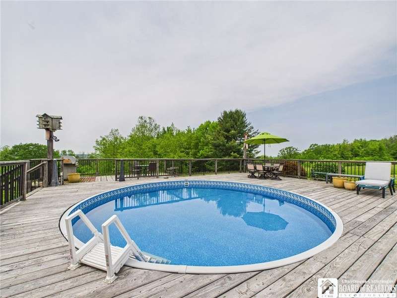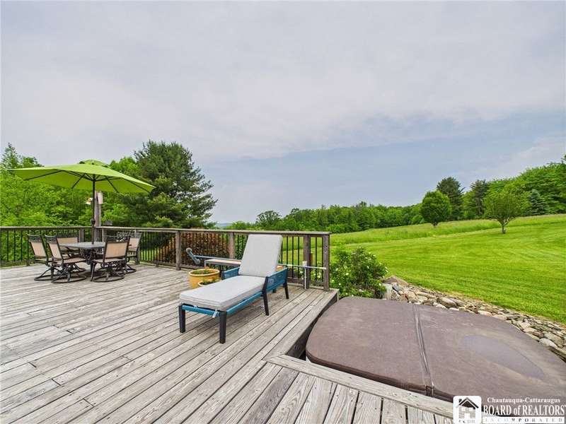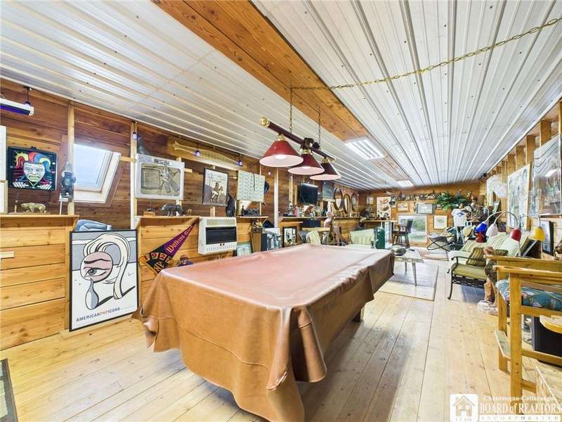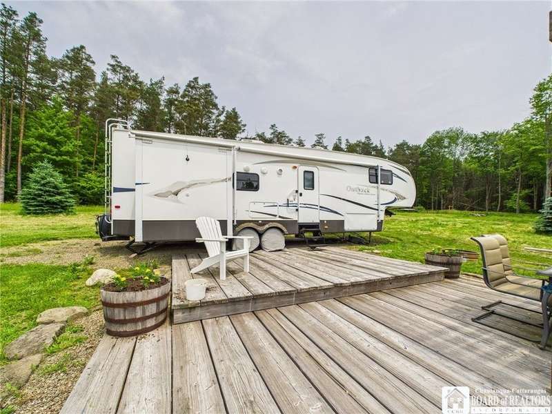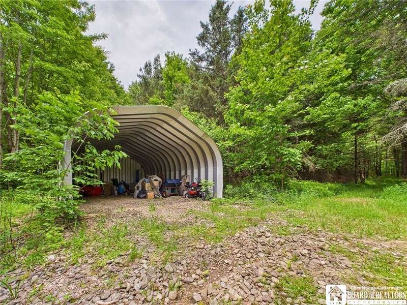 Discover a rare gem just minutes from Ellicottville?77 acres of private, picturesque country living with unbeatable outdoor access. This one-of-a-kind ranch-style property shares its border with the 832-acre Raecher Hill State Forest, offering limitless possibilities for hiking, wildlife watching, and exploring right from your backyard. The main home features two spacious bedrooms and two full bathrooms, with grand cathedral ceilings, hardwood and natural stone floors, a beautifully updated bathroom, and breathtaking views of Holiday Valley that stretch for miles. The basement features heated electric floors, a wood stove, another full bath and even a sauna. With approximately 2,200 square feet of living space?not including the barn or guest apartment?there's room to relax, entertain, and enjoy life in every season. It is about ten minutes from Holiday Valley and bustling downtown Ellicottville. Two private pond enhances the serene setting, creating the perfect spot to unwind. The barn-style garage is a standout feature, offering an upstairs private bar room for entertaining, and a fully appointed garage apartment with heated floors, a private bathroom, and its own cozy living space?ideal for guests or short-term rentals. A second outbuilding provides ample space for storing a tractor, outdoor equipment, or anything else you can dream up. As a bonus, the property also includes a well-maintained camper, perfect for temporary stays, visiting guests, or even your secluded weekend hideaway. The camper has solar panels and water to make it even more convenient. Whether you're seeking a private retreat, a base for adventure, or a flexible property with room to grow, this ranch delivers it all.