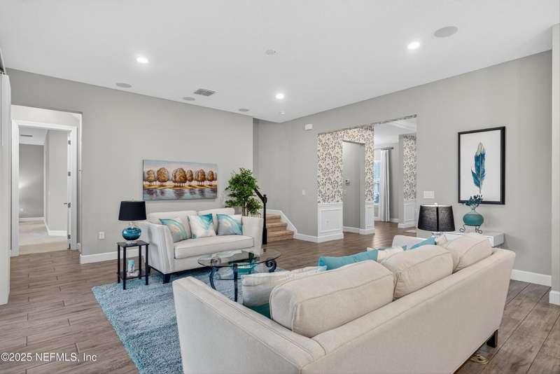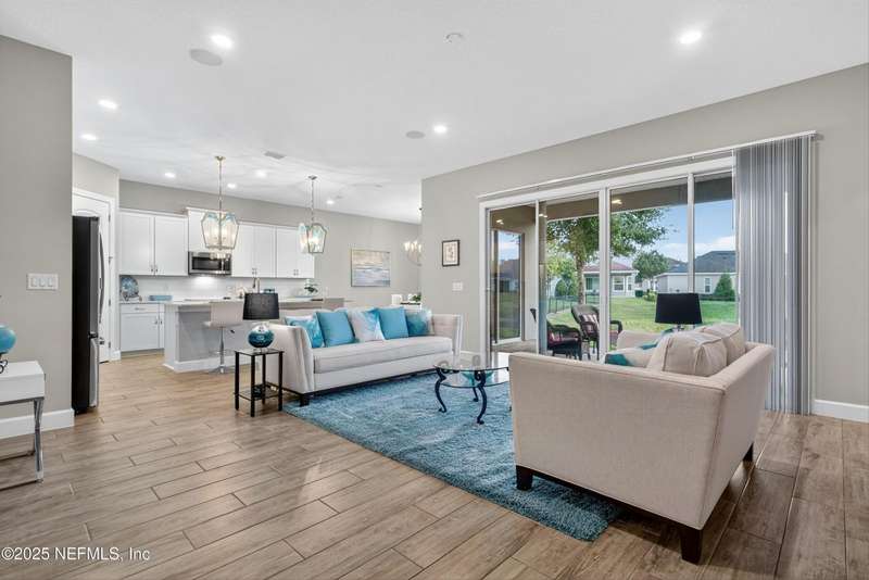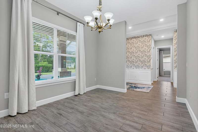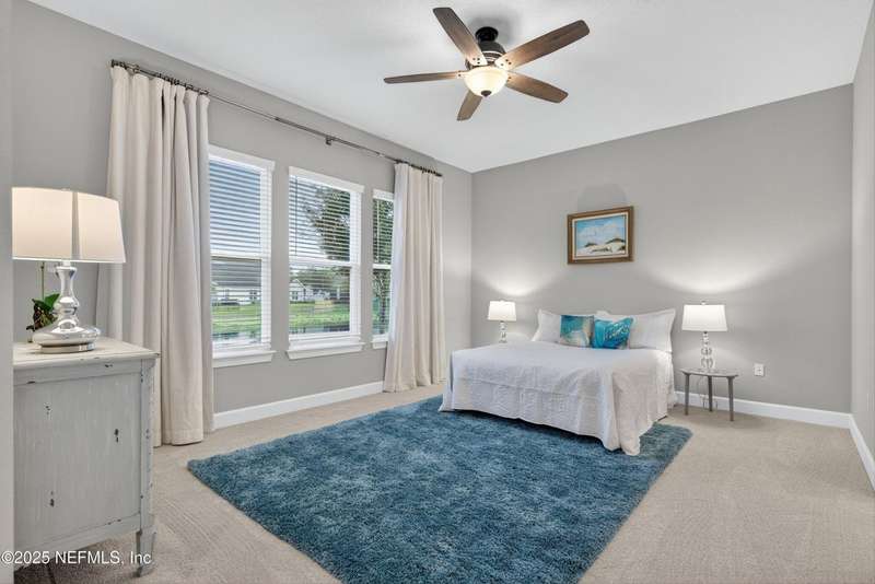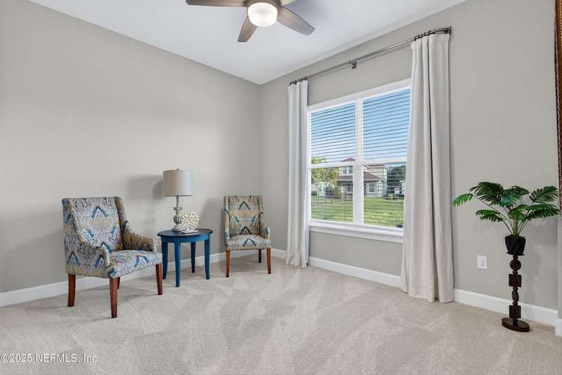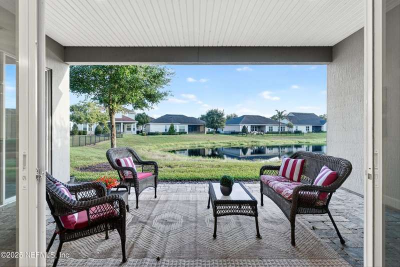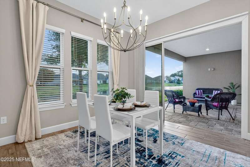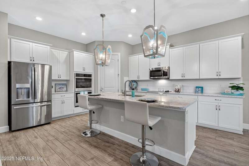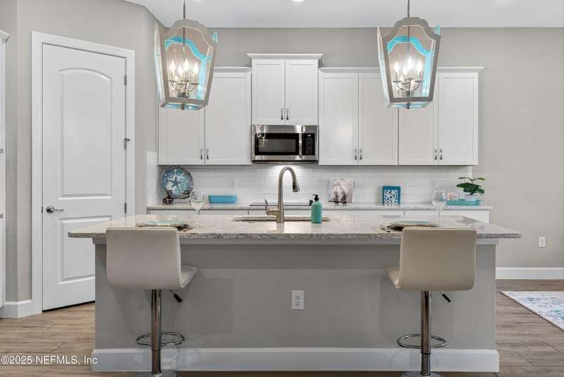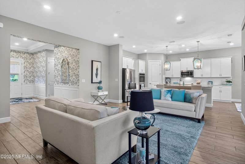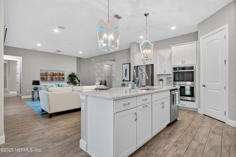 Experience exquisite living in this beautifully appointed 3-bedroom, 3.5-bathroom home with a versatile second level flex space. Perfectly situated in a secure gated community, this home has peaceful water views from the covered patio and blends comfort, sophistication along with low-maintenance living. Step inside through an elegant foyer accented with custom designed wallpaper, where a formal dining room offers the perfect setting for entertaining. At the heart of the home, the gourmet kitchen is a chef's dream-featuring soft-close cabinetry, gleaming quartz countertops, a double oven, and an expansive island illuminated by designer pendant lighting. A casual dining nook with its own statement fixture provides an inviting space for everyday meals. The open-concept living area radiates warmth and style, enhanced by abundant widows providing natural light. Off the garage hallway and foyer, a spacious stop-and-drop zone adds everyday convenience and versatility,