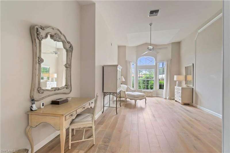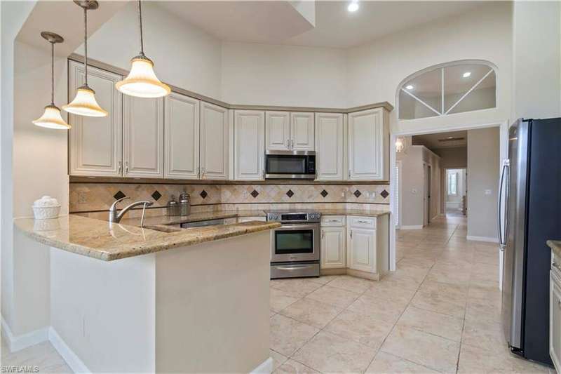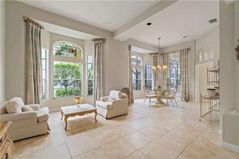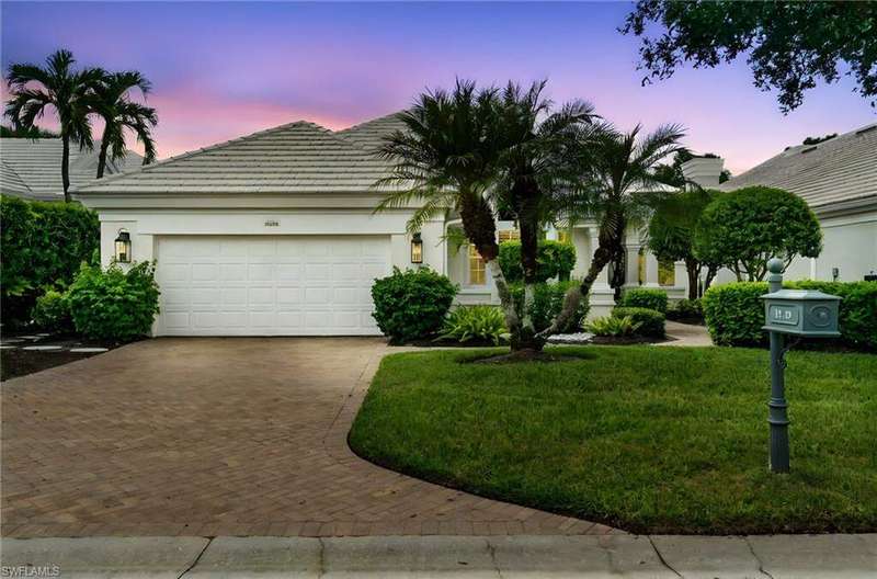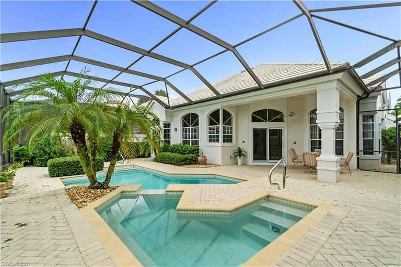 Beautifully maintained home with spectacular golf course & water views offered in North Naples' coveted "Audubon Golf & Country Club!" Enjoy highly sought-after Southwest exposure-perfect for soaking in breathtaking sunsets. This light and bright home has soaring ceilings, wood and tile flooring, a convenient wet bar. The expansive outdoor living area is an entertainer's dream, featuring a pool and spa, generous lounging space, and uninterrupted views of the lush golf course and Lake. Inside, the spacious kitchen offers granite countertops, stainless steel appliances, and a convenient breakfast bar for casual dining. Located in the Devon Green subdivision, the HOA services include landscaping, front lawn water irrigation, house painting and biannual roof cleaning for effortless maintenance. "Audubon Country Club" is perfectly located 5-min from Mercato & SWFL's world-class beaches, with gated/guarded entry, an 18-hole championship Golf Course, tennis, pickleball, Bayside boardwalk, fabulous fitness facilities, clubhouse with dining & 2nd spectacular poolside club/cafe.