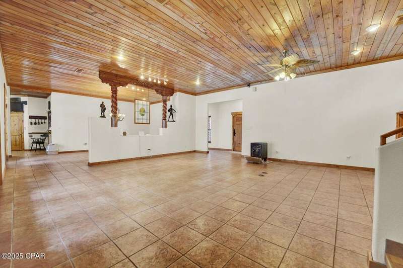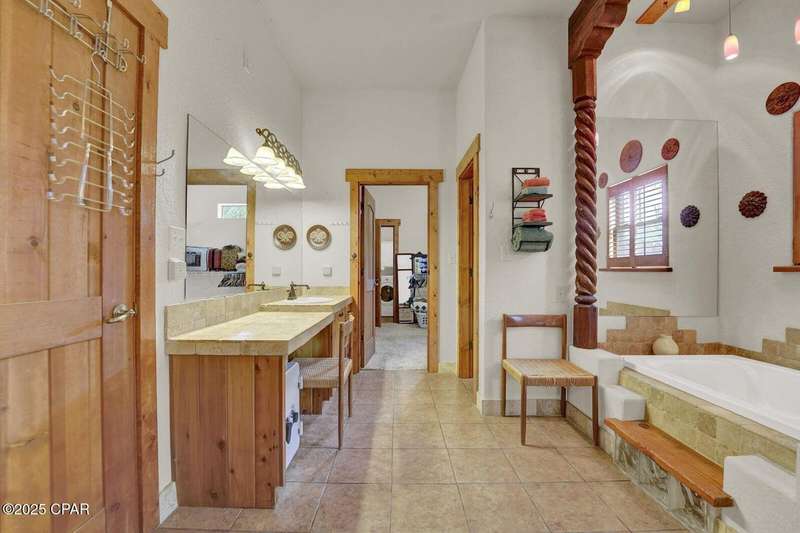 Nestled in the highly sought-after Mack Bayou area of Santa Rosa Beach, this exquisite Spanish Hacienda-inspired estate offers a rare blend of architectural charm, expansive living, and refined indoor-outdoor entertaining - all just minutes from 30A and Grand Boulevard with their vibrant mix of upscale dining, shopping, and coastal lifestyle experiences. Situated on a private road, this thoughtfully designed residence welcomes you through a gated courtyard adorned with a striking double-tiered fountain, setting the tone for the serene elegance found throughout. The home's flowing layout includes a spacious main residence and a private guest wing, ideal for multi-generational living or hosting in style. The main house boasts a grand living room anchored by afireplace and custom built-ins, seamlessly connecting to the formal dining area and an oversized chef's kitchen complete with island, breakfast nook, pass-through windows to the lanai, and abundant storage. Soaring glass doors open onto a luxurious screened lanai featuring a pool, spa, and multiple patio spaces perfect for alfresco gatherings.The expansive master suite is a private retreat with a fireplace, two separate access points to the lanai, a spa-inspired bath with soaking tub and walk-in shower, dual vanities, and a massive walk-in closet. A main-level guest bedroom with private entry and a full bath adds to the home's versatile layout. Upstairs, a charming study-library overlooks the pool and patio area and features floor-to-ceiling bookshelves, a private screened porch, full bath, and generous closet easily convertible into an additional guest suite. The separate guest quarters wing includes its own kitchen, living room with wood-burning fireplace, full bath, laundry, and a private rear courtyard, making it ideal for extended stays or independent living. Additional features include a two-car garage, a detached pool/garden and storage building. This incredible home features a Stone-Coated Metal roof, offering the aesthetic charm of traditional shingles with the exceptional durability of metal. Known for its strength and resilience, this premium roofing system typically lasts 40 to 70+ years, far outperforming traditional roofing!This elegant residence offers timeless design and comfort with convenient access to the best of 30A and Grand Boulevard. Buyer to verify all dimensions.