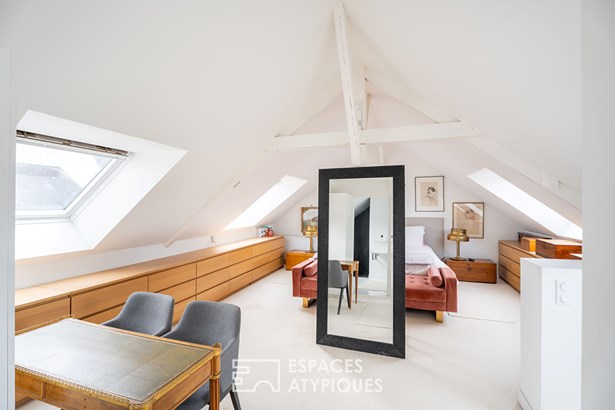 At the back of the plot, an outbuilding adds further potential to this property. It includes two storage rooms on the ground floor, and a studio upstairs: a bedroom, a living room with kitchenette and a bathroom, perfect for a professional project, a liberal activity or to welcome guests.