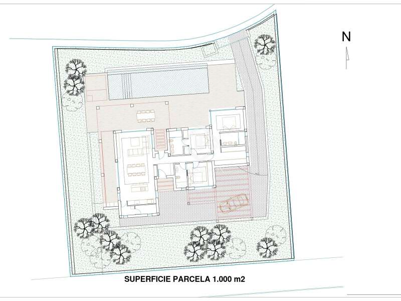 The villa features architecture with rounded corners and an aged white facade, enhanced with hand-cut dry stones. It offers a refined interior design, with microcement used in the bathrooms and throughout the interior flooring, complemented by oxidized colour double-glazed aluminium windows. The bedrooms are equipped with external electric shutters, and the bathrooms boast black fixtures, adding a modern and elegant touch. The villa includes a large open-plan living-dining room leading to a fully equipped kitchen, providing direct access to the outdoor infinity pool and its sunny west-facing terraces. It also has an adjacent laundry room and a guest toilet. The sleeping area consists of two double bedrooms sharing a bathroom, and the master bedroom with an en-suite bathroom and a dressing room. The house will be equipped with underfloor heating and ducted air conditioning. It will have two parking spaces under a carport. Outside, the 42 m2 infinity pool, featuring a shallow part called a beach, is perfect for relaxing and enjoying the sun. It is surrounded by a total of 200 m2 of terrace, including a covered part under a beautiful pergola, ideal for year-round family dinners and enjoying the mild and sunny weather that Javea offers. The villa boasts breath-taking views of the surrounding green mountains, the valley, and the Montgó Mountain, a symbol of Javea.