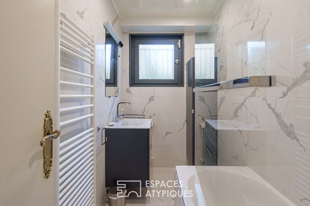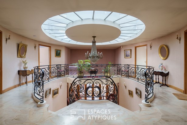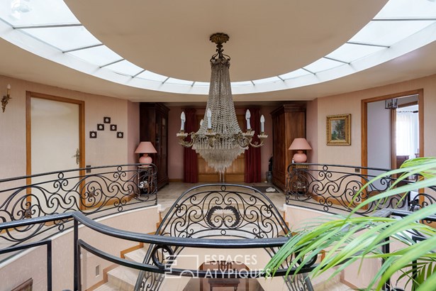 Once through the front door, the unique character of the property is revealed. The entrance hall features an impressive central staircase overlooked by a curved glass roof that floods the whole property with natural light. This level includes a garage for two vehicles, an office ideal for teleworking, a large bedroom, a shower room and a child's bedroom.