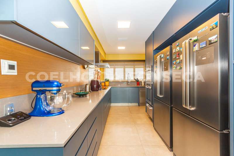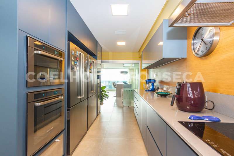 Cozinha Gourmet: Equipada com bancada em Caesarstone Oyster, incluindo uma cuba esculpida.