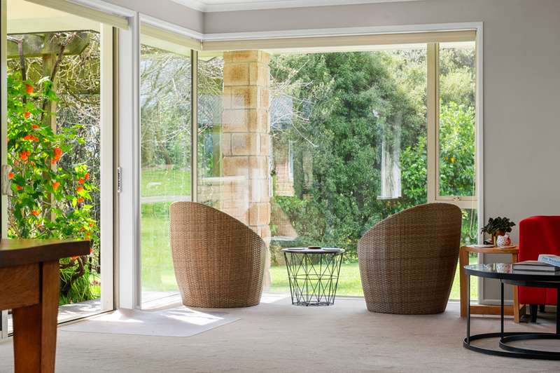 The living space steps out to a covered patio perfect for dining al-fresco and a pergola area draped in a grapevine. A second living room is perfect for relaxing and can be closed off to the main hub, ideal for kids and teens.