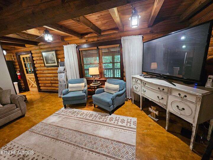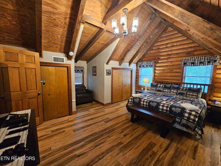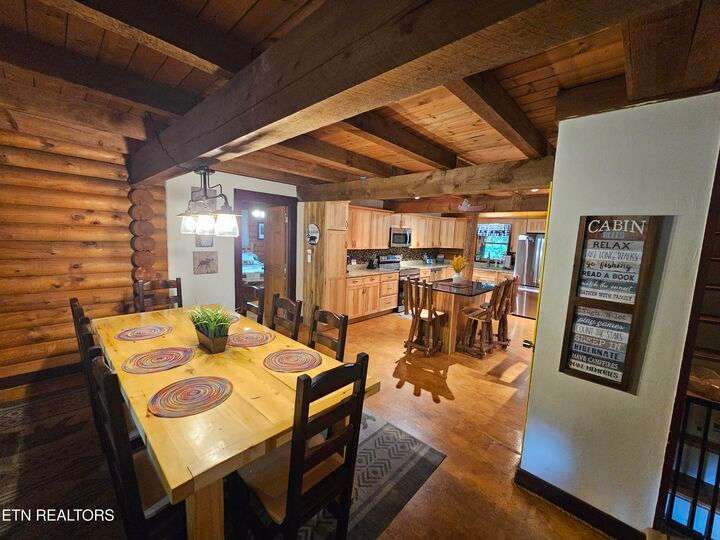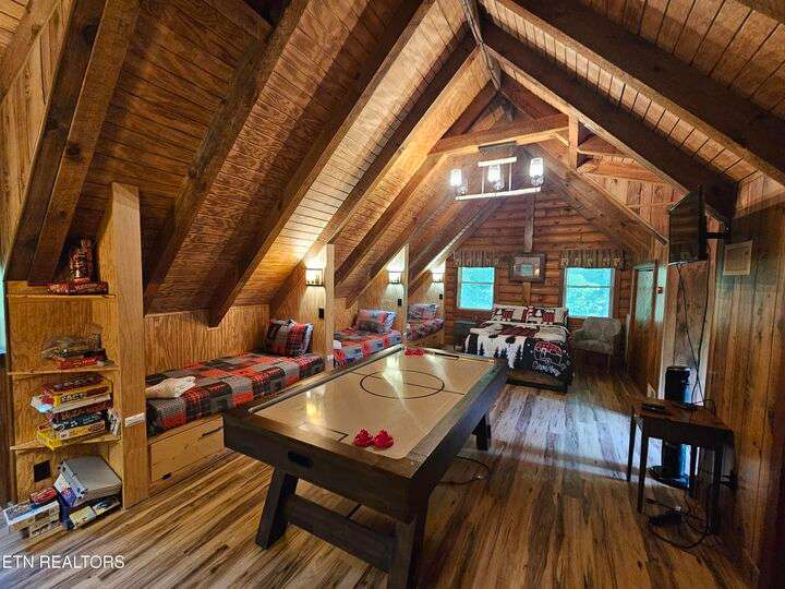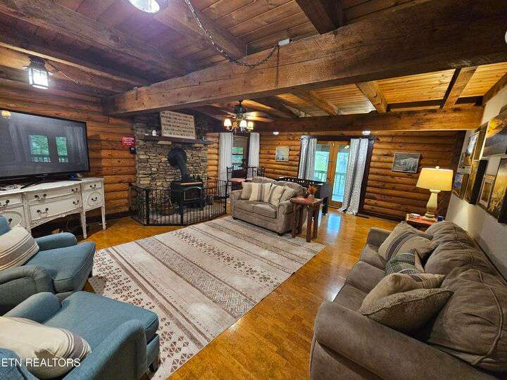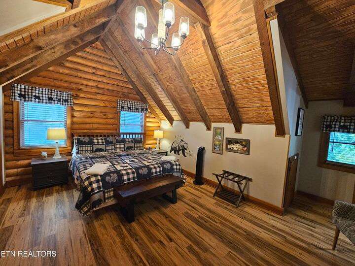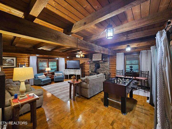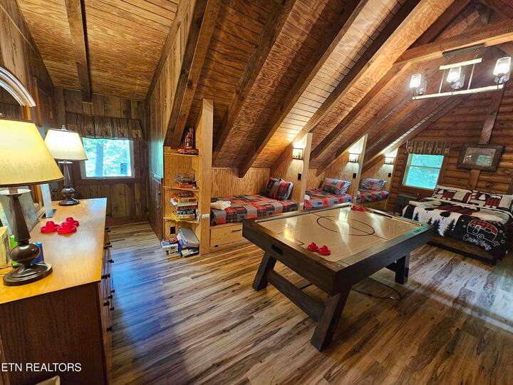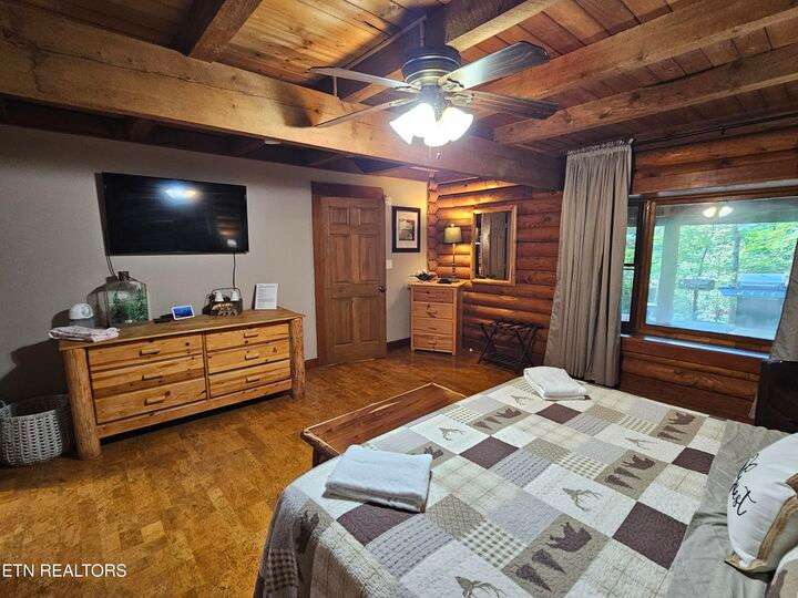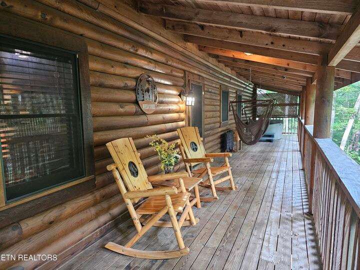 Charming 3BR/2BA Log Cabin in Gatlinburg's Arts & Crafts District - Prime Investment in the Great Smoky Mountains! Opportunity Location, charm, and income potential! This stunning 3-bedroom, 2-bath log cabin is nestled in a private setting in the highly desirable Arts & Crafts District of Gatlinburg—just minutes from downtown attractions, dining, shopping, and the Trolley stop. Step inside to discover vaulted and beamed ceilings, a warm and inviting living room with a floor-to-ceiling stacked stone hearth, and a wood-burning stove that creates the perfect mountain cabin ambiance. The fully furnished, turn-key home is ready to move in or rent immediately and is already a proven short-term rental income producer, making it a fantastic investment opportunity. The main level features a spacious primary suite with a king-size bed and an updated en-suite bath with a custom stone walk-in shower. Upstairs, you'll find all-new flooring, a modern full bath, and two additional generously sized bedrooms. The extra-large second bedroom includes another king-size bed, while the oversized bonus area is perfect for groups, offering built-in bunk beds (3 twins), a queen bed, Air Hockey, and Foosball—comfortably accommodating up to 9 guests. The kitchen is fully equipped with stainless steel appliances, granite countertops, a breakfast bar, and a cozy eat-in dining area—ideal for entertaining. Enjoy the great outdoors on the expansive wrap-around covered porch, complete with rocking chairs, porch swings, hammocks, a hot tub, and a high-top table and chairs—plus a stone patio with grill space for evenings under the stars. Additional features include: Smart Home technology with Google integration & Nest thermostat system. -Walking distance to Trolley stop and local restaurants -Close to downtown Gatlinburg, the Parkway, and Dollywood -Sleeps up to 9 comfortably Strong past rental history with impressive ROI potential Don't miss this rare opportunity to own a beautiful, income-generating cabin in one of Gatlinburg's most popular and walkable locations. Whether you're seeking a personal mountain retreat, a vacation rental, or an investment property—this cabin checks all the boxes!