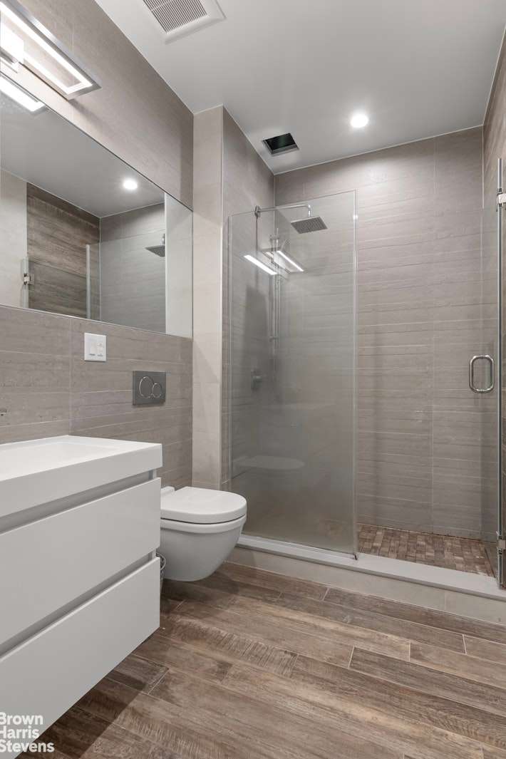 The bathroom includes a custom floating vanity: beautifully tiled shower walls and polished chrome finishes. This modern home comes finished with 7.5" manufactured oak-wood floors, 10" ceilings, recessed lighting throughout, ductless Mitsubishi Central AC/heating systems, and a washer/dryer..