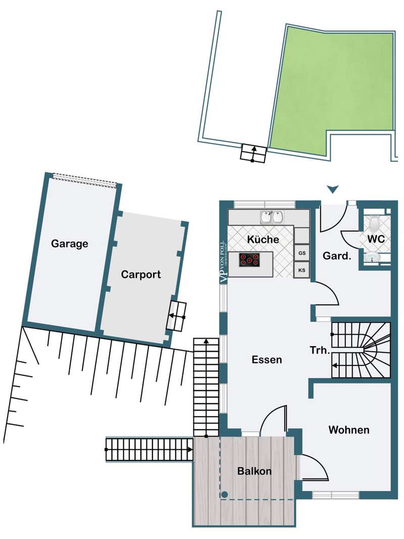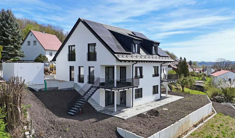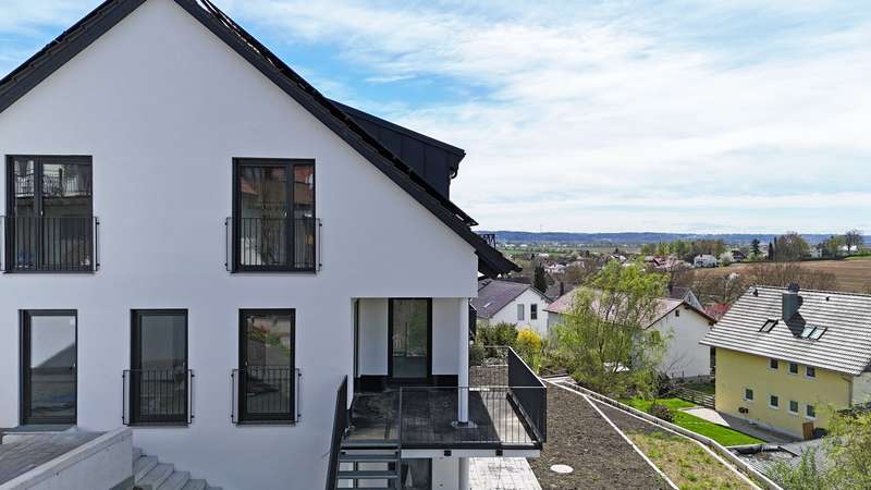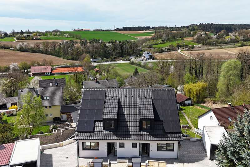 This modern, solidly built semi-detached house with a well thought-out room layout and separate granny apartment is being built in a sought-after elevated location in Mirskofen - a real highlight for discerning buyers who value quality, energy efficiency and design freedom. With approx. 175 m² of living space spread over three floors, the house offers five spacious rooms, including four bedrooms, two modern daylight bathrooms and a separate guest WC. The open-plan design in the living/dining area impresses with plenty of light, a well thought-out floor plan and direct access to the sunny outdoor areas. Floor-to-ceiling windows, high-quality parquet flooring and energy-efficient underfloor heating with an air/water heat pump create a modern living atmosphere at a high level. Particularly noteworthy is the option to select furnishing elements such as floor coverings, tiles, fittings or sanitary objects according to your own taste - a rare opportunity to actively help shape a high-quality new-build project. The property also boasts a spacious garage, an additional carport and a paved forecourt with a pleasant driveway. The terraced garden is ideally south-facing and offers sun all day long - perfect for relaxing, playing or gardening. Balconies and terraces extend the living space outdoors and emphasize the exclusive location on a 521 m² plot. The solid construction, triple-glazed plastic windows, a KfW-EH-40 standard and high-quality technical equipment round off the offer. An ideal home for families, multi-generational living or for buyers who would like an additional granny apartment with its own access. Interior photos will follow shortly - the property is currently being finished inside with top-quality smooth plaster. The big advantage: you now have the opportunity to actively help shape the final interior fittings.