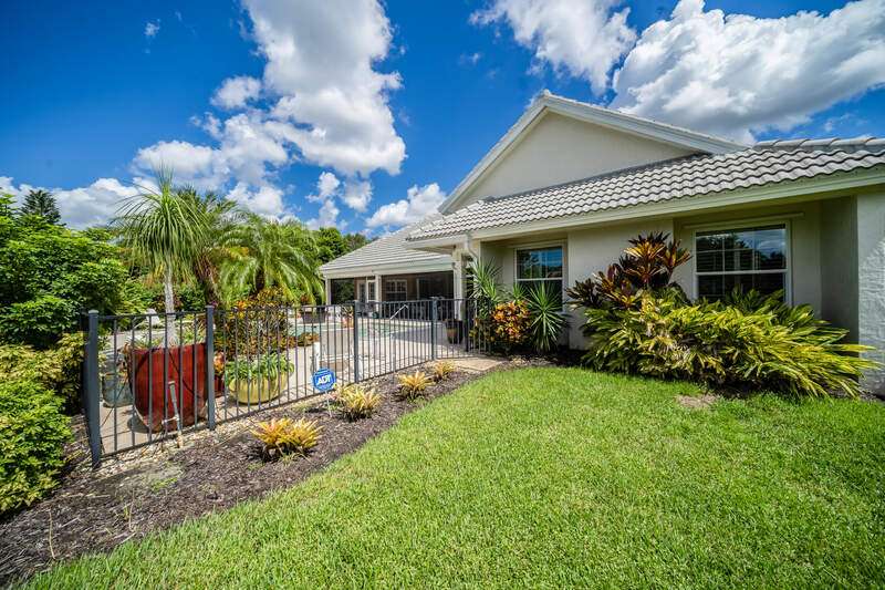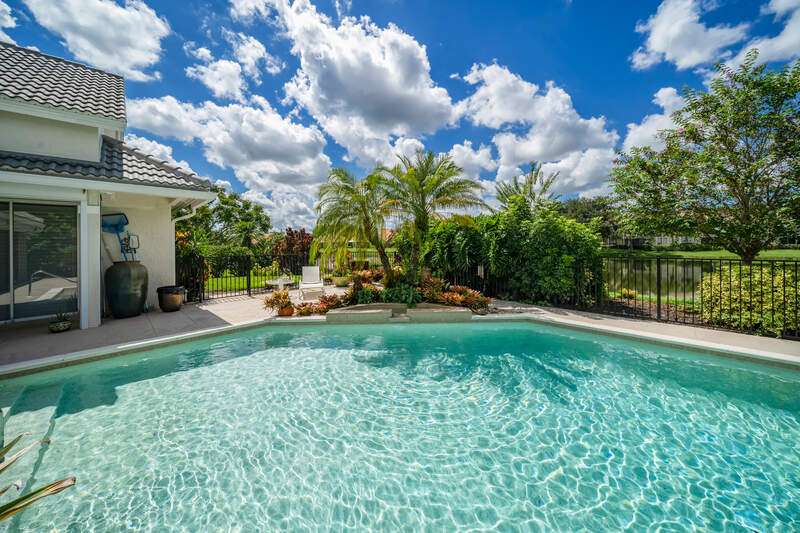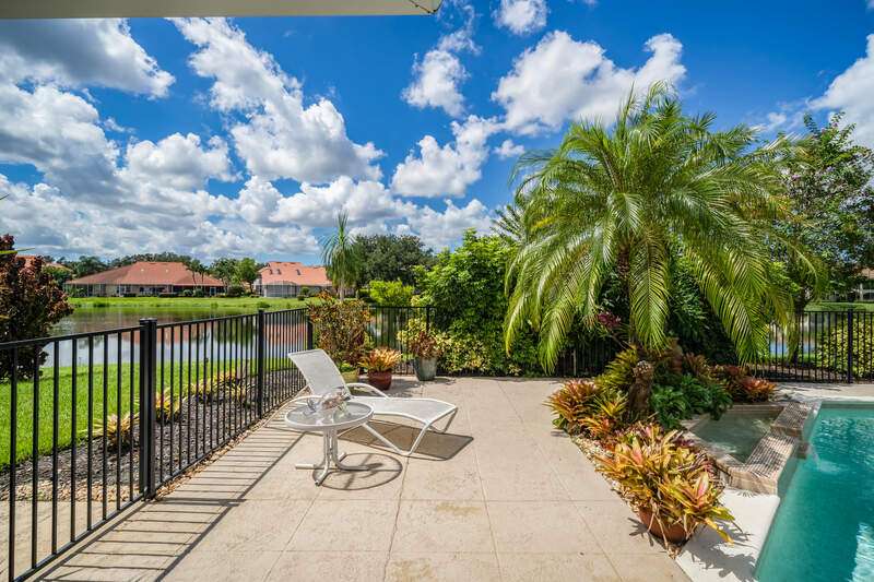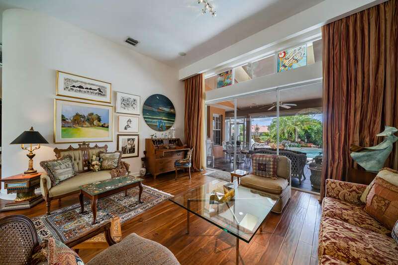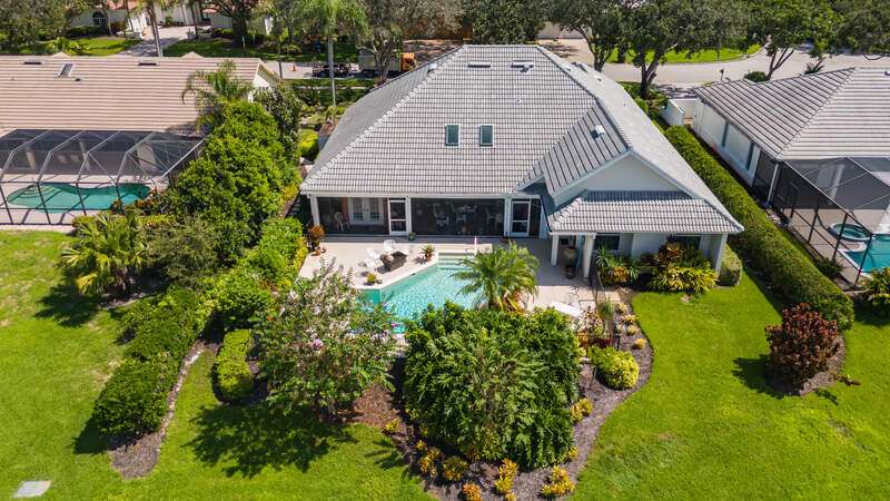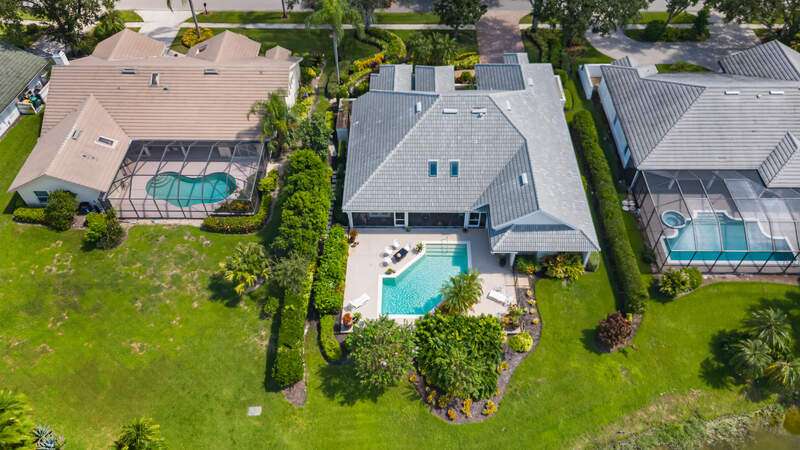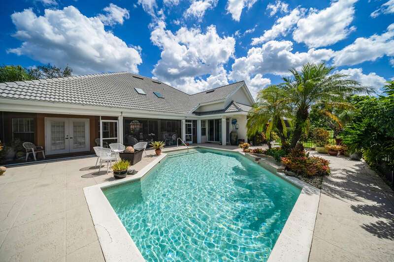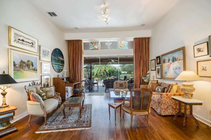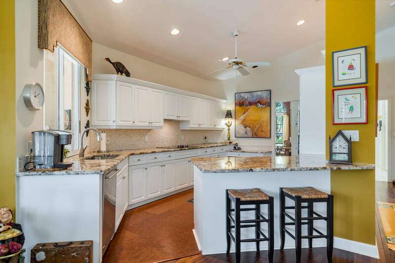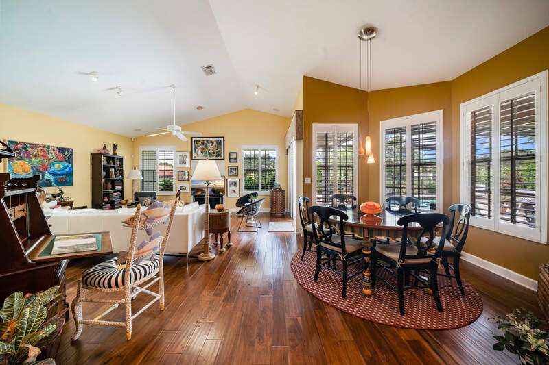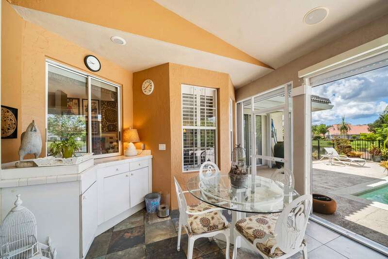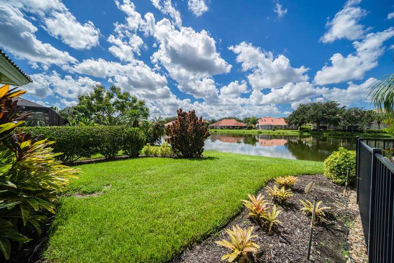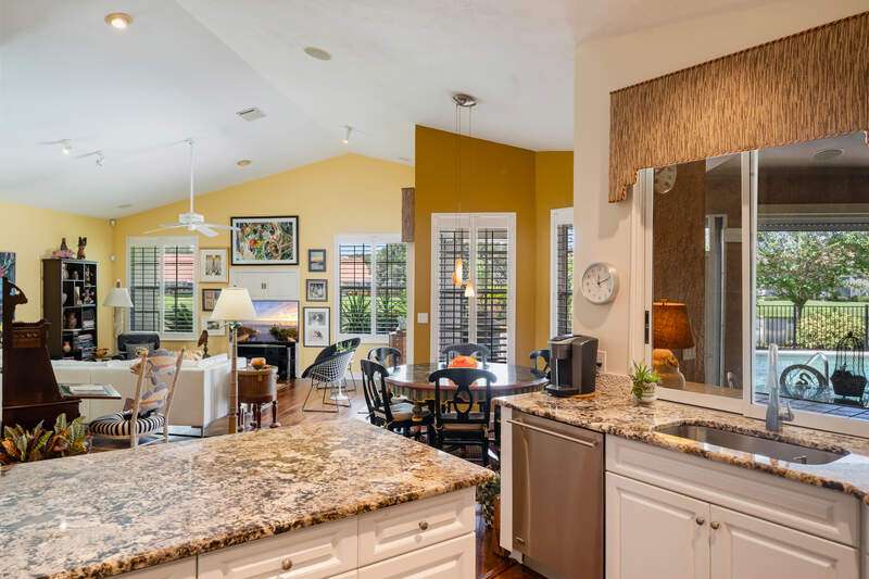 This beautifully maintained home in the Vineyards offers timeless style and easy Florida living on a southwest-facing lakefront lot with lush landscaping, great curb appeal, and a brand-new roof completed in 2023. A double-door entry with glass accents and a palladian window opens to soaring 12' ceilings, hardwood floors through the main living areas include: living room, dining room, family room, breakfast nook and hallways. Sunny and brightly lit home sparkles with natural light. The formal dining room shows off decorative millwork, a dramatic picture window with custom draperies, and tall ceilings, while the living room features hardwood floors, sliders that fully pocket to the lanai, and a welcoming flow. The kitchen blend's function and charm with white cabinetry, cork flooring, granite counters, stone backsplash, stainless appliances, and an oversized sink overlooking a pass-through window to the lanai. A bay-window breakfast nook with pendant lighting opens to the bright family room with plantation shutters, sliders to the lanai, and a wet bar perfect for entertaining. The owner's suite is a true retreat with its own vestibule, three closets, French door access to the pool, and a spa-inspired bath with oversized vanity, separate makeup space, floating soaking tub, walk-in seamless shower, and enclosed water closet. Two guest suites offer comfort and privacy, and a separate den with vaulted ceilings, built-ins, and a large picture window that works as a home office or optional fourth bedroom. Outdoor living is easy with an expansive covered and screened lanai featuring paver decking, recessed lighting, a ceiling fan, and electric shutters, all overlooking sparkling lake views. Additional highlights include an oversized paver driveway and walkways, a 2-car garage with attic access, and a laundry room with utility sink. With southwest exposure filling the home with light, you'll love the relaxed vibe, and while Vineyards doesn't require club membership, options are available to enjoy two 18-hole golf courses, a racquet center with 12 Har-Tru tennis courts (six lit for night play) and eight gel-cushioned pickleball courts with LED lighting, multiple dining venues, plus a world-class wellness center offering a gym, spa, barber shop, salt cave, and more.