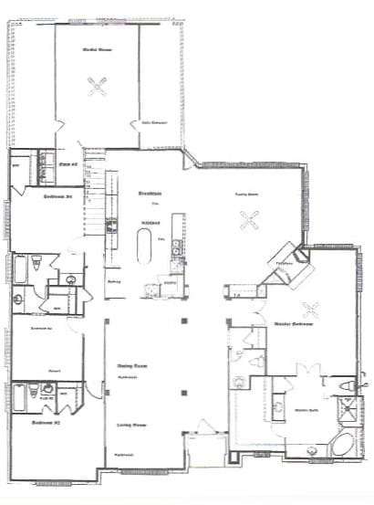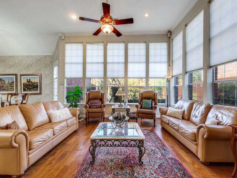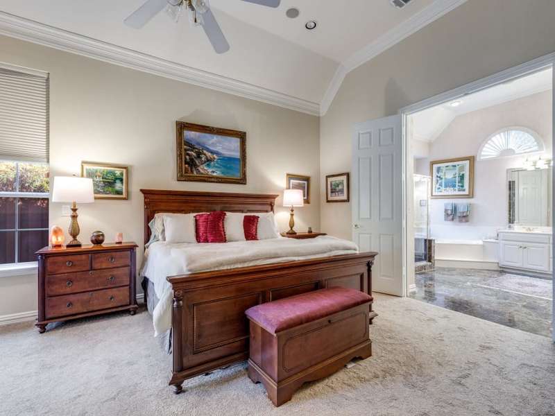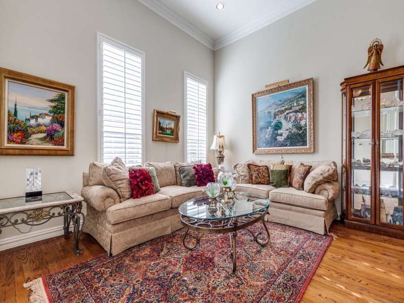 Beautiful, original owner, home in the desirable guard-gated Oak Tree enclave in Far North Dallas and one of only 5 homes in the community backing to the greenbelt. The majority of this 4 bedroom, 3 bath, 2 half bath home is on one level offering the convenience of the primary down. Generous entryway opens to combined formal living and dining with soaring 12' ceilings, crown molding and plantation shutters. Large family room affords easy entertaining with wet bar and fireplace, and is surrounded with windows letting in ample natural light with views to the pool and lush landscape beyond. Large eat-in kitchen includes stainless steel appliances with double oven and built in microwave. Utility room off the kitchen includes sink and storage and leads to a three car garage. All 4 bedrooms are down; one secondary with ensuite bath and two secondaries joined by Jack and Jill bath. Split floor plan allows privacy for spacious primary including a fireplace and large ensuite bath and walk-in closet. One bonus room upstairs provides space for more living or game room with additional half bath. Backyard oasis includes a pool, spa and outdoor kitchen with built-in grill and expansive views of the greenbelt.