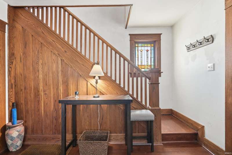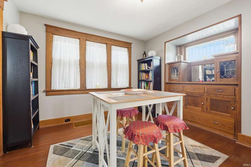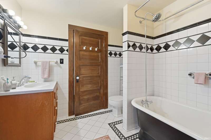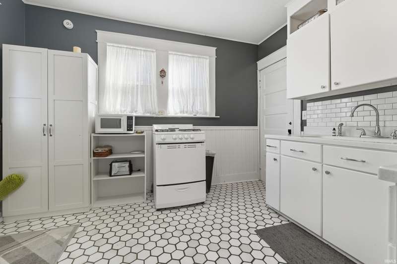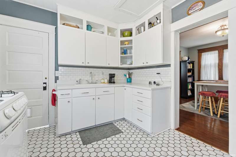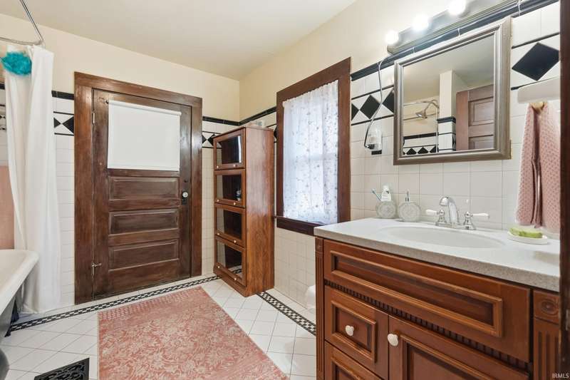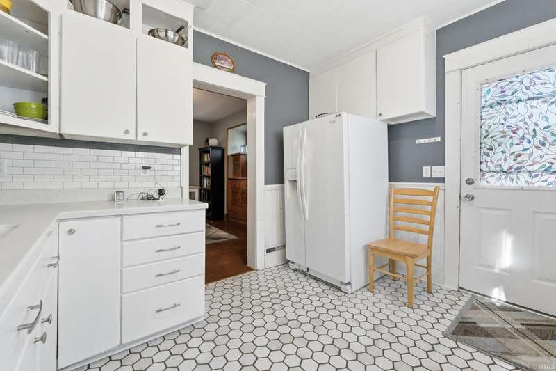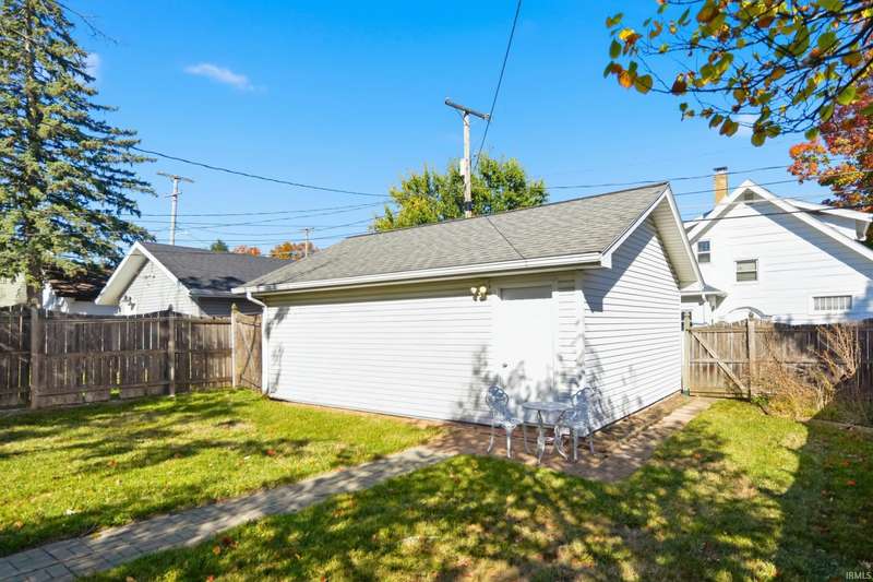 See below for a virtual tour! Welcome to this beautiful brick two-story home that perfectly blends 1920s charm with thoughtful modern updates. This 3-bedroom, 1-bath home showcases a stunning feature stained-glass window at the bottom of the stairwell, original hardwood floors, tall oak baseboards and trim, a built-in china cabinet, detailed leaded glass windows, and built-in linen storage with a gorgeous cast iron tub. The kitchen’s hexagon tile floor and the bathroom’s classic black-and-white ceramic tile remain true to the home’s vintage character. Modern updates include Corian countertops, white cabinetry, a subway tile backsplash, and updated lighting throughout. Enjoy the fully fenced backyard featuring a fire pit and paved walkway leading to the oversized two-car garage—complete with cabinetry, a workbench, and plenty of space for parking and storage. The basement also offers a workshop area with cabinetry and abundant storage. Conveniently located just minutes from downtown shopping, dining, and entertainment—don’t miss your chance to own this timeless Fort Wayne gem!