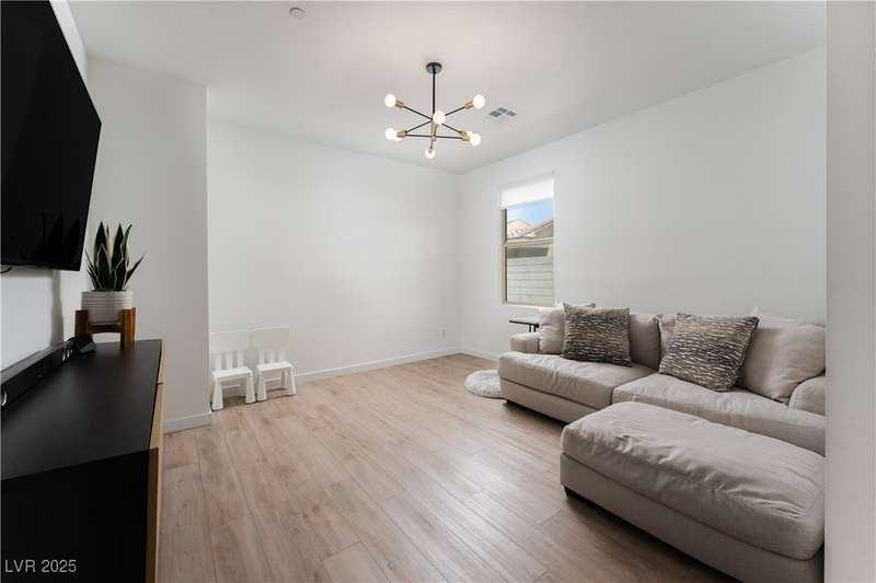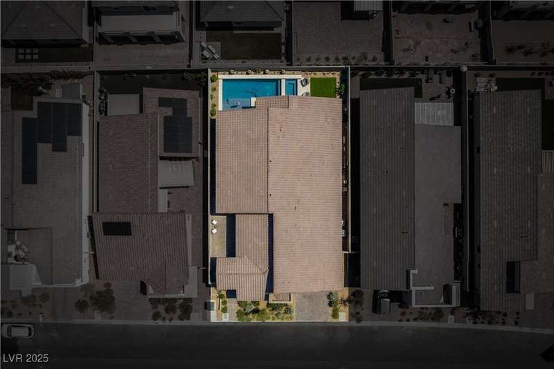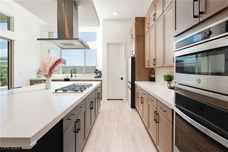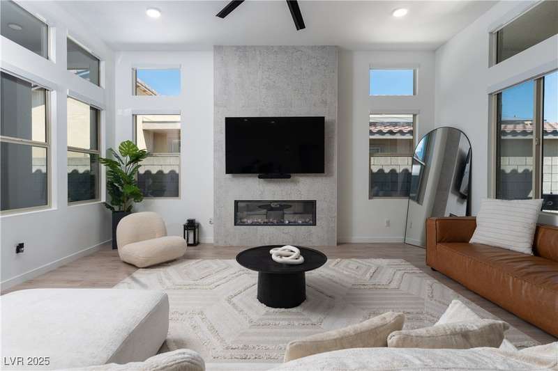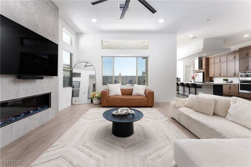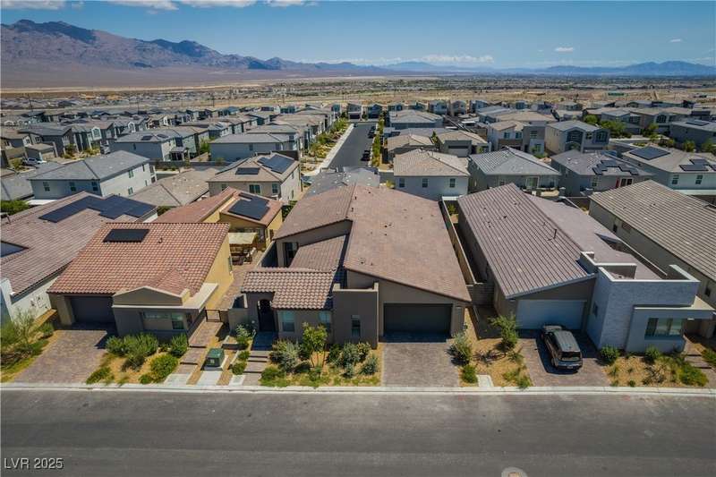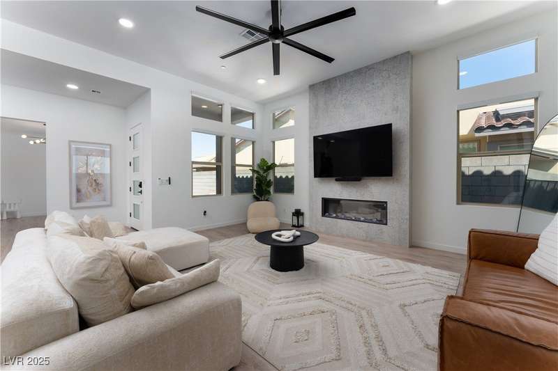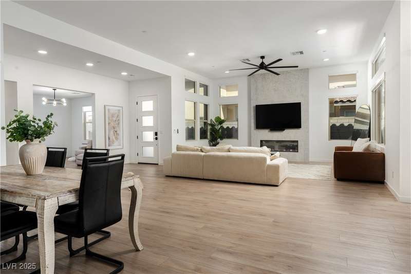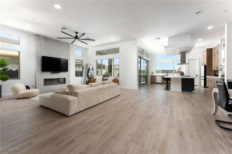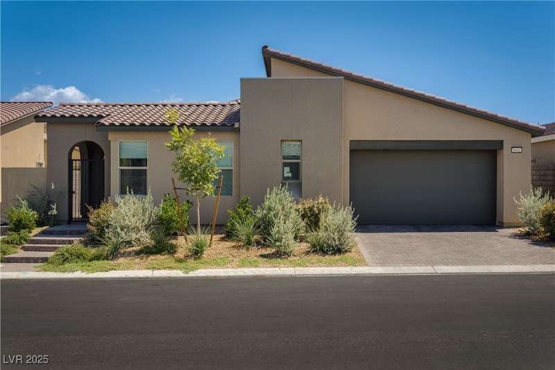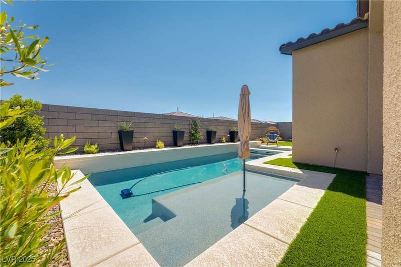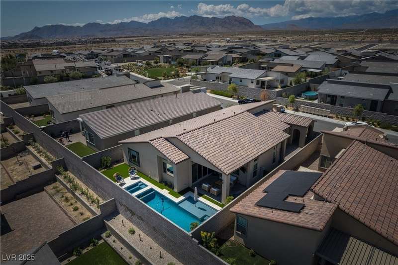 2024 Tri Pointe Home & WITH POOL! WELCOME HOME to this stunning ranch home located in Kyle Canyon, a premiere growing neighborhood in the Northwest. This home shows like a model! First the private courtyard provides an intimate gathering space and first impression. Next, the beautiful interior makes a statement with vaulted ceilings, large windows for natural light, floor-to-ceiling fireplace, and luxury vinyl plank flooring. The large gourmet kitchen features modern cabinets, island with cooktop and hood, and designer quartz countertops. The generous floorplan provides a master bedroom suite separate from the secondary bedrooms in their own wing, plus a den/office flexible space. All bathrooms are beautifully appointed. The best is yet to come with the tranquil backyard with covered outdoor living, modern pool and spa, and grass area, with a backdrop of mountain views. All this, plus Smart Home features and an EV charger for daily convenience!