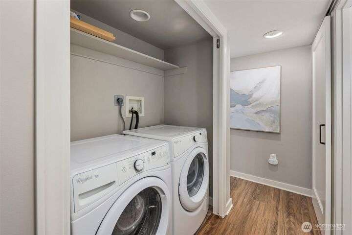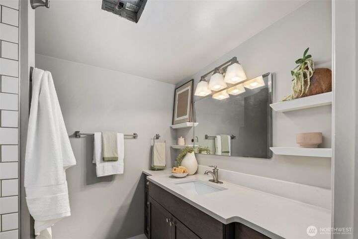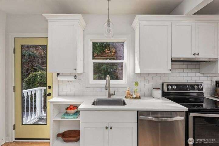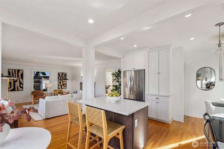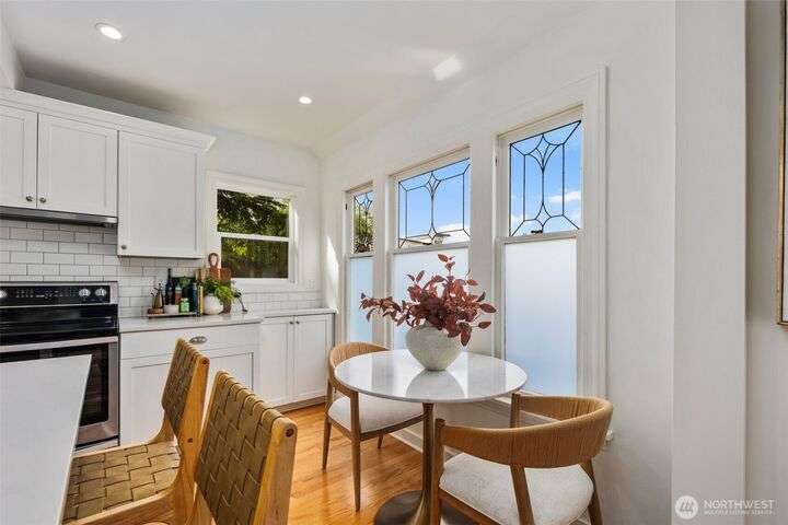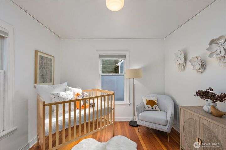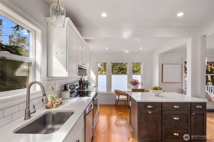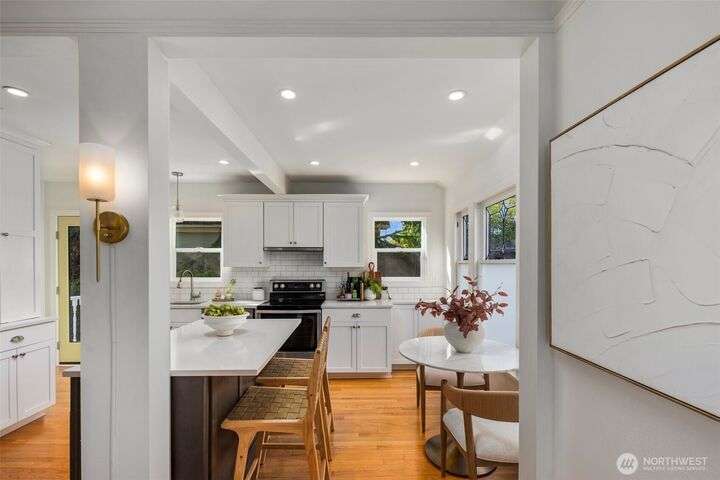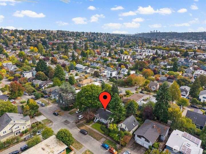 Charming 1930 Ballard bungalow blending classic character with modern updates. The main floor features 2-bedrooms, 1-bath, hardwood floors, a tiled fireplace, picture molding and leaded windows. Enjoy cooking in the remodeled open kitchen that leads to a private patio and secret garden. The fully finished basement includes a spacious family/media room with free standing fireplace, 3/4 bath, and third bedroom. Enjoy updated wiring and plumbing, plus an attached garage with epoxy flooring. The attic offers 8’ peak clearance and potential for stunning views. Perfectly located near Ballard’s shops, restaurants, and the Farmer’s Market—walk to everything you love!