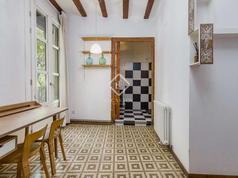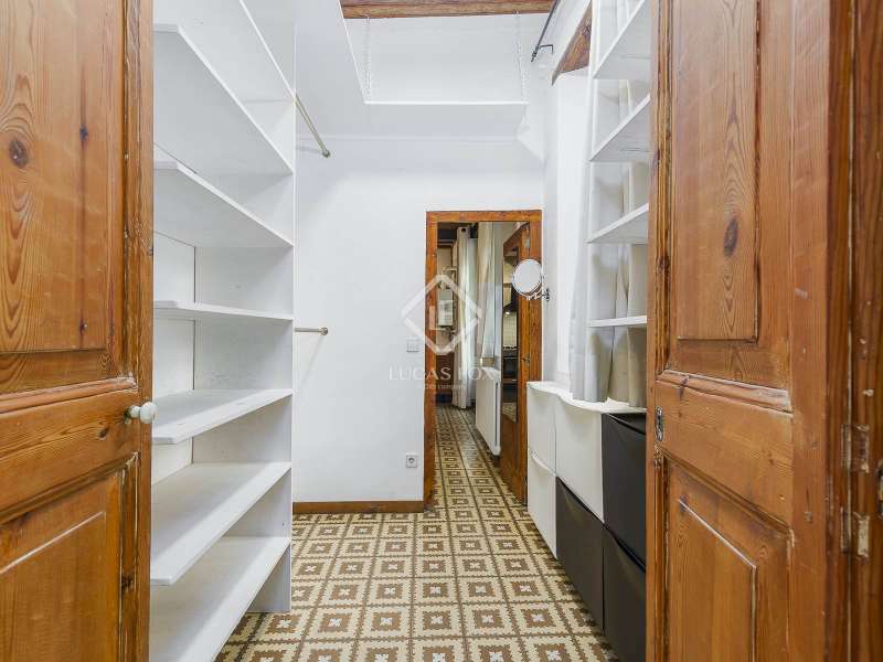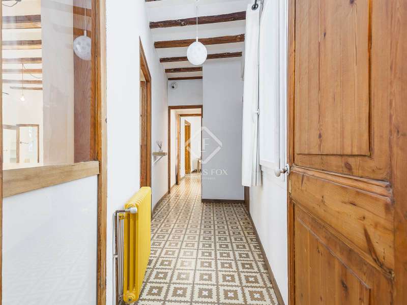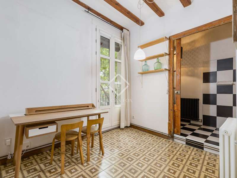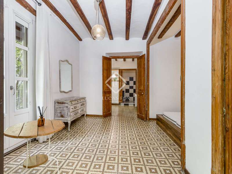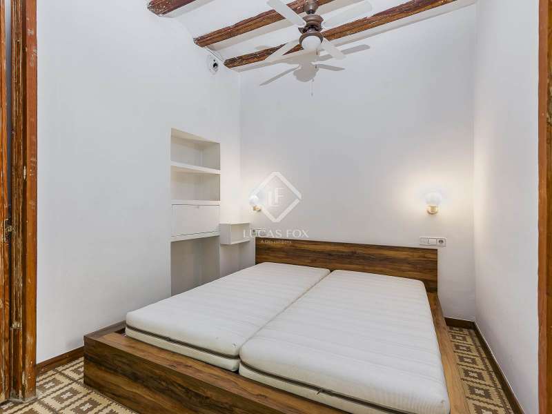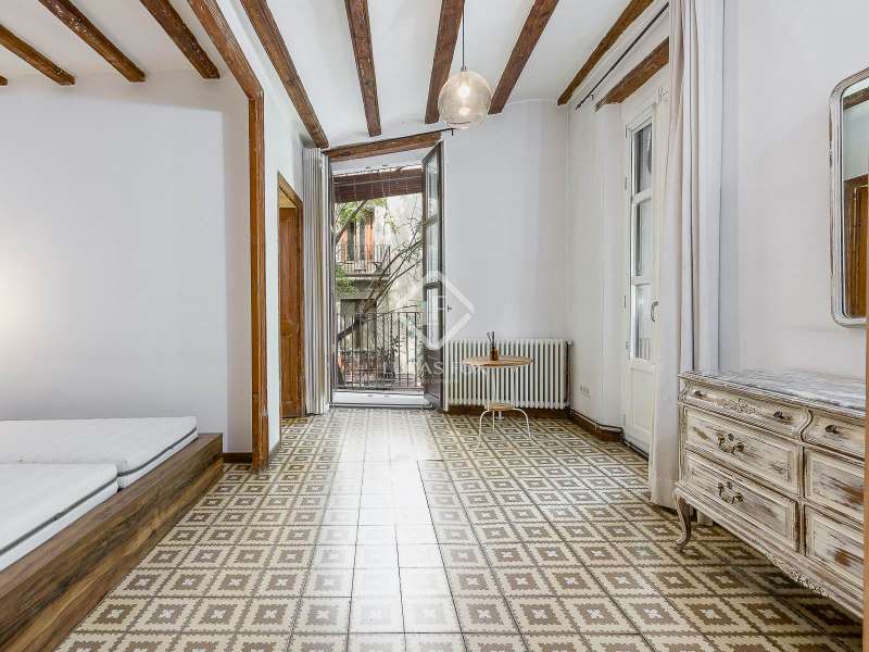 Step into a piece of Barcelona’s history with this spacious 95 m², 2-bedroom corner apartment in the heart of El Born. Brimming with character, it features original mosaic floors, elegant wooden beams, and four charming balconies that flood the home with natural light. The heart of the home is the large and cosy living and dining area with an open-plan kitchen, perfect for entertaining or relaxing in comfort. The main suite is truly exceptional, so spacious it includes three private balconies, a study area, a walk-in wardrobe, and a large bed. In the walk-in wardrobe, a mirror is installed in front of the window, creating the perfect spot for a morning routine of skincare or make-up in natural light. The bathroom is equally impressive, designed with a chic, chessboard-inspired style and a generous walk-in shower. Modern comforts blend seamlessly with historic details: ducted air conditioning, efficient gas radiator heating (6 in total), and premium appliances including a Smeg fridge/freezer and Siemens dishwasher, washer/dryer, and oven. Located on the first/second real floor, the apartment is easily accessible with comfortable stairs. While there is currently no lift, there is a possibility of one being installed in the future, although no official timeline has yet been agreed. This rare property combines authentic Barcelona charm with the conveniences of modern living, all set in one of the city’s most sought-after neighbourhoods. Please contact us for further information.