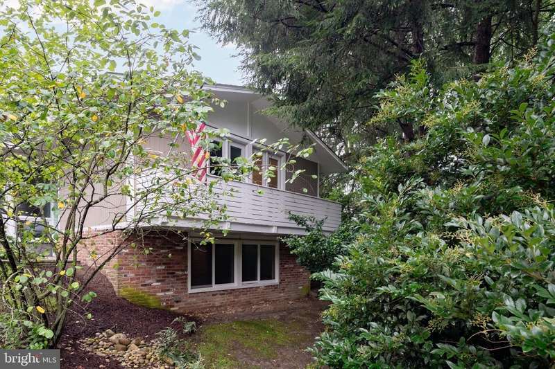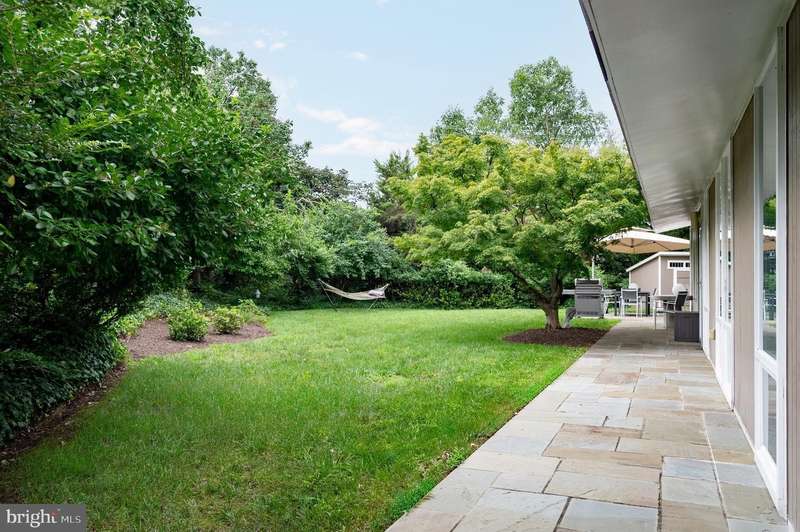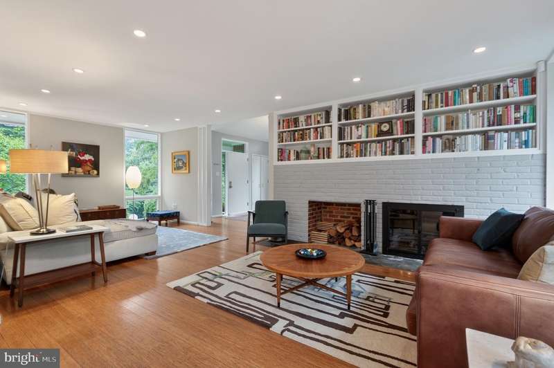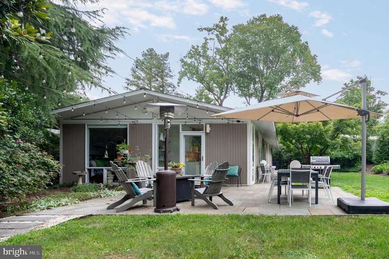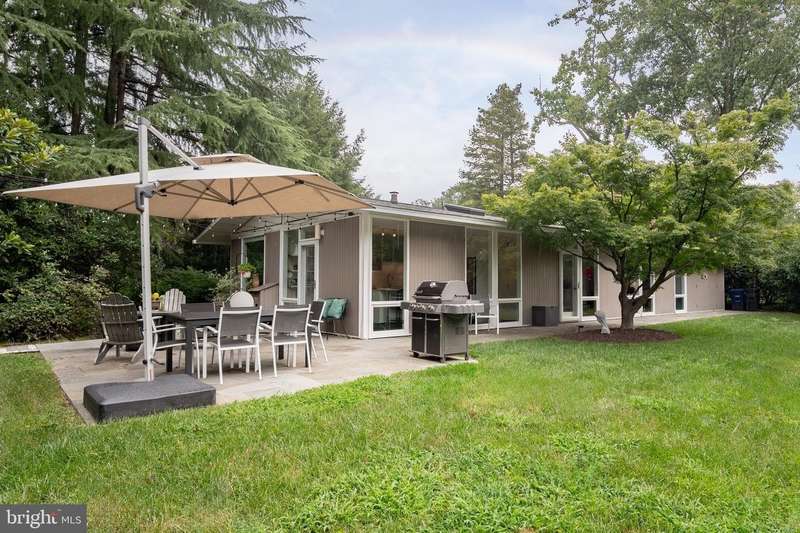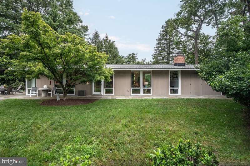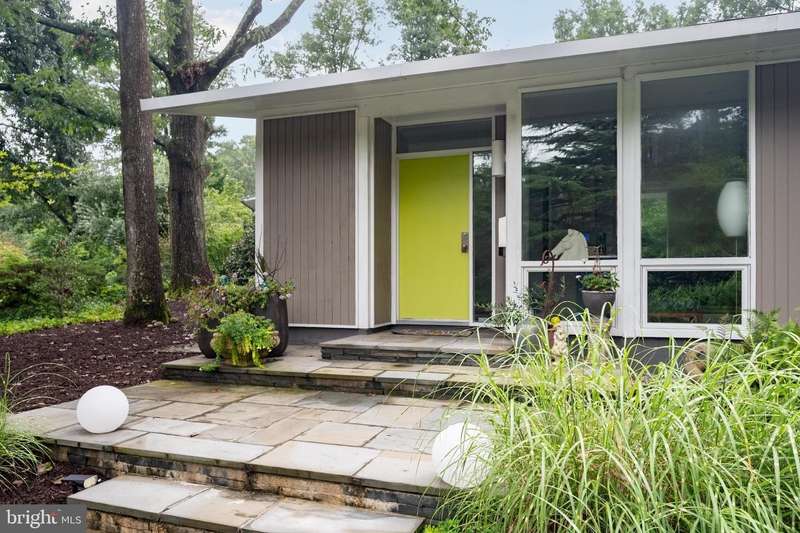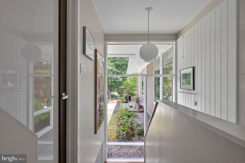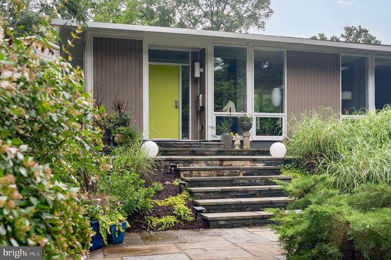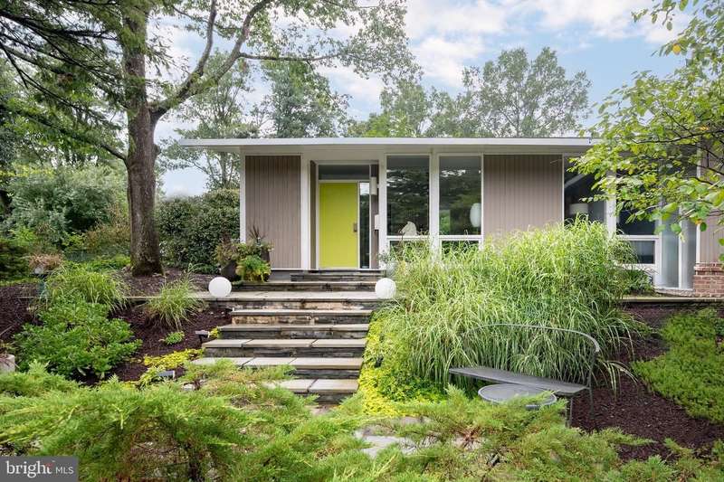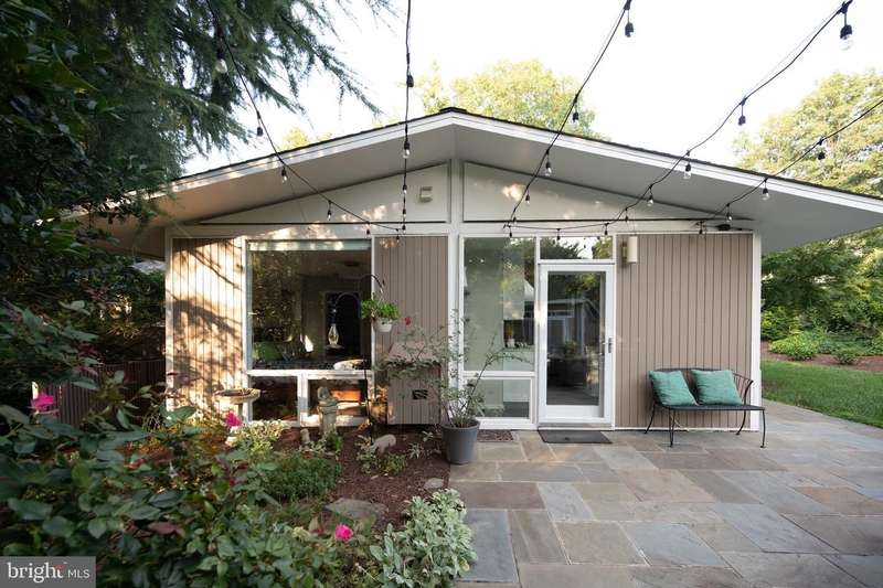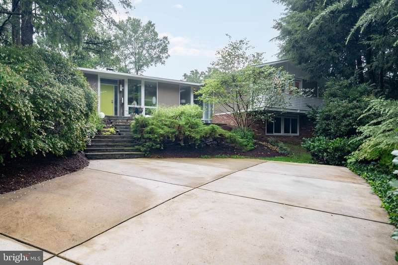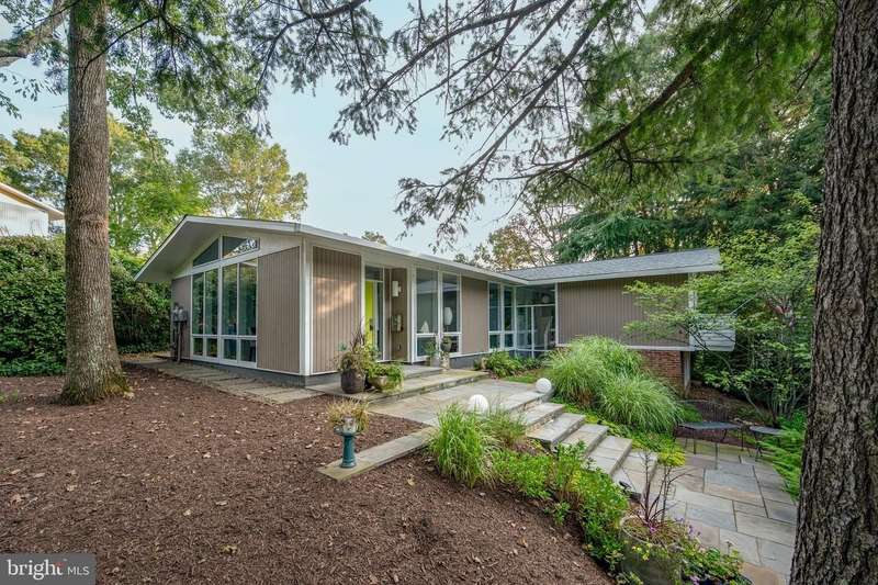 This extraordinary Mid-Century Modern home designed by Architect Charles Goodman is located in the highly sought-after Hollin Hills community. Home has been thoughtfully expanded to over 2,300 square feet with additions by renowned architects Casper Neer and Eason Cross. Extensively remodeled while preserving its iconic MCM charm, the home welcomes you with an impressive entry foyer featuring soaring ceilings, a coat closet, and a striking bubble chandelier. A private home office boasts a brick wall with built-in shelving, ideal for work or study. The open-concept living spaces include a welcoming living room and cozy family room with a wood-burning fireplace and custom built-in bookshelves, as well as a separate dining room perfect for entertaining. The custom kitchen features a large center island with seating, granite countertops, stainless steel appliances, and direct access to the patio, making it a true centerpiece of the home. The main level includes a spacious primary suite with a built-in dresser, a large custom closet, and a beautifully remodeled en-suite bathroom showcasing a walk-in shower with custom marble tile. A second main-level bedroom offers a custom closet organizer and light filled windows. There is another remodeled full bathroom, complete with a skylight. A convenient main-level laundry closet adds to the home's functionality. Upstairs, two additional bedrooms offer access to a Juliet balcony, with one bedroom featuring a walk-in closet. The large, sunlit lower-level recreation room provides additional living space, ideal for relaxing or entertaining as well as additional storage. Outdoor features include extensive hardscaping with a concrete driveway, slate patios and walkways that wrap around the home. The private, flat backyard is surrounded by mature landscaping and offers an ideal setting for outdoor gatherings. Additional storage is provided by both a detached outdoor shed and an attached exterior shed. With double-pane windows throughout and exceptional attention to detail, this home is filled with character and timeless style. Hollin Hills offers membership to 2 community pools as well as membership to a tennis and pickleball club. The scenic neighborhood boasts 7 parks, trails, an active Civic Association with seasonal celebrations, delicious super society and a friendly, close-knit environment. A commuter's dream location minutes from GW Parkway and trails, DC & the Pentagon; and south to Fort Belvoir, or north to Andrews AFB & Tysons Corner via I-495. This special address is an idyllic sanctuary to call home!