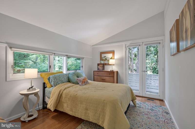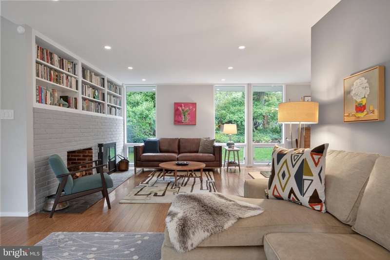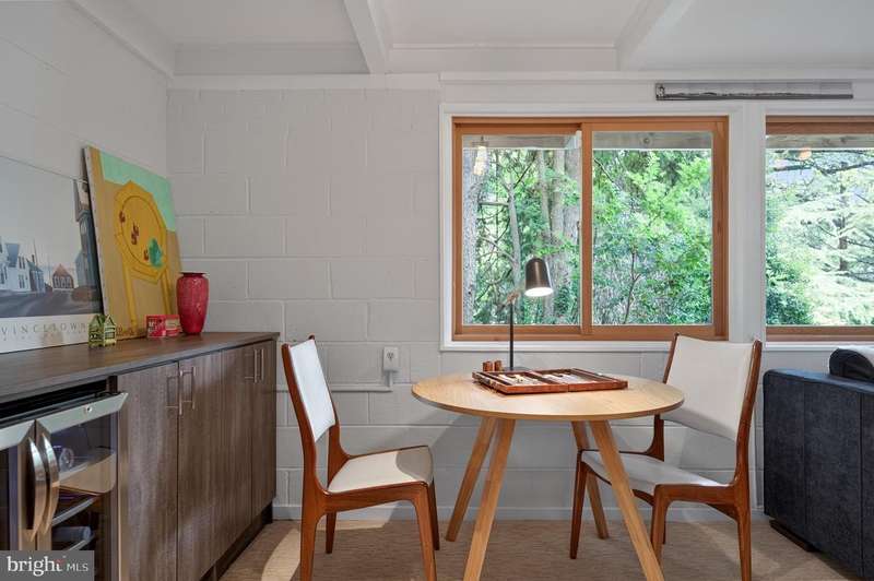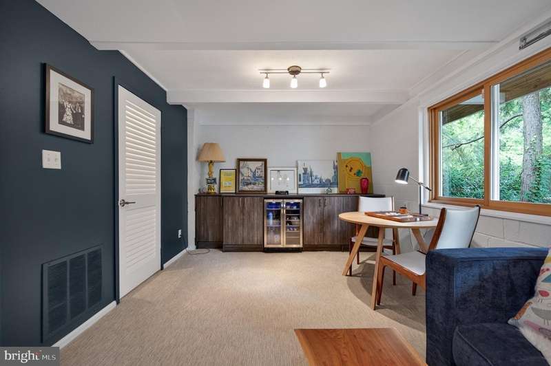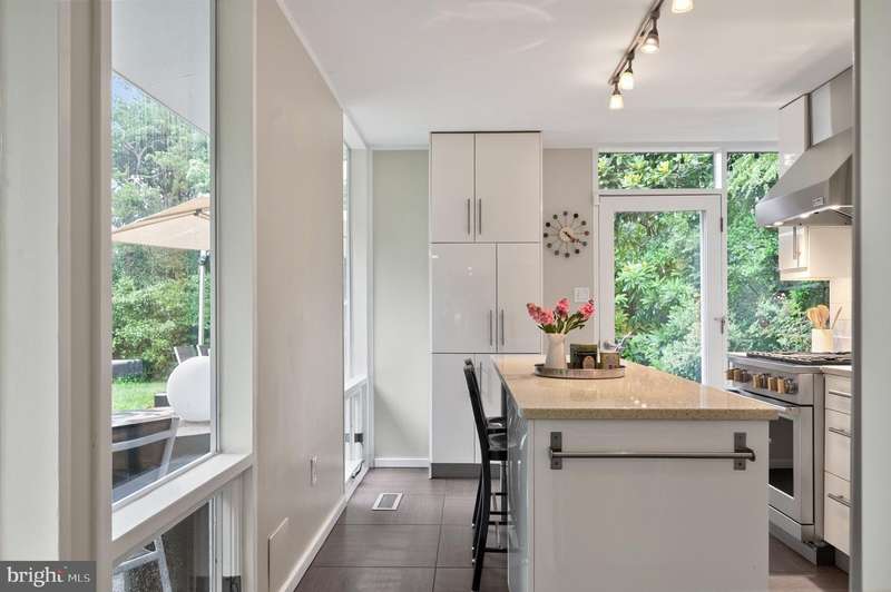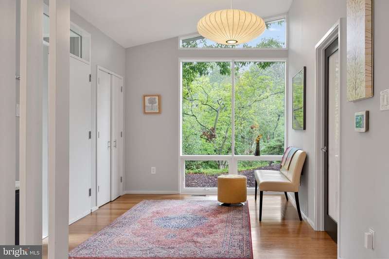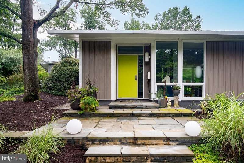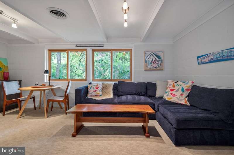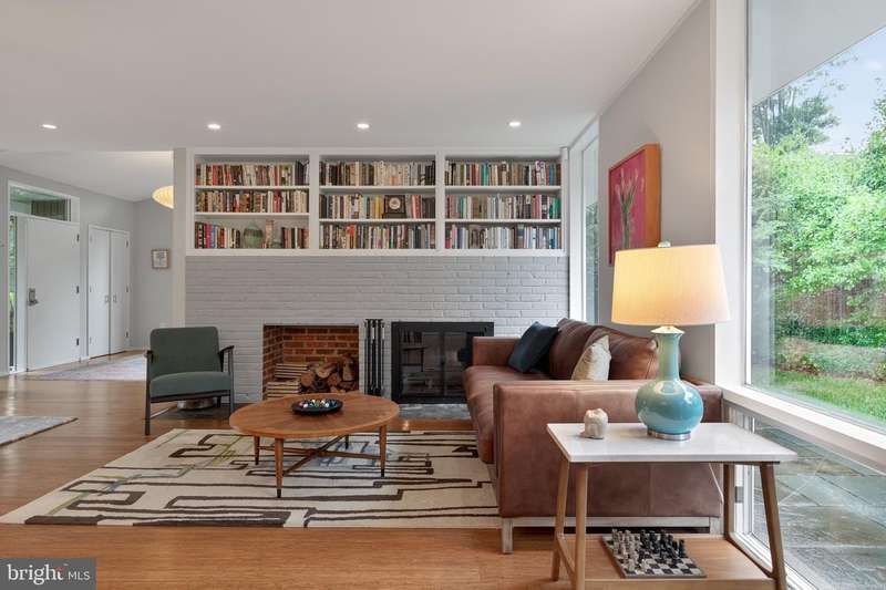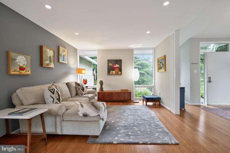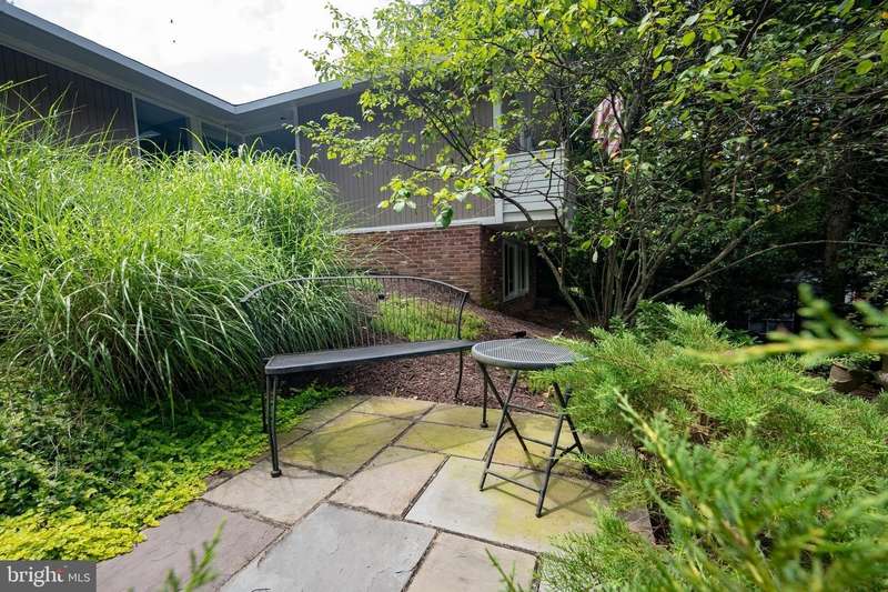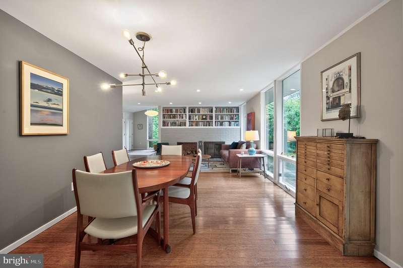 This extraordinary Mid-Century Modern home designed by Architect Charles Goodman is located in the highly sought-after Hollin Hills community. Home has been thoughtfully expanded to over 2,300 square feet with additions by renowned architects Casper Neer and Eason Cross. Extensively remodeled while preserving its iconic MCM charm, the home welcomes you with an impressive entry foyer featuring soaring ceilings, a coat closet, and a striking bubble chandelier. A private home office boasts a brick wall with built-in shelving, ideal for work or study. The open-concept living spaces include a welcoming living room and cozy family room with a wood-burning fireplace and custom built-in bookshelves, as well as a separate dining room perfect for entertaining. The custom kitchen features a large center island with seating, granite countertops, stainless steel appliances, and direct access to the patio, making it a true centerpiece of the home. The main level includes a spacious primary suite with a built-in dresser, a large custom closet, and a beautifully remodeled en-suite bathroom showcasing a walk-in shower with custom marble tile. A second main-level bedroom offers a custom closet organizer and light filled windows. There is another remodeled full bathroom, complete with a skylight. A convenient main-level laundry closet adds to the home's functionality. Upstairs, two additional bedrooms offer access to a Juliet balcony, with one bedroom featuring a walk-in closet. The large, sunlit lower-level recreation room provides additional living space, ideal for relaxing or entertaining as well as additional storage. Outdoor features include extensive hardscaping with a concrete driveway, slate patios and walkways that wrap around the home. The private, flat backyard is surrounded by mature landscaping and offers an ideal setting for outdoor gatherings. Additional storage is provided by both a detached outdoor shed and an attached exterior shed. With double-pane windows throughout and exceptional attention to detail, this home is filled with character and timeless style. Hollin Hills offers membership to 2 community pools as well as membership to a tennis and pickleball club. The scenic neighborhood boasts 7 parks, trails, an active Civic Association with seasonal celebrations, delicious super society and a friendly, close-knit environment. A commuter's dream location minutes from GW Parkway and trails, DC & the Pentagon; and south to Fort Belvoir, or north to Andrews AFB & Tysons Corner via I-495. This special address is an idyllic sanctuary to call home!