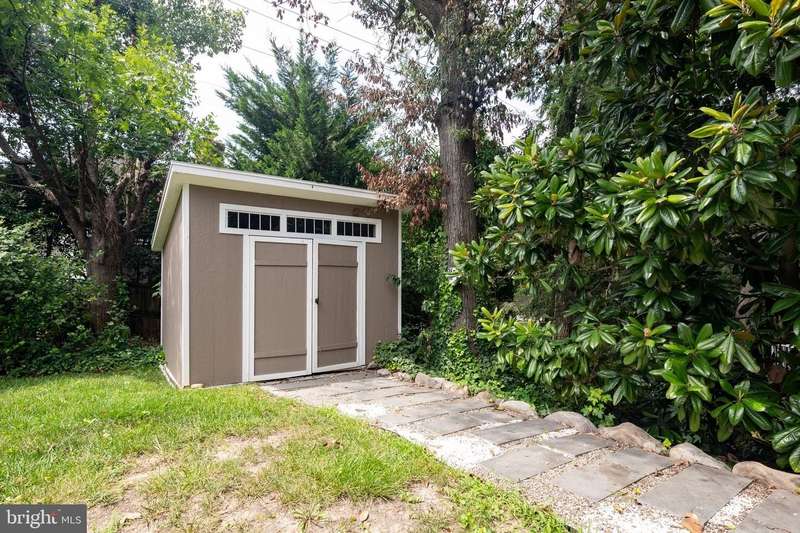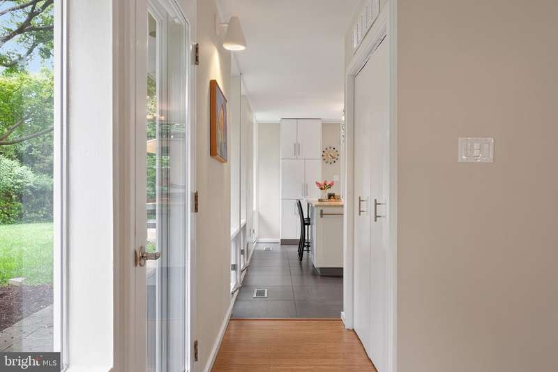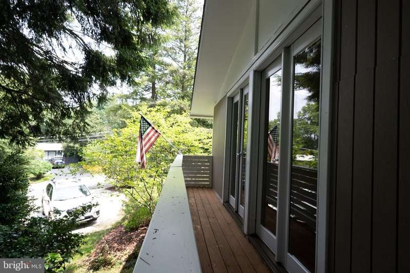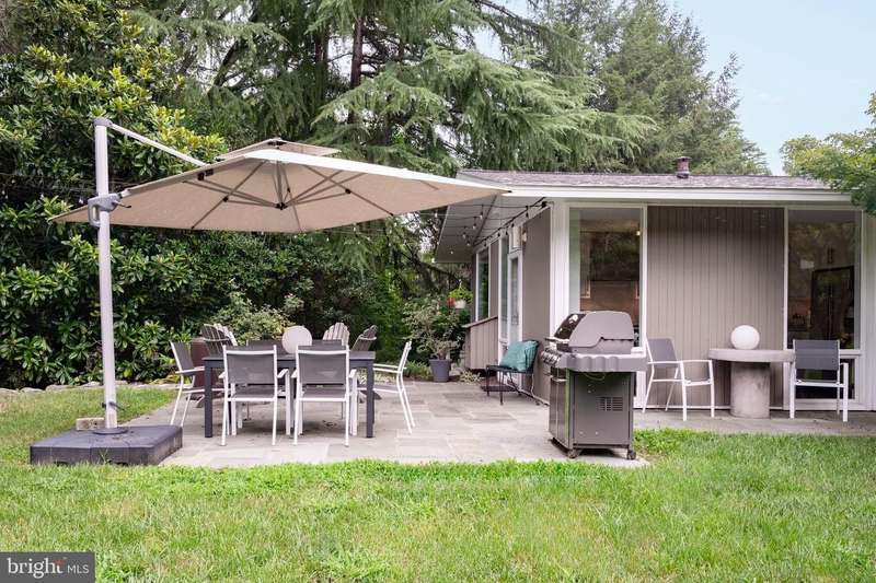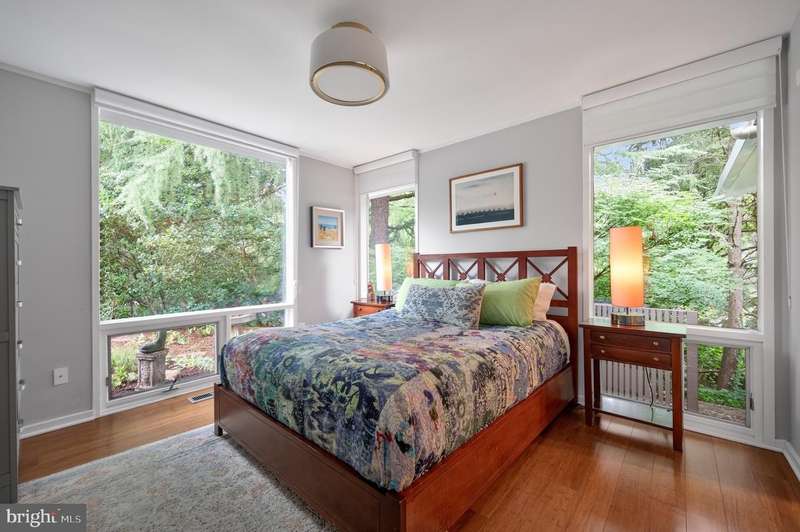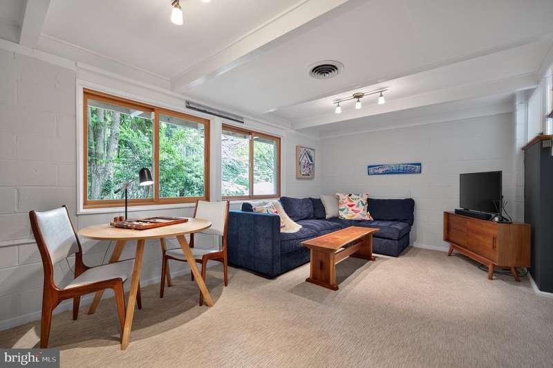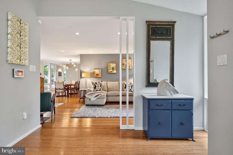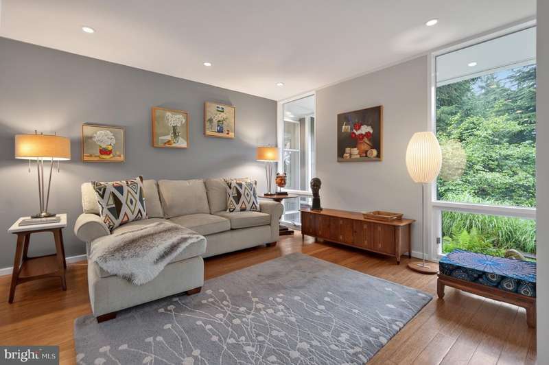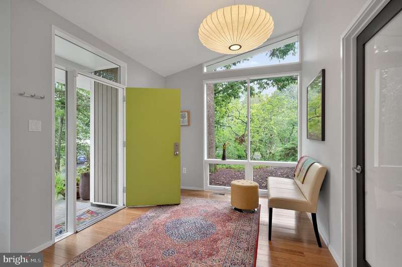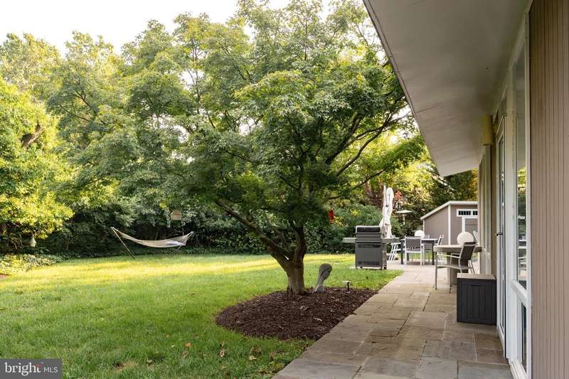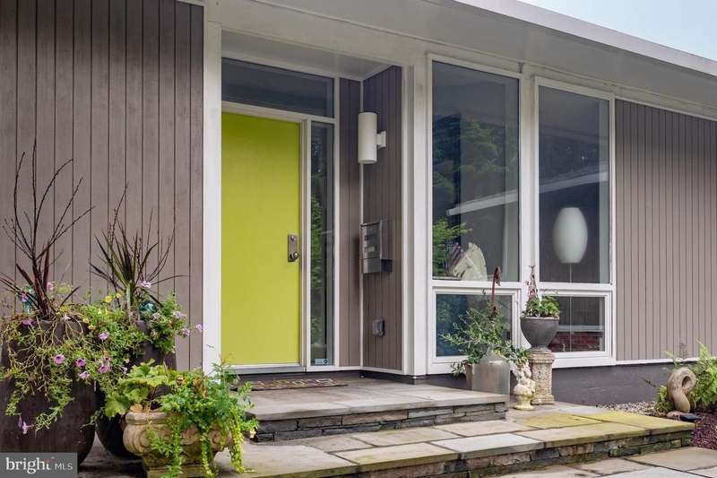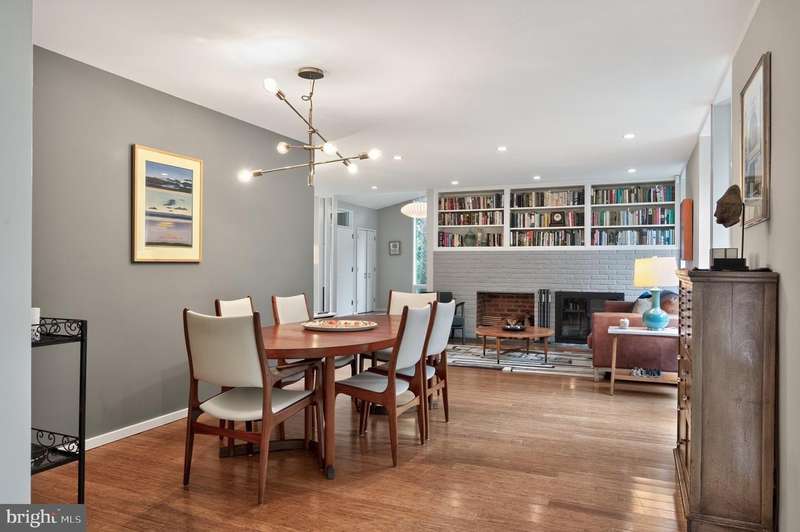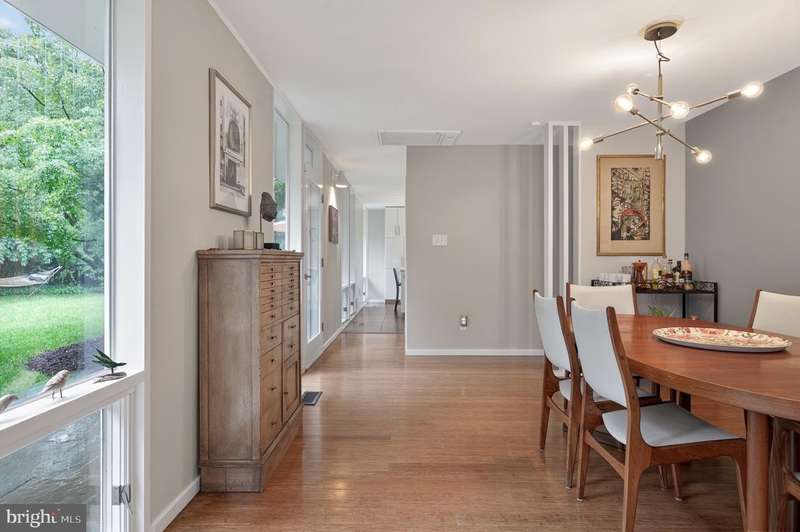 This extraordinary Mid-Century Modern home designed by Architect Charles Goodman is located in the highly sought-after Hollin Hills community. Home has been thoughtfully expanded to over 2,300 square feet with additions by renowned architects Casper Neer and Eason Cross. Extensively remodeled while preserving its iconic MCM charm, the home welcomes you with an impressive entry foyer featuring soaring ceilings, a coat closet, and a striking bubble chandelier. A private home office boasts a brick wall with built-in shelving, ideal for work or study. The open-concept living spaces include a welcoming living room and cozy family room with a wood-burning fireplace and custom built-in bookshelves, as well as a separate dining room perfect for entertaining. The custom kitchen features a large center island with seating, granite countertops, stainless steel appliances, and direct access to the patio, making it a true centerpiece of the home. The main level includes a spacious primary suite with a built-in dresser, a large custom closet, and a beautifully remodeled en-suite bathroom showcasing a walk-in shower with custom marble tile. A second main-level bedroom offers a custom closet organizer and light filled windows. There is another remodeled full bathroom, complete with a skylight. A convenient main-level laundry closet adds to the home's functionality. Upstairs, two additional bedrooms offer access to a Juliet balcony, with one bedroom featuring a walk-in closet. The large, sunlit lower-level recreation room provides additional living space, ideal for relaxing or entertaining as well as additional storage. Outdoor features include extensive hardscaping with a concrete driveway, slate patios and walkways that wrap around the home. The private, flat backyard is surrounded by mature landscaping and offers an ideal setting for outdoor gatherings. Additional storage is provided by both a detached outdoor shed and an attached exterior shed. With double-pane windows throughout and exceptional attention to detail, this home is filled with character and timeless style. Hollin Hills offers membership to 2 community pools as well as membership to a tennis and pickleball club. The scenic neighborhood boasts 7 parks, trails, an active Civic Association with seasonal celebrations, delicious super society and a friendly, close-knit environment. A commuter's dream location minutes from GW Parkway and trails, DC & the Pentagon; and south to Fort Belvoir, or north to Andrews AFB & Tysons Corner via I-495. This special address is an idyllic sanctuary to call home!