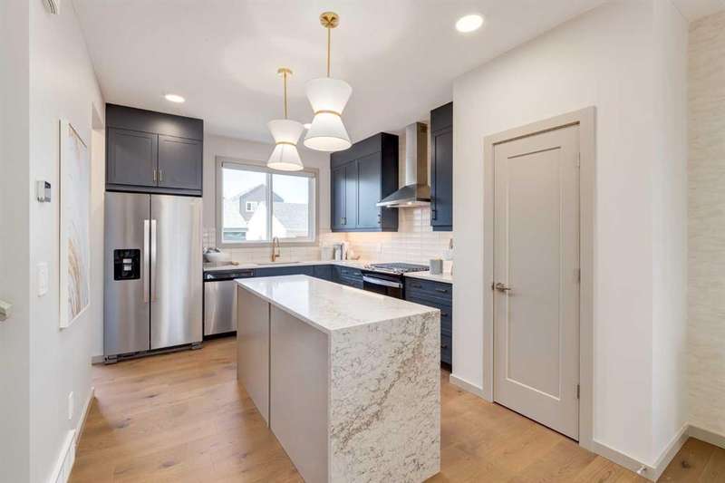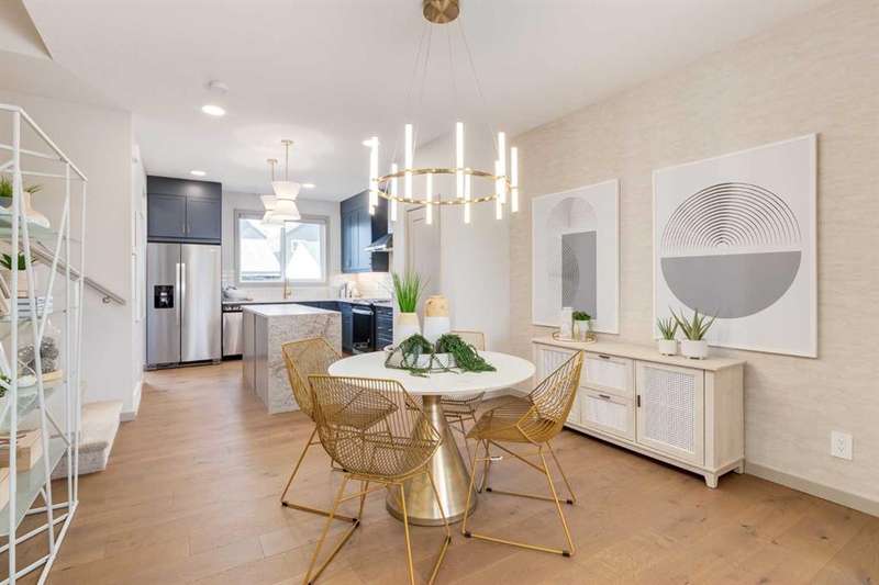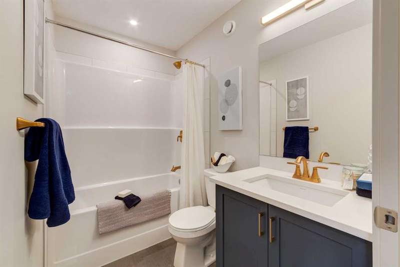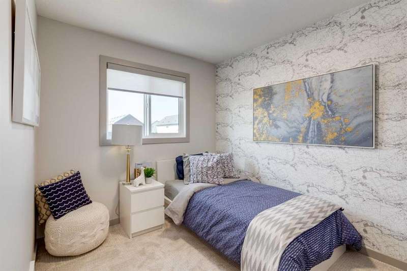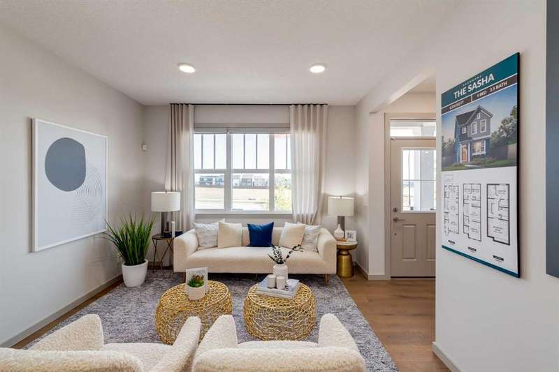 BACKING ONTO THE POND AND GREENSPACE, this brand-new Sasha model from Homes by Avi lives larger than its 1,523 square feet suggest. From the street, the façade stays modest, but step inside and the flow takes over. The foyer opens to 9' CEILINGS and a POCKET OFFICE tucked just behind the entry—perfect for homework stations, quiet calls, or simply keeping paperwork contained. Sightlines stretch past the living and dining areas to a kitchen window framing POND VIEWS, pulling daylight through the main floor. The kitchen balances function with design: QUARTZ COUNTERS in a crisp Crystal Crescent finish, FULL-HEIGHT 42" CABINETS in Oxford Grey, and a Silgranit undermount sink that makes cleanup feel almost civilized. A CHIMNEY HOOD FAN, BUILT-IN MICROWAVE, and gas line rough-in for the range give cooks flexibility, while the pantry lands exactly where you need it. Luxury vinyl plank runs throughout the main floor, keeping spaces cohesive and durable for family traffic. Off the back, a 10' x 10' deck lines you up for BBQ season with a gas line already in place. Upstairs, the BONUS ROOM anchors the plan, separating the primary bedroom from two secondary bedrooms. The primary itself feels lifted with a RAISED CEILING, walk-in closet, and a three-piece ensuite with quartz countertop. The two additional bedrooms share a full bath finished in soft greige tile, while laundry is smartly located upstairs on LVT flooring that can take the spin cycle. Everyday details were future-proofed: 200-amp electrical service, a SEPARATE SIDE ENTRY DOOR option, rough-in for a basement bathroom, and 9' FOUNDATION WALLS for when you finish it out. The REAR DETACHED GARAGE (20' x 20') sits on a paved lane, while sod to the front yard keeps curb appeal instant. Starling itself is a community built around what matters: PRESERVED WETLANDS, LOOPING PATHWAYS, PLAYGROUNDS, and a sense of calm that comes from knowing the view behind you is more sky than neighbour. With Stoney Trail minutes away, the rest of Calgary stays within easy reach, but home always feels like a step closer to nature. This is a home that folds everyday life into a backdrop worth keeping. Book a showing, stand on the deck and ENJOY THE VIEW—you’ll know exactly how it lives. • PLEASE NOTE: Photos are of a Showhome of the same model – fit and finish may differ. Interior selections and floorplans shown in photos.