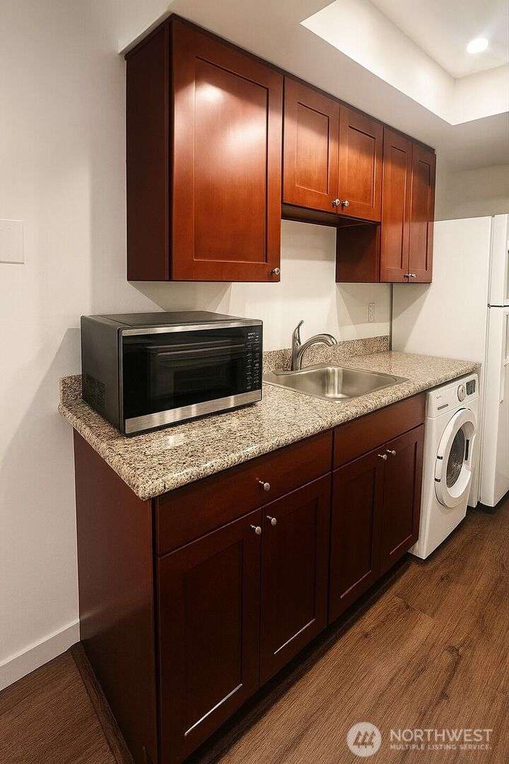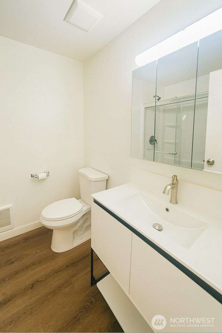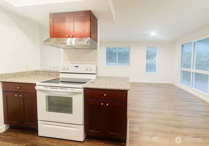 Charming two bedroom in desirable Houghton neighborhood. All hardwood flooring. Quiet 5-unit building. Newer finishes throughout. Electric fireplace, combo W/D in unit, walk in closet. Water, sewer and garbage utilities included in the rent. 2 parking spaces included in the rent. Seconds to freeway access and minutes to Kirkland waterfront. Peek-a-boo views of Lake Washington. 1 dog or cat accepted with $35 per month pet rent. Short distance to Met Market, Starbucks, Kirkland Corridor Trail & Google.