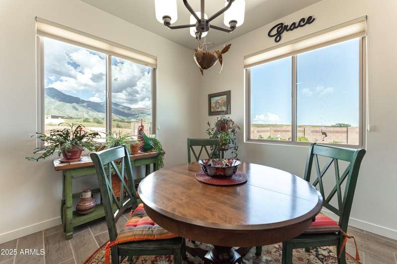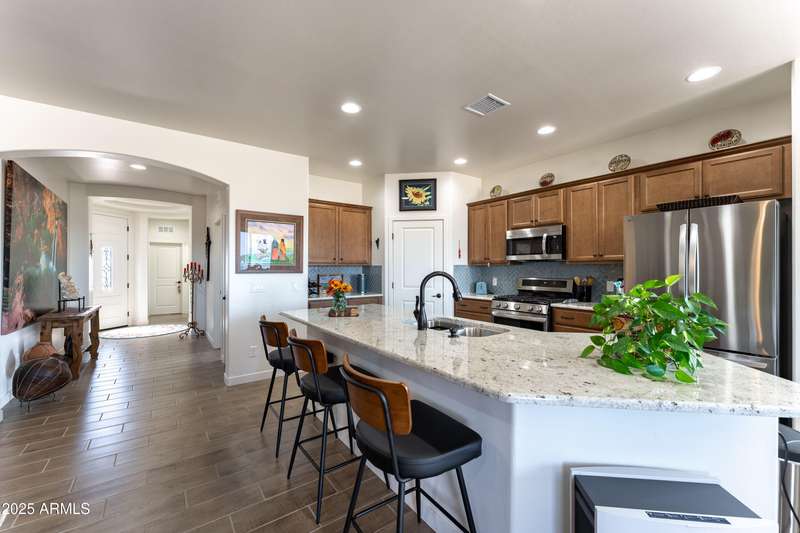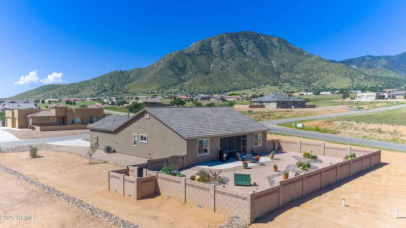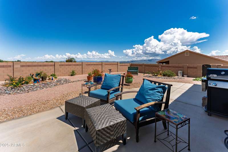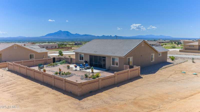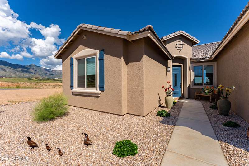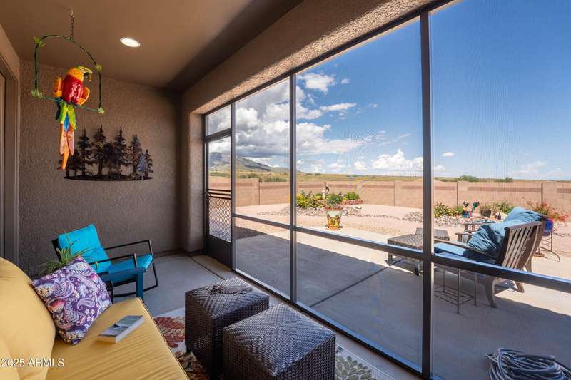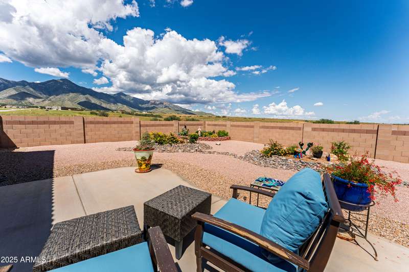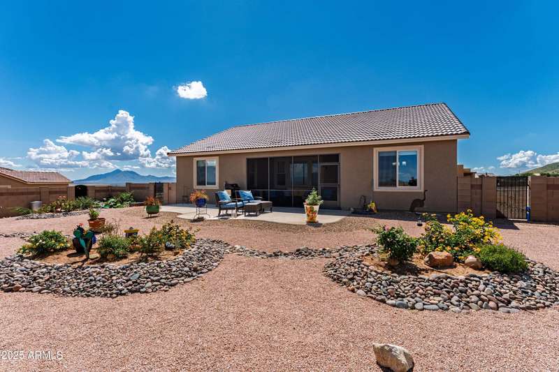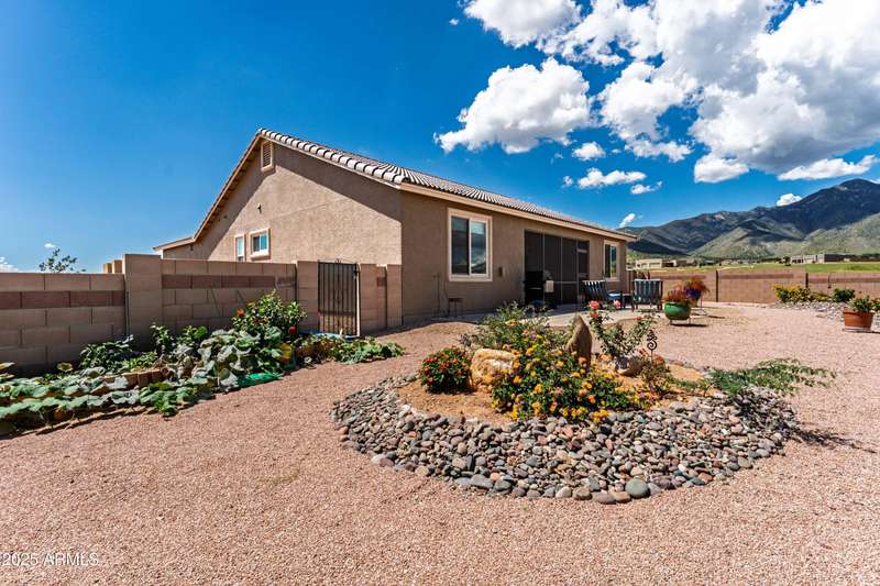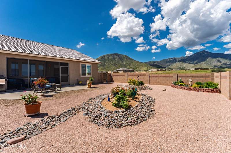 This 2,088 sqft home sits on a corner lot with unobstructed mountain views and thoughtful details throughout. Offering 3 bedrooms and 2 bathrooms, it also includes two versatile living spaces that could be used as a den or flex room. The kitchen shines with stainless steel appliances, granite counters, and a bold blue mosaic backsplash that adds a lively touch. Wood-look tile runs throughout—no carpet anywhere. The home carries a warm Southwestern style with earthy accents. The garage floor is coated, and the screened porch extends to an open patio with hot tub prep. The landscaped backyard features colorful blooms and a thriving garden.