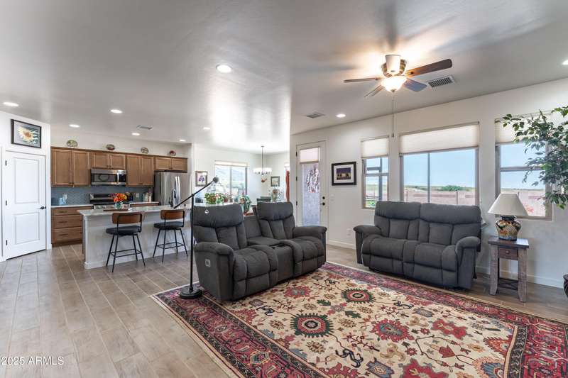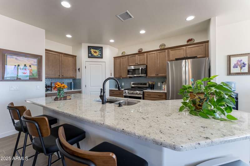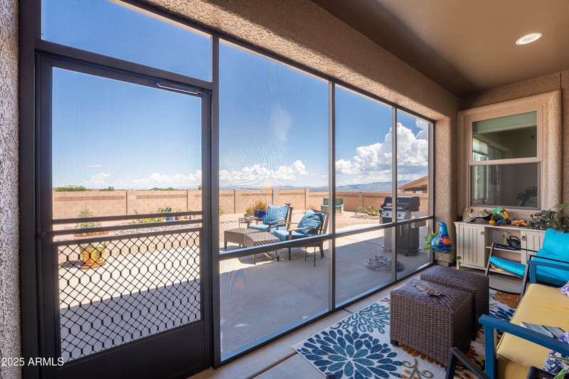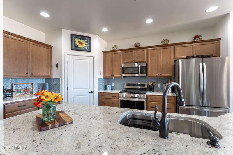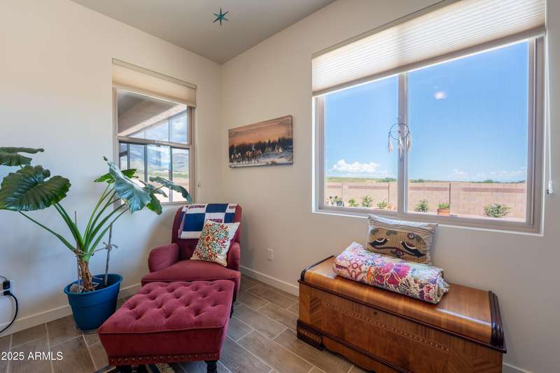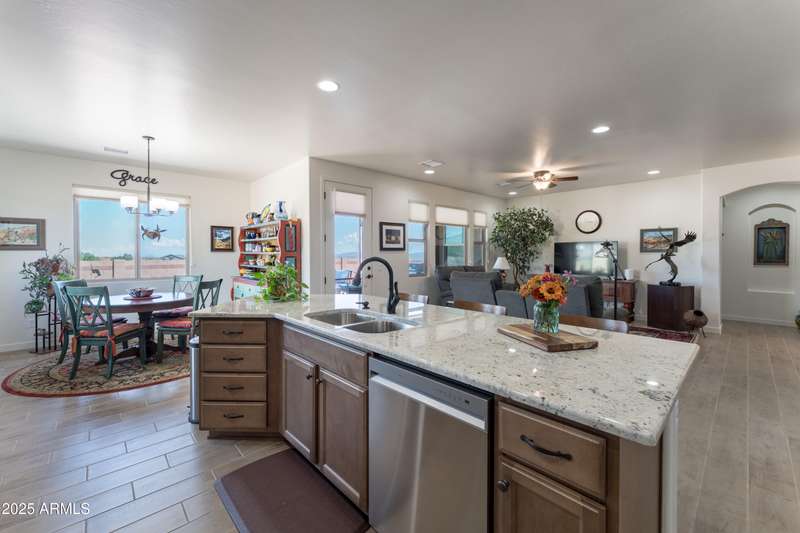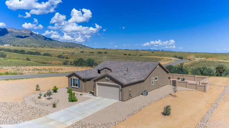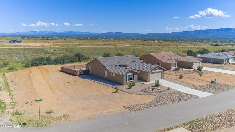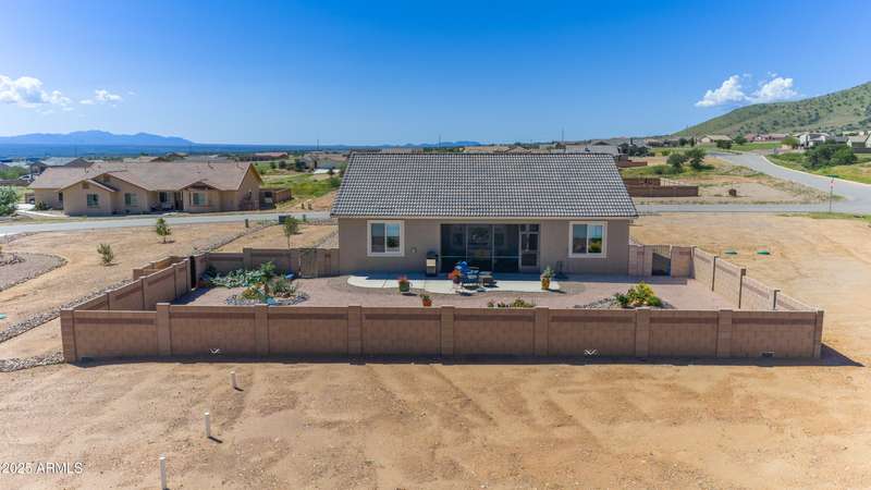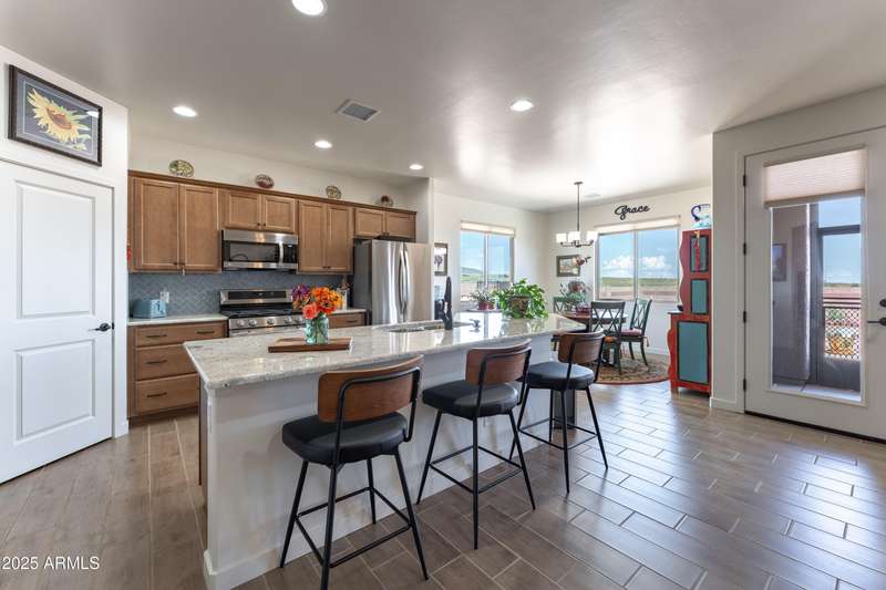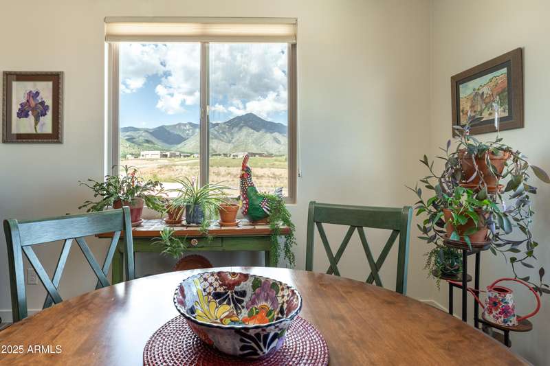 This 2,088 sqft home sits on a corner lot with unobstructed mountain views and thoughtful details throughout. Offering 3 bedrooms and 2 bathrooms, it also includes two versatile living spaces that could be used as a den or flex room. The kitchen shines with stainless steel appliances, granite counters, and a bold blue mosaic backsplash that adds a lively touch. Wood-look tile runs throughout—no carpet anywhere. The home carries a warm Southwestern style with earthy accents. The garage floor is coated, and the screened porch extends to an open patio with hot tub prep. The landscaped backyard features colorful blooms and a thriving garden.