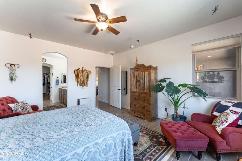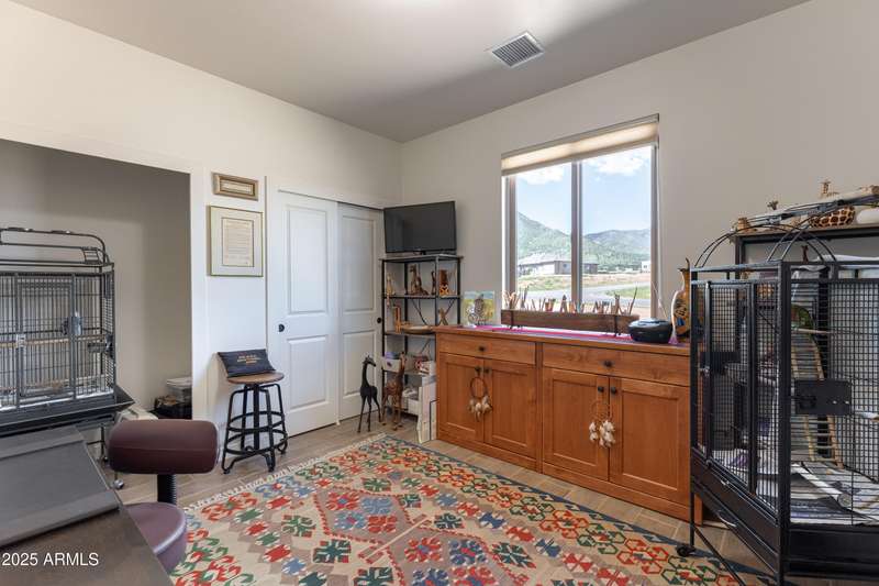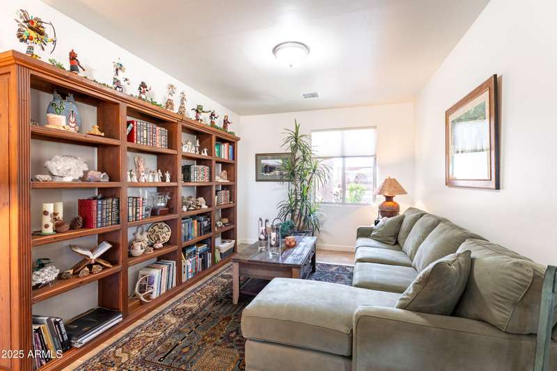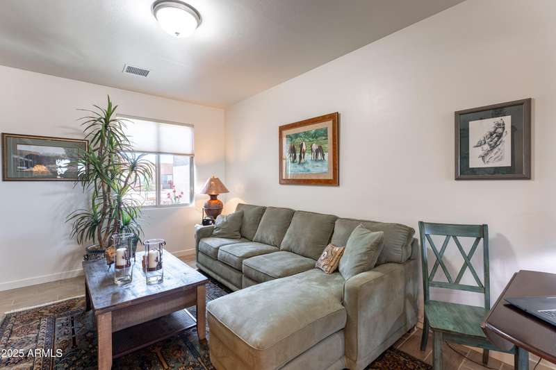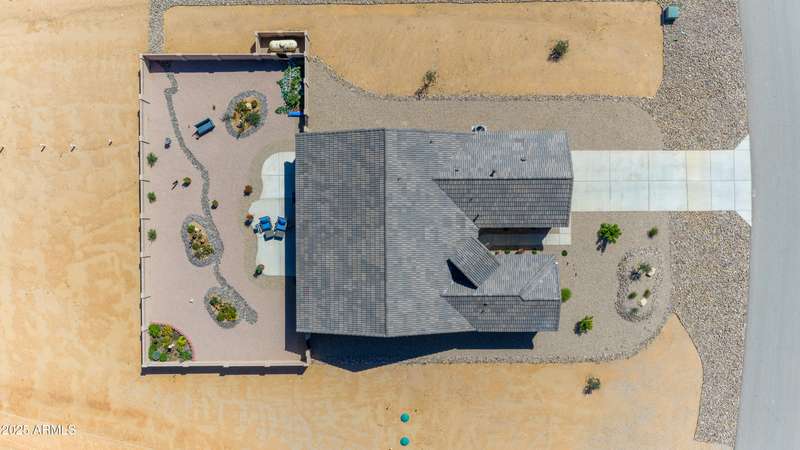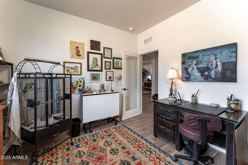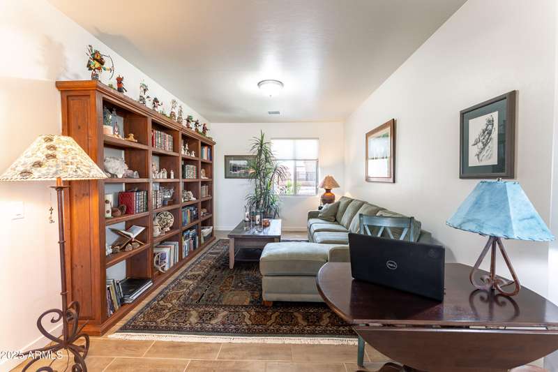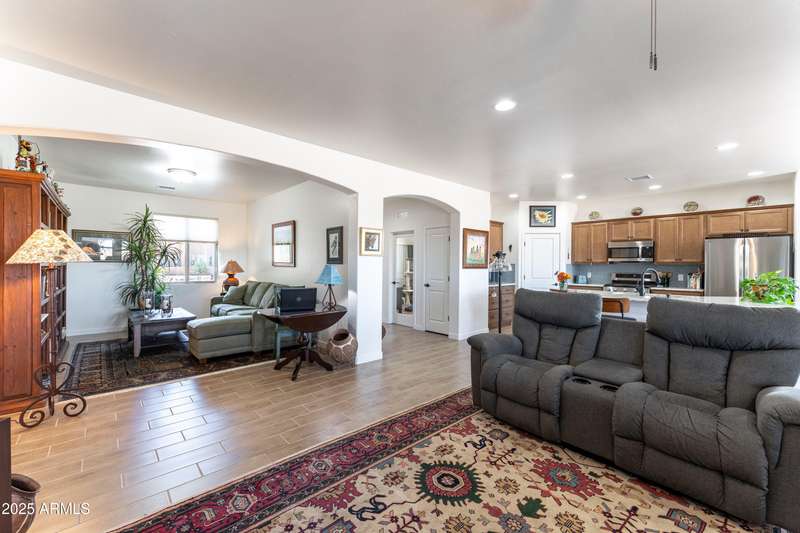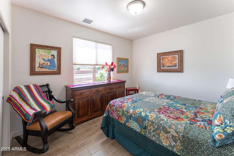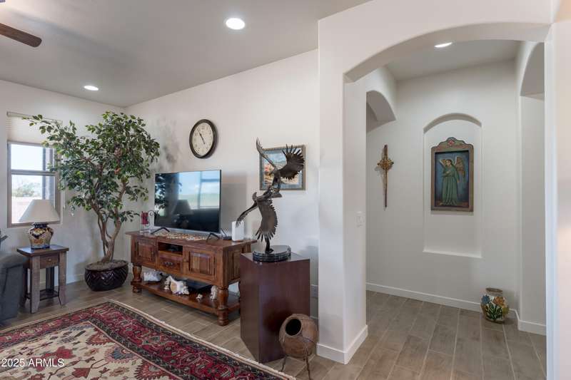 This 2,088 sqft home sits on a corner lot with unobstructed mountain views and thoughtful details throughout. Offering 3 bedrooms and 2 bathrooms, it also includes two versatile living spaces that could be used as a den or flex room. The kitchen shines with stainless steel appliances, granite counters, and a bold blue mosaic backsplash that adds a lively touch. Wood-look tile runs throughout—no carpet anywhere. The home carries a warm Southwestern style with earthy accents. The garage floor is coated, and the screened porch extends to an open patio with hot tub prep. The landscaped backyard features colorful blooms and a thriving garden.
