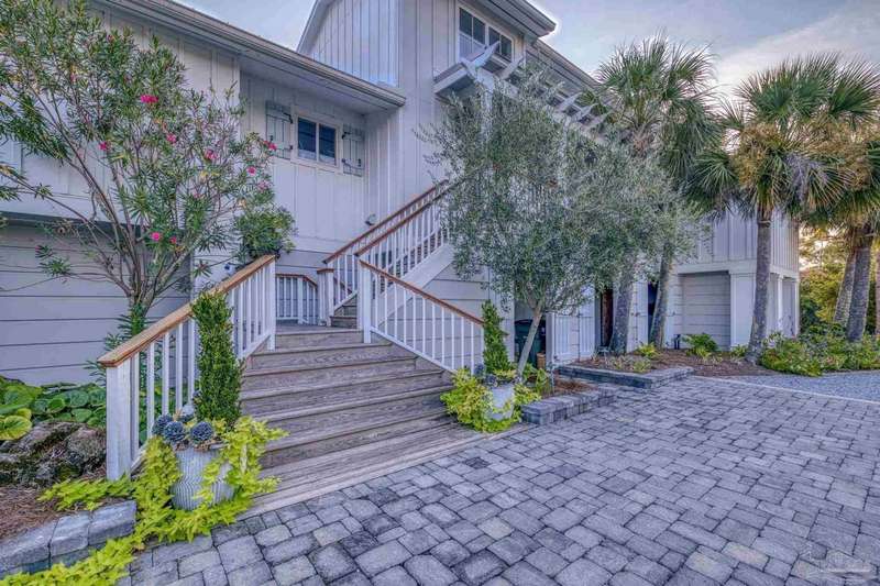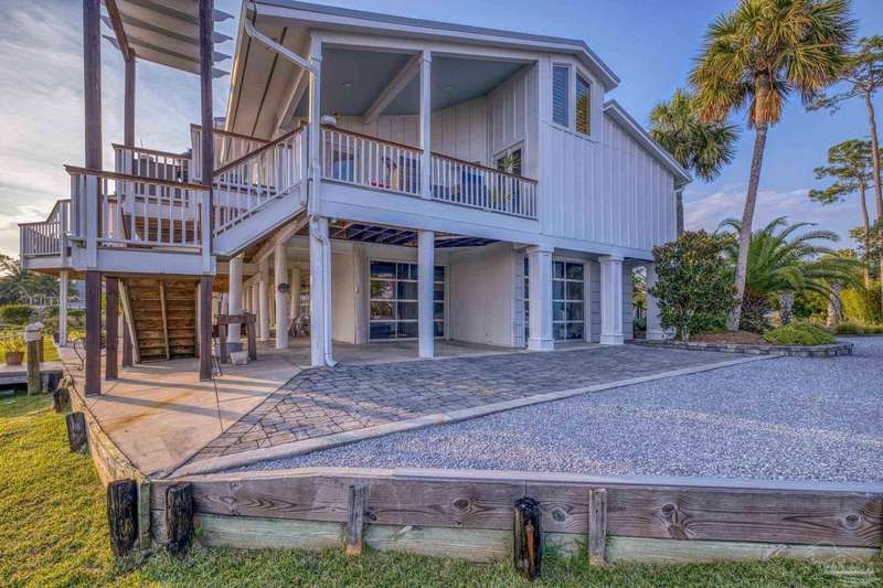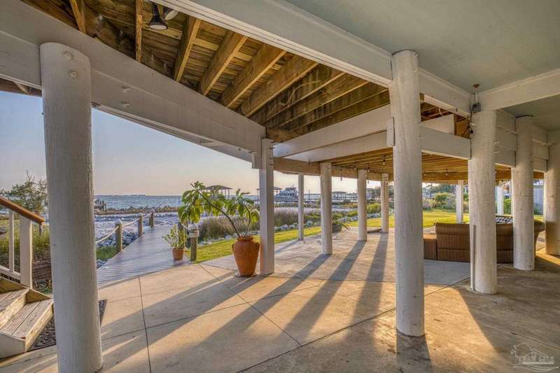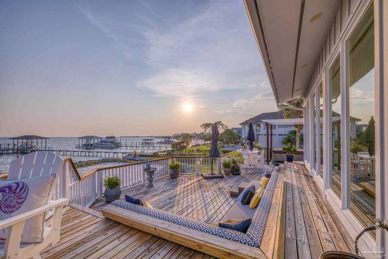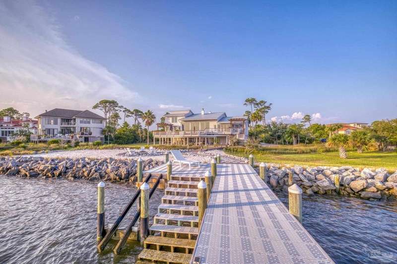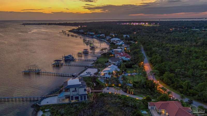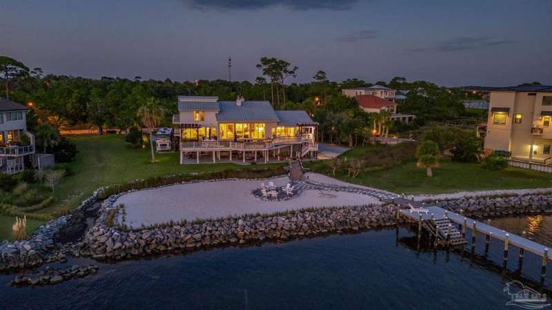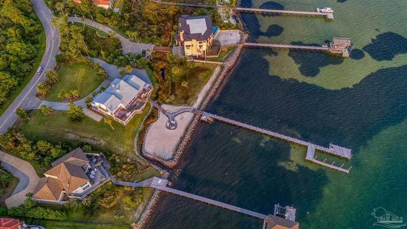 This is a rare opportunity to own a premier deep-water estate in Gulf Breeze Proper. Situated on 1.5 acres with over 200 feet on the Intracoastal Waterway, this stunning property features a rare 20x50 ft deep-water boat slip (9 ft depth) with flow-through dock and sun deck, a private white sand beach, and expansive green space. The home offers luxury throughout, including a great room with expansive windows showcasing breathtaking water views, a vaulted ceiling, and a gas fireplace. The custom kitchen is equipped with high-end appliances, a wet bar, and a dining area overlooking the Sound. The primary suite offers panoramic water views, deck/hot tub access, dual walk-in closets, and a spa-style bath with a soaking tub and separate shower. A main-level guest suite includes a private bath and patio access. Upstairs, you'll find two additional bedrooms, two full baths, and a large multipurpose room with a fireplace and French doors for added privacy. Additional features include a 3-car garage with a climate-controlled, large bonus room and half bath, plus a 200x200 ft vacant lot across the street included in the sale. Exceptional views, luxury finishes, and rare boating access make this a one-of-a-kind waterfront offering the ultimate Florida lifestyle.