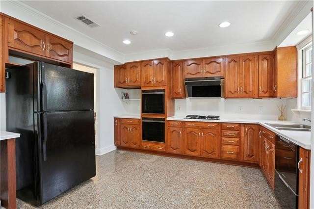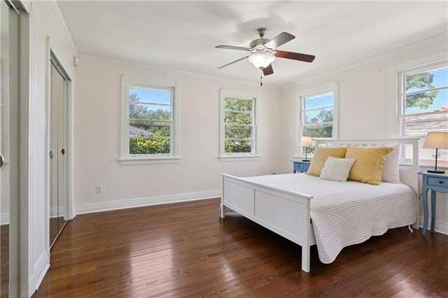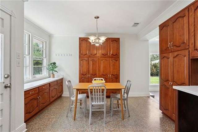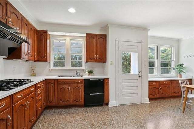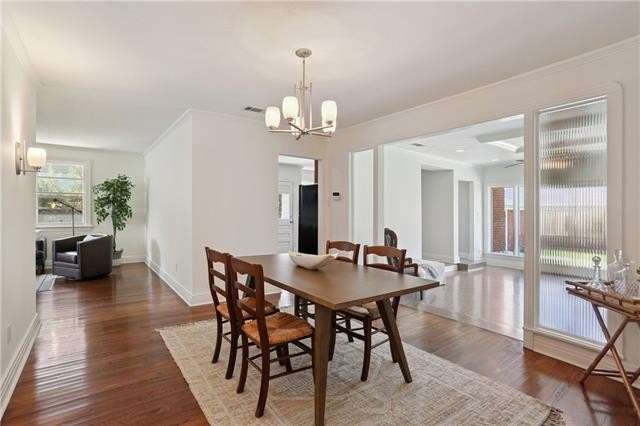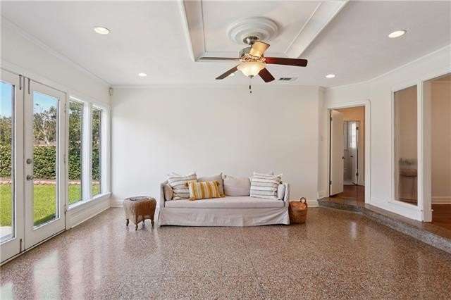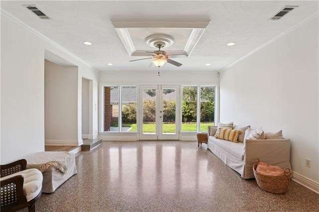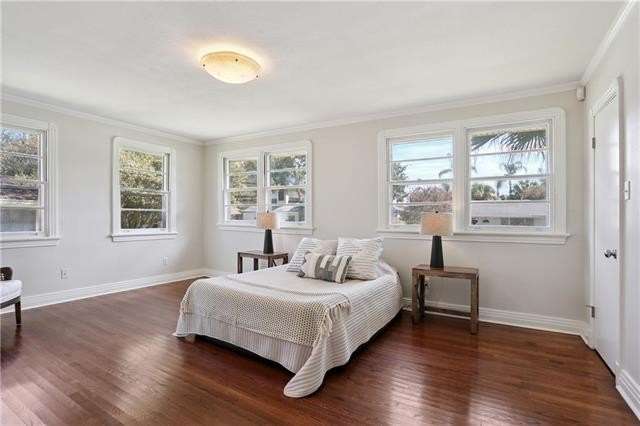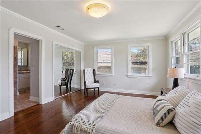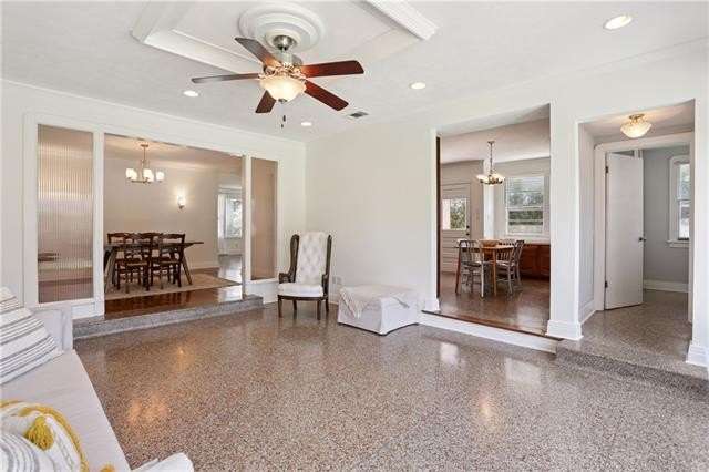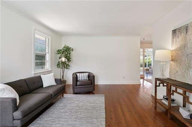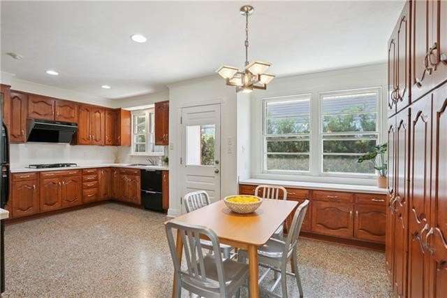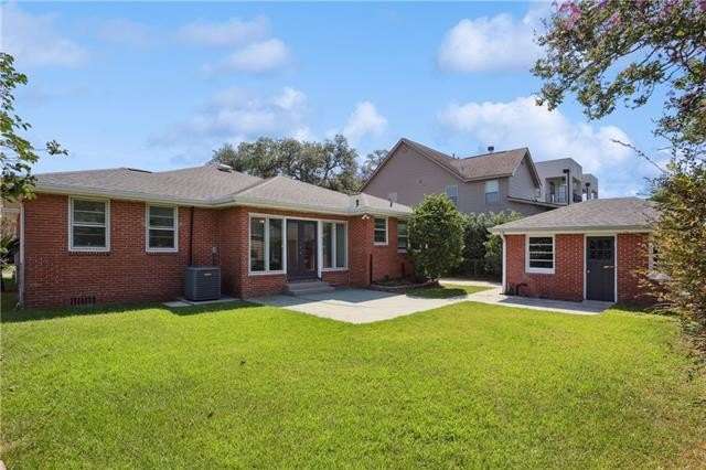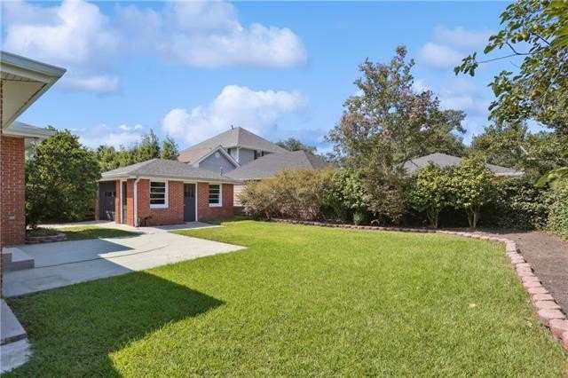 Enjoy the serene lifestyle of oak tree lined West Lakeshore in this raised brick home conveniently located just 2 blocks from Harlequin Park, less than a mile from the lakefront, and walking distance to a grocery, bakery, gym, pharmacy, restaurants, daycare, and much more! Fantastic 3B/2.5B floorplan with living, dining, den, and large eat-in kitchen. Bedrooms feel very private from the living areas with a hallway that can be closed off. Spacious primary suite features a fabulous mid mod bathroom. Enjoy hardwood floors plus original terrazzo in the kitchen and den. Beautiful original moldings throughout. Backyard has plenty of room for a pool! New Roof 2022. Neighborhood security patrol through the LakeShore Crime Prevention District. Located in the preferred X zone with low flood insurance of only $1051/year.