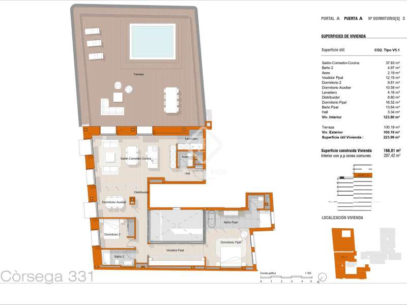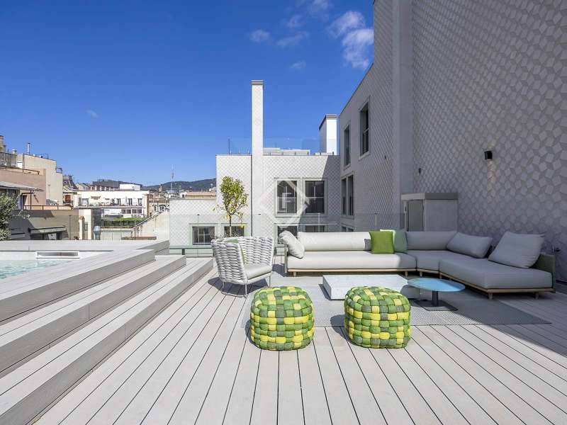 Corcega 331 is a very special new development located next to the prestigious Passeig de Gracia and Avinguda Diagonal, two of Barcelona's most popular and important boulevards, home to many architectural marvels and an abundance of services, restaurants and high-end shops. This building, with an attractive façade, has undergone an ambitious refurbishment project which has resulted in contemporary, avant-garde interiors with state-of-the-art materials by brands such as Gunni&Trentino, green areas and all modern urban comforts, making it a true oasis at the heart of the city. Parking spaces are provided in the same building and the ground floor provides exceptional communal facilities, including a gym, spa, pool, a lounge and a coworking area. The development offers this exquisitely finished brand-new home with an open-plan living room, dining room and kitchen with access to a 100 m² terrace, 3 bedrooms, 3 bathrooms and a laundry room. These spacious, light-filled homes feature open-plan living spaces with modern, functional kitchens. The bedrooms have been designed to maximise comfort and peace, for a good night's sleep and the bathrooms are finished with elegant, high-end materials, fixtures and fittings. Please contact us for further information regarding this outstanding new residences with excellent communal facilities, in an enviable location in the city.