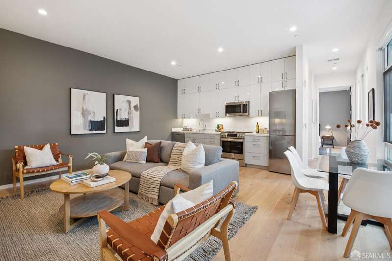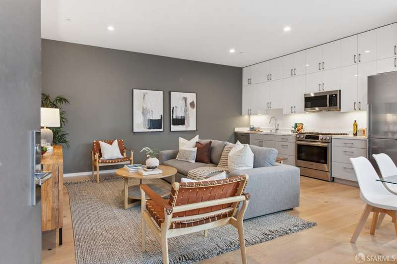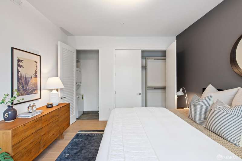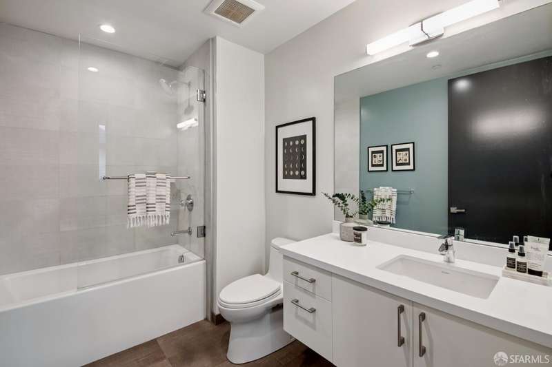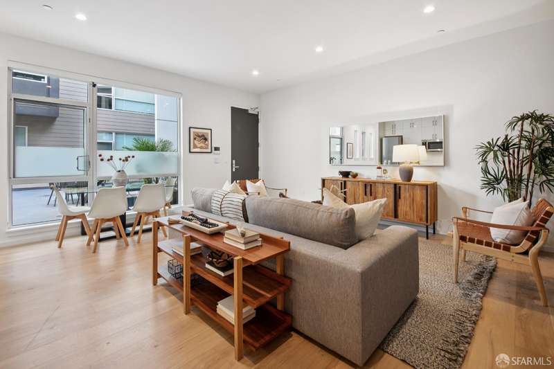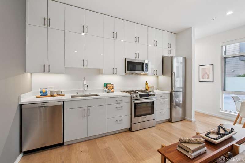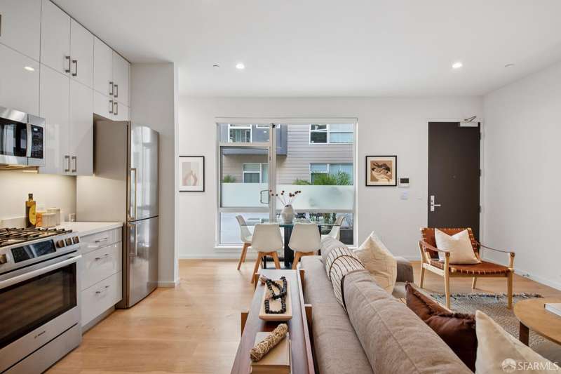 Unit 204 is a modern 1 bed / 1 bath residence in the highly desirable Potrero Hill neighborhood. Featuring an open floor plan that is spacious and welcoming, this condo is perfect for entertaining. The living space, is bright and faces the courtyard. The adjoined kitchen offers contemporary finishes, stainless steel appliances, and double-stacked cabinets to ensure that organization is made easy. American Oak Hardwood floors feature throughout this condo, including in the spacious bedroom which offers ample closet space. The bathroom is bright and modern, boasting a sleek tub/shower combo with a half-wall glass shower enclosure. This unit has a stacked washer/dryer and its own assigned storage locker & 1-car parking in the garage. Professional management, exterior and common space maintenance, unit heating, trash, and water and internet are included with the monthly HOA dues.
