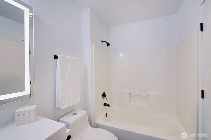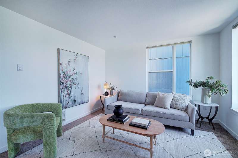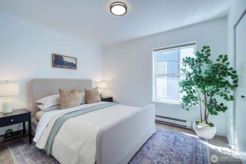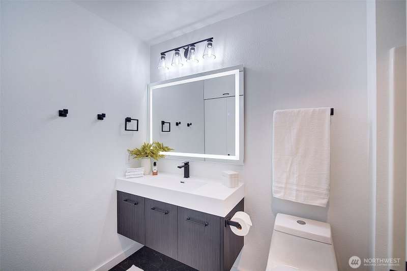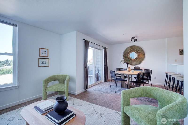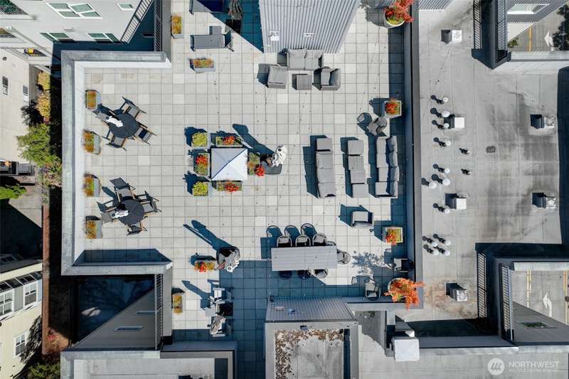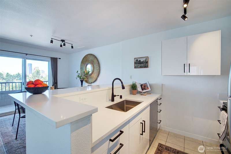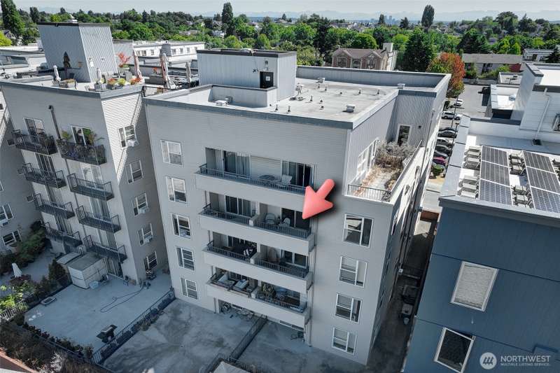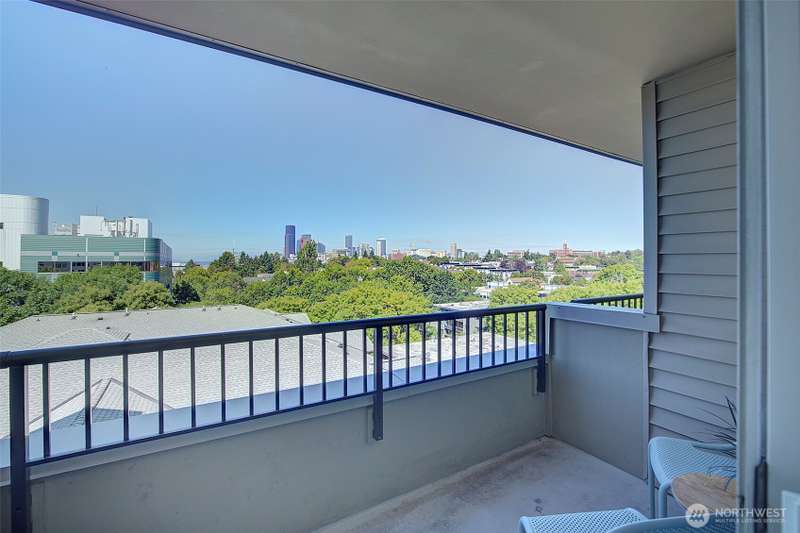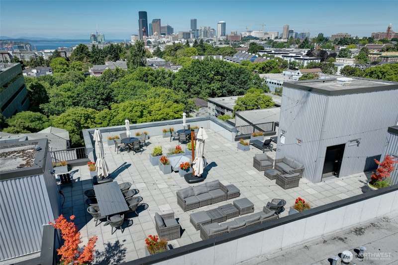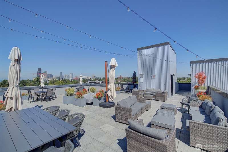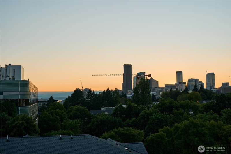Central living with city, sound, mountain & sunset views! This light-filled, 5th floor, SW corner, end unit has a private deck providing the perfect spot to watch the sun set behind the city each night. Located in a secured building, w/ dedicated garage parking & storage locker. The condo has 2 bedrooms (office option), separate living & dining spaces, newly updated kitchen (quartz countertops, stainless appl) & bathroom (LED & anti-fog mirror, floating vanity, washer/dryer). Big rooftop patio for lounging & dining w/ even better views. Close to Judkins Park Light Rail Station set to open early 2026. Walking distance (walk score 93) to groceries, banking, drug store, restaurants, bakeries, auto-parts, plants, gym, schools & beauty!