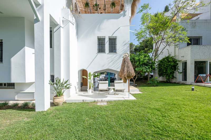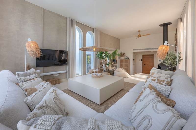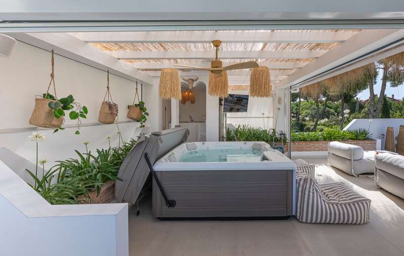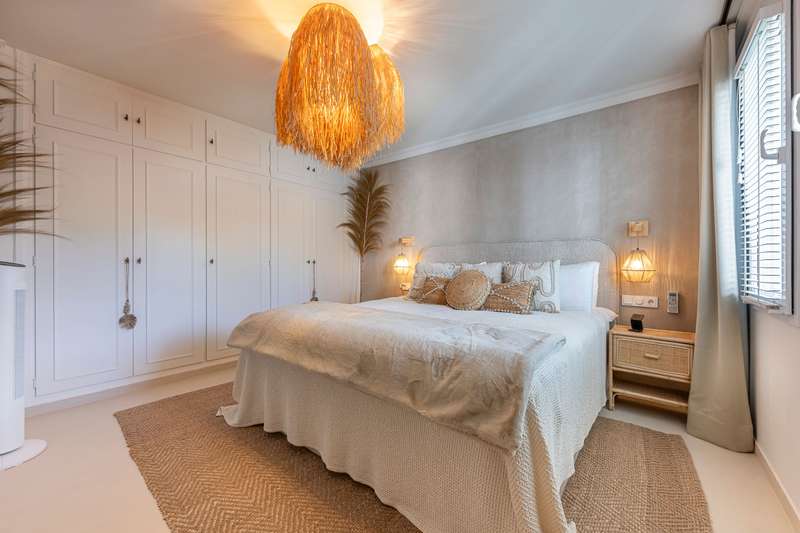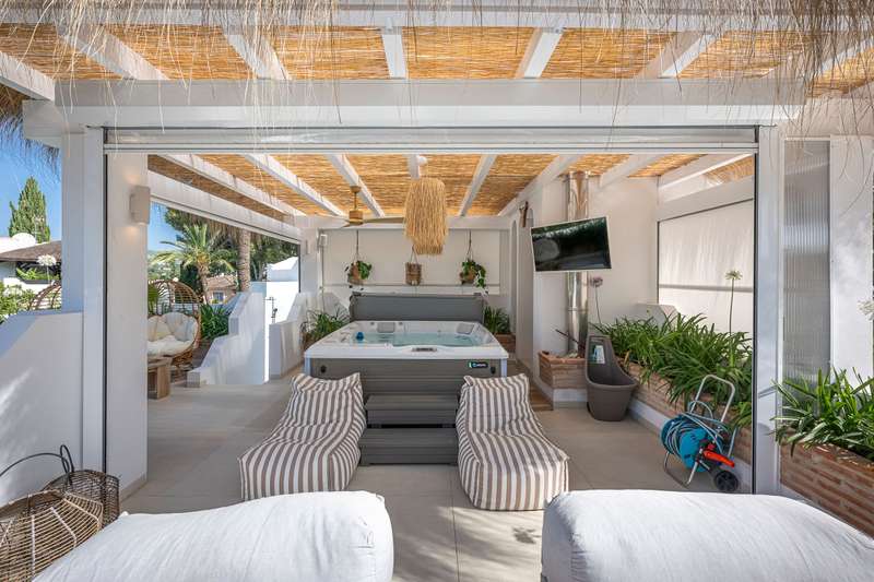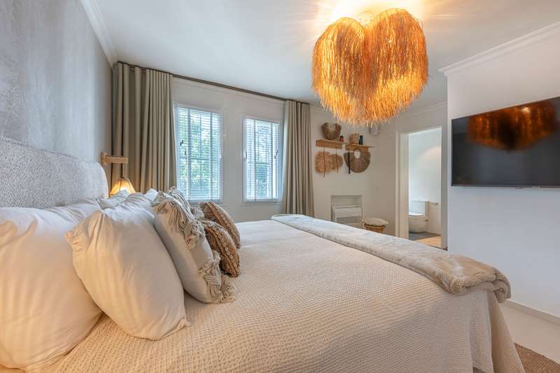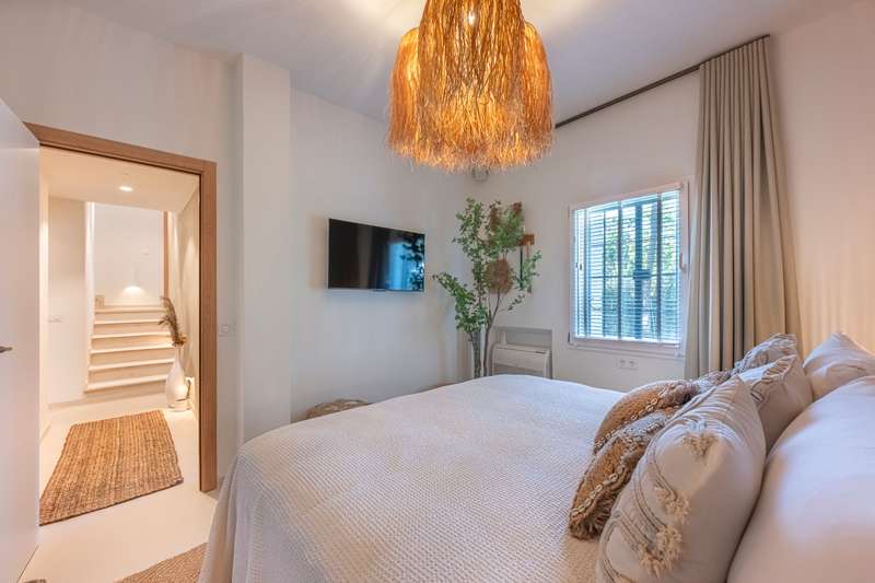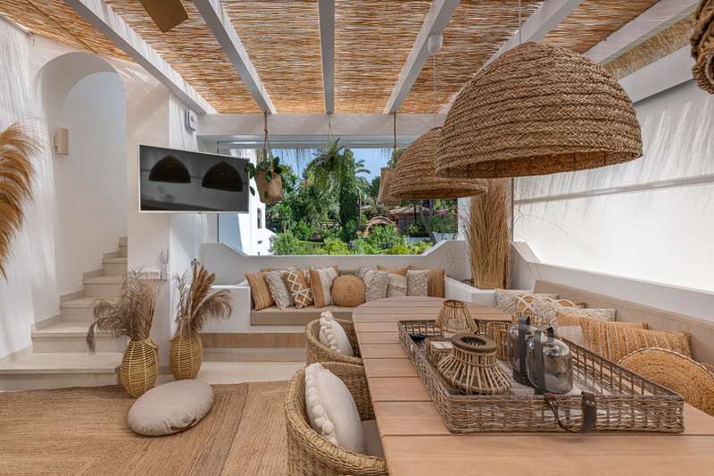 Step into refined Mediterranean living with this stunning four-bedroom townhouse nestled in the exclusive urbanisation of Atalaya de Río Verde, by Puerto Banus. This beautifully renovated home offers 174 m² of sophisticated interior space complemented by a generous 103 m² terrace, perfectly blending indoor comfort with outdoor elegance. Located just minutes from the vibrant Puerto Banús, residents enjoy a tranquil and secure environment while being effortlessly close to golden beaches, gourmet dining, high-end shopping, and the vibrant social life of the Costa del Sol. Golf enthusiasts will appreciate proximity to some of the region’s most prestigious courses, including Real Las Brisas, Aloha, and Los Naranjos. Recently refurbished in 2023, the home showcases a contemporary Mediterranean design with tasteful Boho Chic Ibiza influences. The interior features warm wood accents, sleek ceramic finishes, and luxurious details, creating an inviting and stylish ambiance. The spacious open-