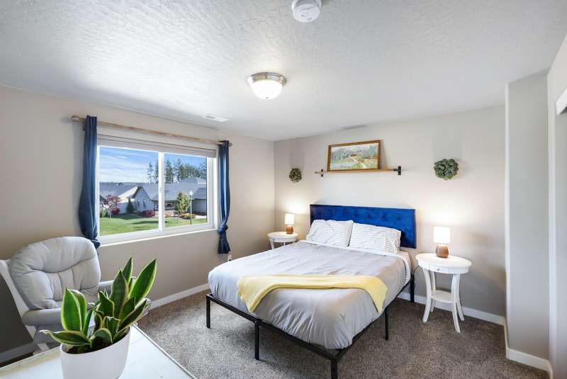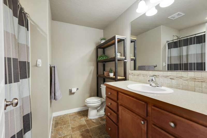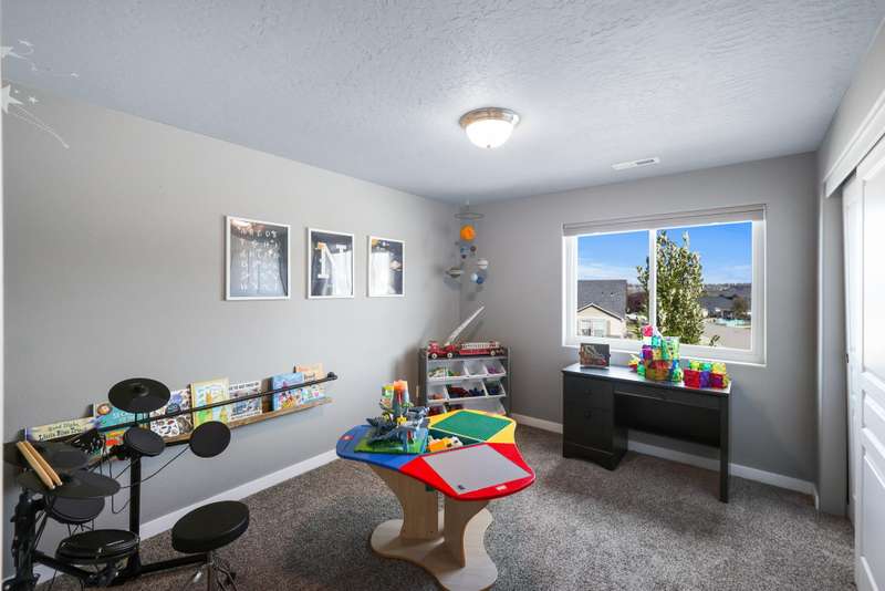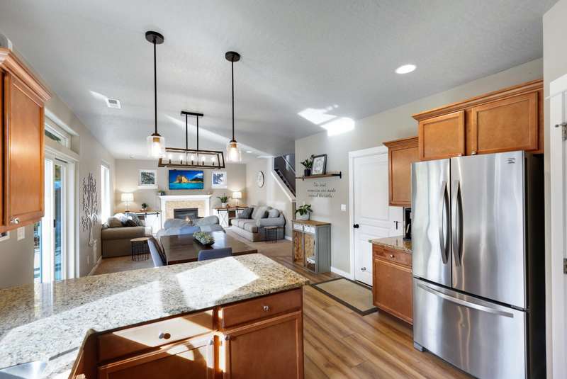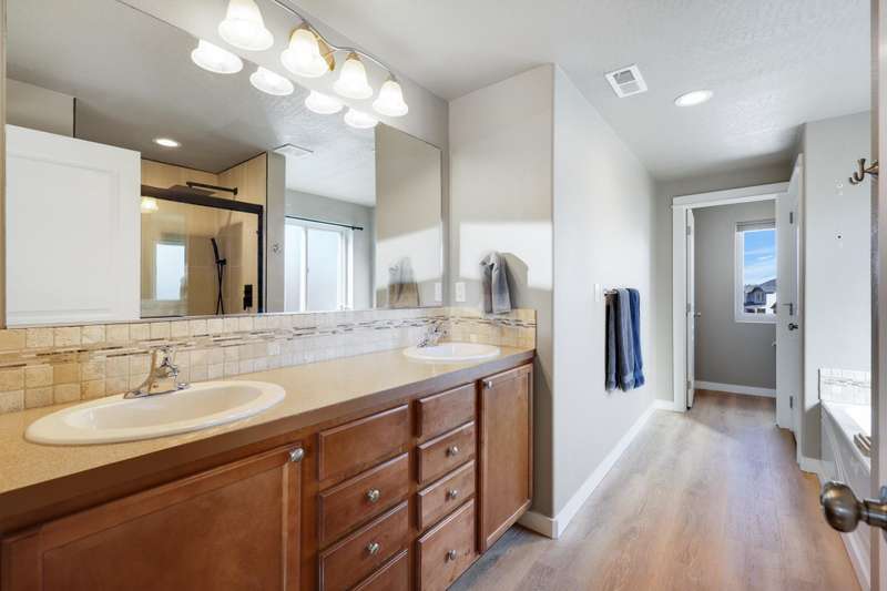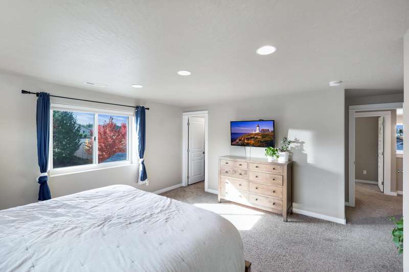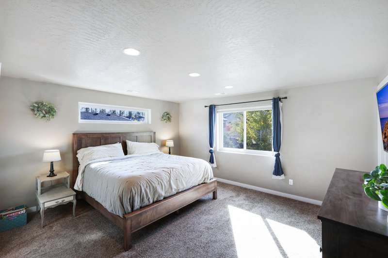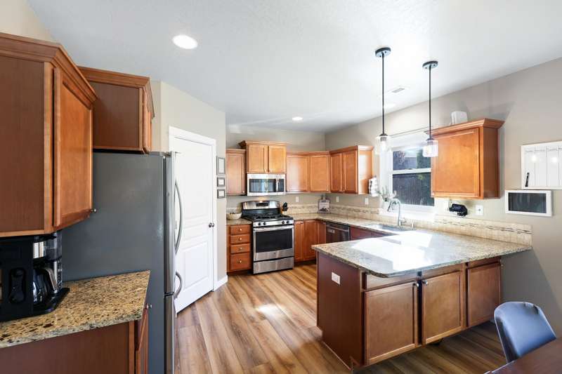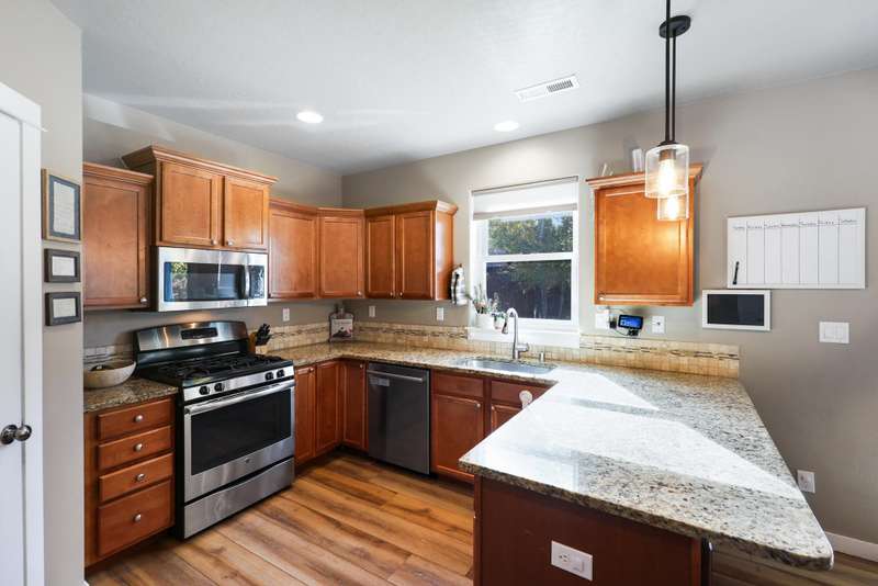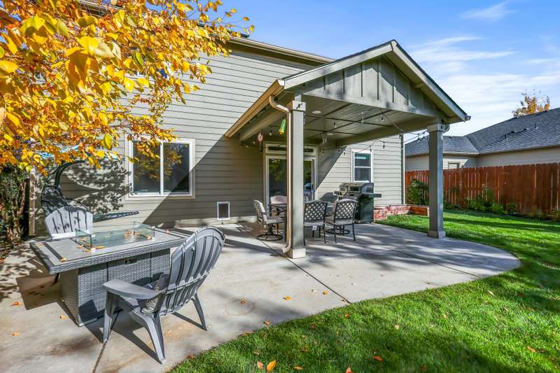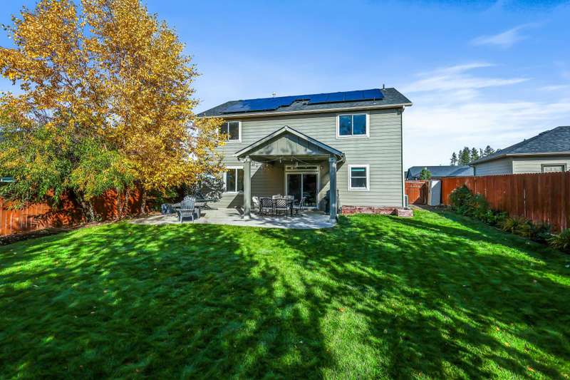 This beautifully updated 5-bedroom, 2.5-bath home combines modern upgrades with a spacious, open-concept layout. Built in 2016 and remodeled in 2025, this home showcases thoughtful improvements throughout, including new Andersen windows (2024), energy-efficient solar panels (2023), and a luxuriously remodeled master bathroom. The great room concept connects the living, dining, and kitchen areas ideal for entertaining and everyday living. The kitchen features granite countertops, stainless steel appliances, updated LVP flooring, and ample cabinetry for storage. Upstairs, four generous bedrooms provide flexibility for family or guests. Downstairs bedroom currently used as an office with custom built desk. The primary suite offers newly remodeled ensuite bathroom with custom-built shower featuring modern finishes and high-end details. Enjoy your spacious backyard, complete with a covered patio, perfect for relaxing or hosting gatherings. Just a blocks from neighborhood park, makes this home a must see.