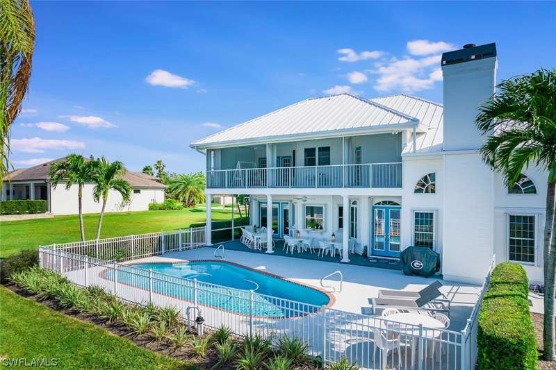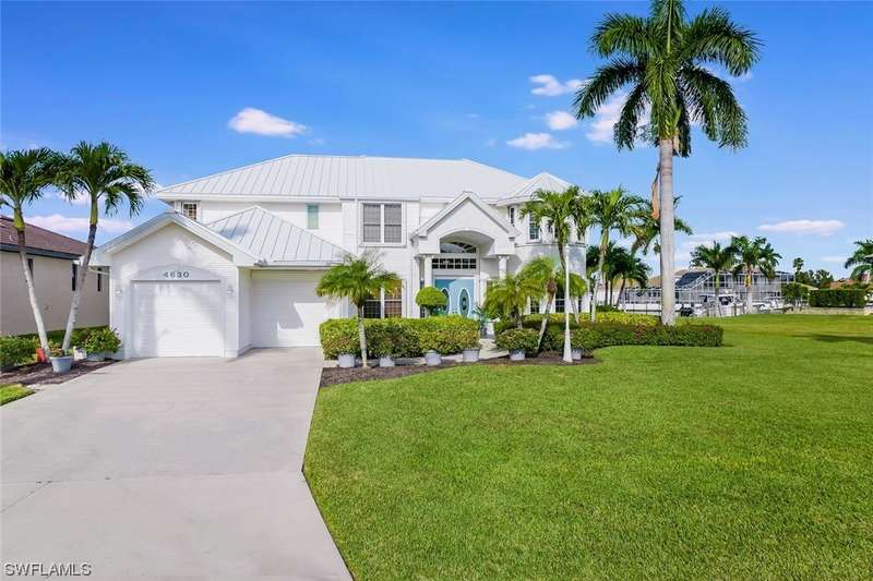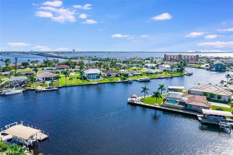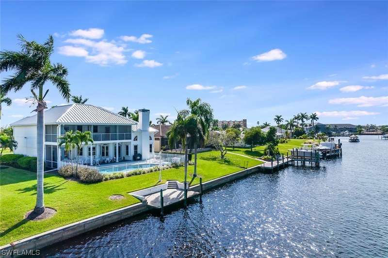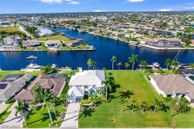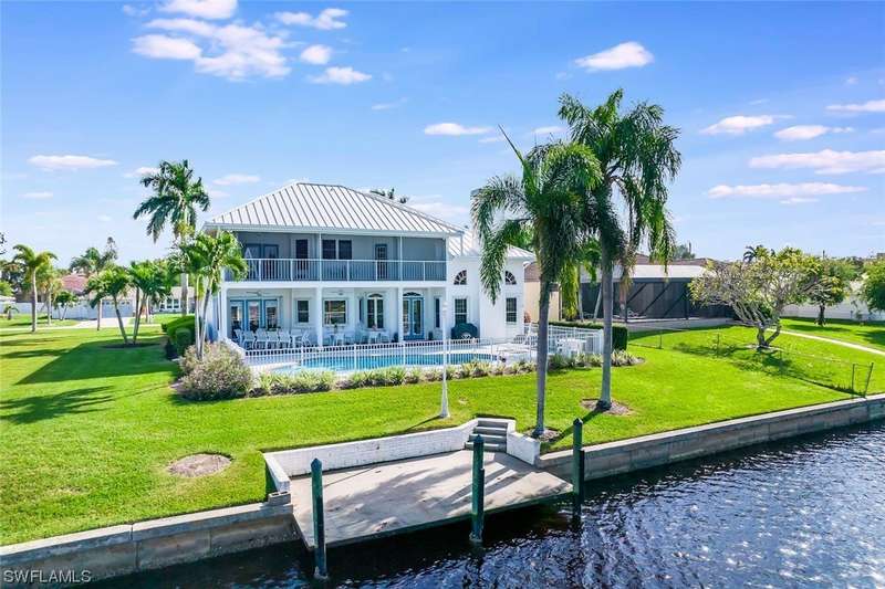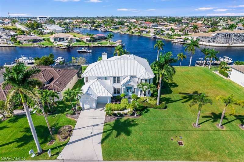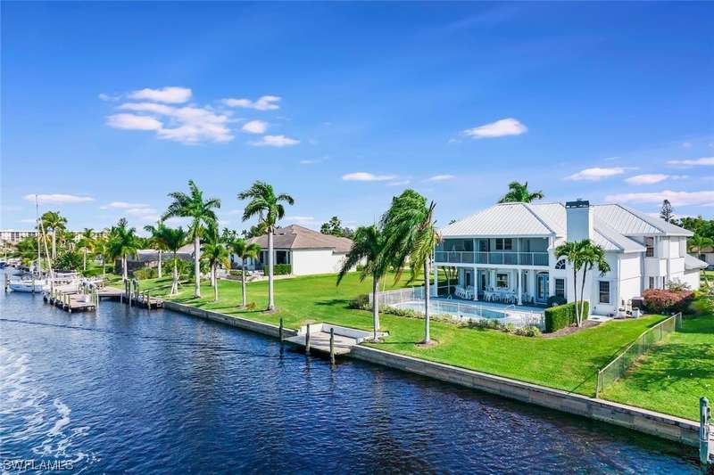 Absolutely one of the best locations in Cape Coral with incredible boating access, big water views and fully furnished for your convenience. This beautiful home has been meticulously cared for and boasts a brand-new metal roof in 2023. The interior showcases exquisite craftsmanship, highlighted by custom solid wood cabinetry throughout. The gourmet kitchen is a chef's dream, featuring dual dishwashers, two ovens, marble countertops, and not one but two islands, all complemented by a breathtaking view out to the intersecting canal view. The family room impresses with a vaulted ceiling adorned with beautiful tongue and groove wood. On the second floor, a vast screened porch, offering panoramic views of the water and stunning sunsets. Upgrades abound, including dual staircases, a three-car tandem garage, a convenient laundry chute leading to a spacious laundry room, and a generously-sized multipurpose game room on the second floor that could easily be converted into an additional bedroom or used as an office. Further enhancing this residence are a wood-burning fireplace, and custom millwork throughout. This level of detail must be seen to be truly appreciated.