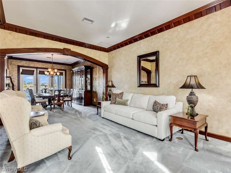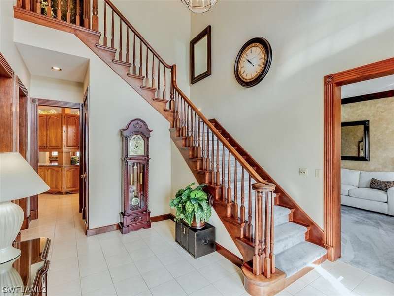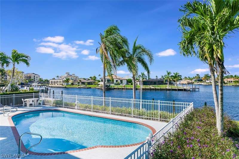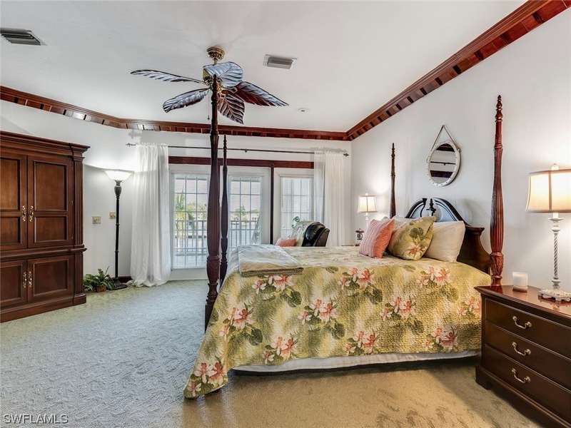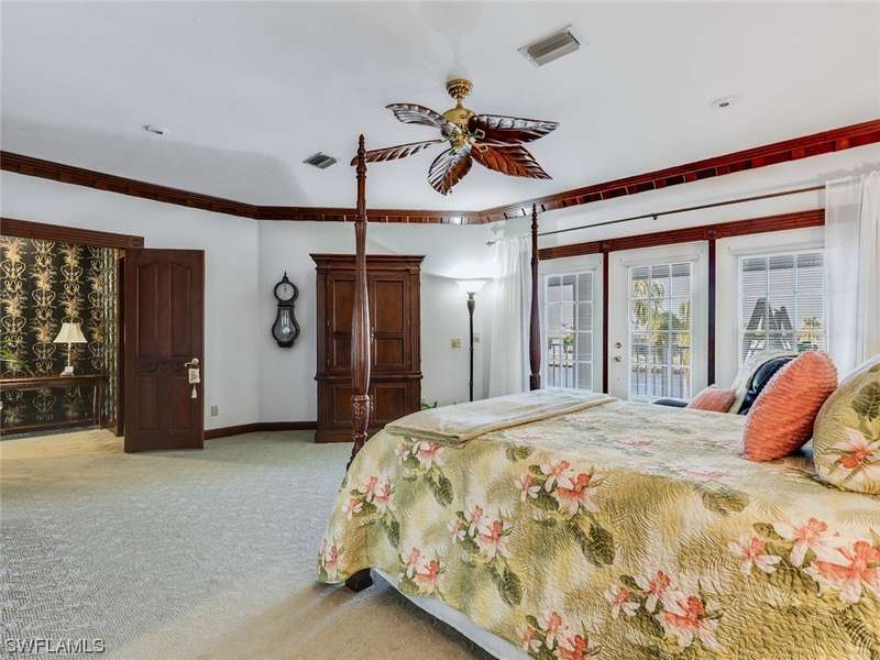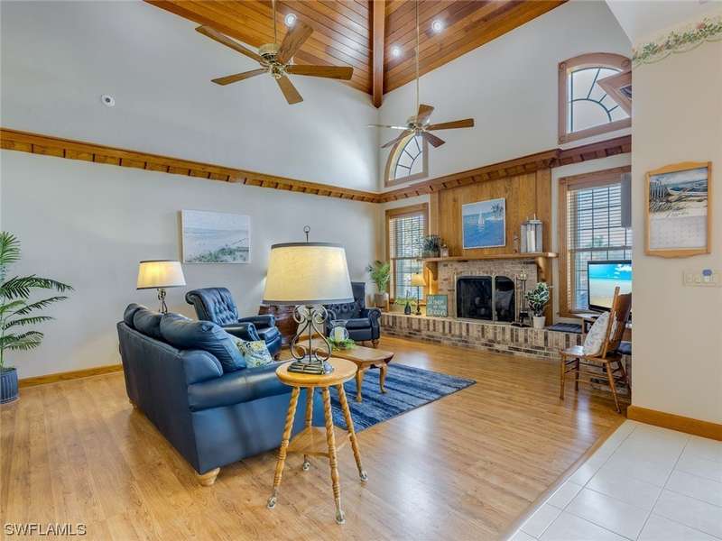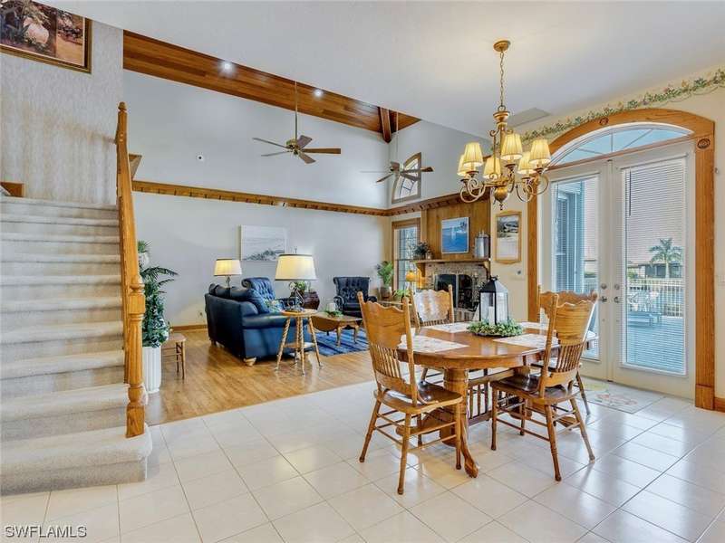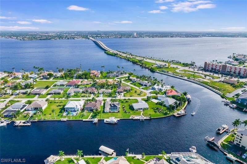 Absolutely one of the best locations in Cape Coral with incredible boating access, big water views and fully furnished for your convenience. This beautiful home has been meticulously cared for and boasts a brand-new metal roof in 2023. The interior showcases exquisite craftsmanship, highlighted by custom solid wood cabinetry throughout. The gourmet kitchen is a chef's dream, featuring dual dishwashers, two ovens, marble countertops, and not one but two islands, all complemented by a breathtaking view out to the intersecting canal view. The family room impresses with a vaulted ceiling adorned with beautiful tongue and groove wood. On the second floor, a vast screened porch, offering panoramic views of the water and stunning sunsets. Upgrades abound, including dual staircases, a three-car tandem garage, a convenient laundry chute leading to a spacious laundry room, and a generously-sized multipurpose game room on the second floor that could easily be converted into an additional bedroom or used as an office. Further enhancing this residence are a wood-burning fireplace, and custom millwork throughout. This level of detail must be seen to be truly appreciated.