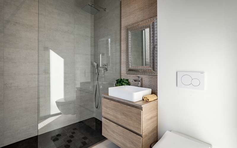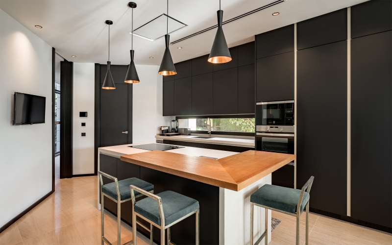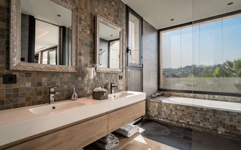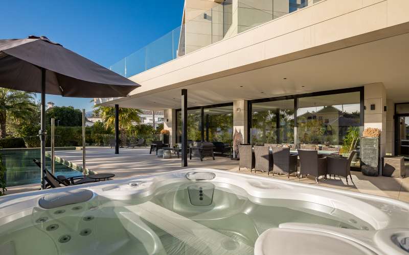 The stylish villa is on a fenced 1300 sqm of land offering tranquillity far away from the noise. On the exterior, a swimming pool with sunbathing areas, large covered terraces for outdoor dining areas, and a jacuzzi are available.