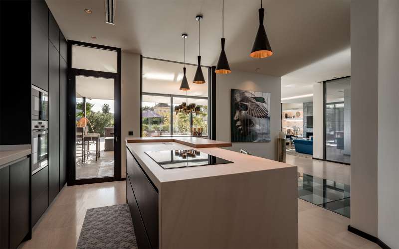 The villa is 3 floors and south facing seems beautiful nature views. In the interior, the open-plan concept is dominant providing lots of sunlight. The luxury villa has a fully equipped kitchen with Balay brand appliances, a lift, and a large terrace.
