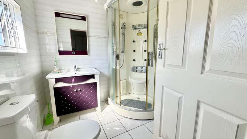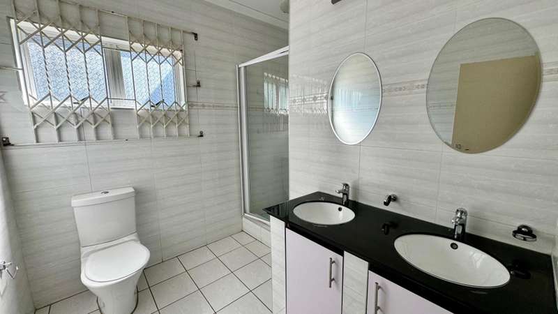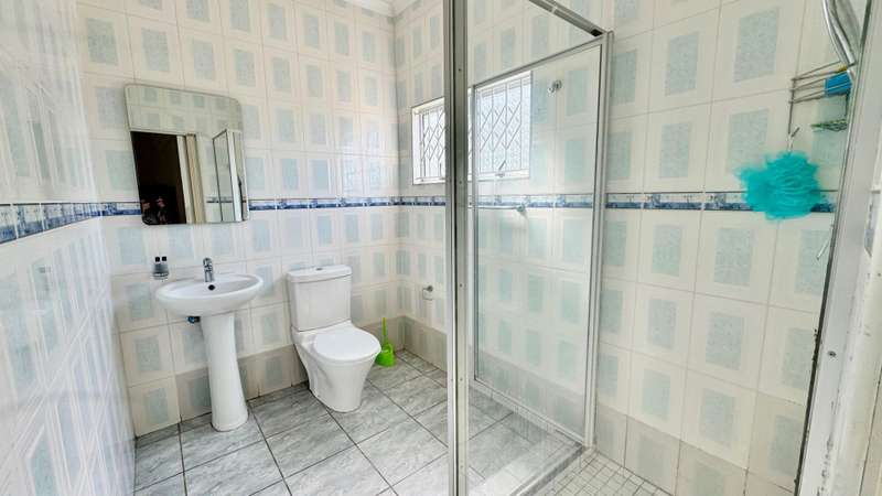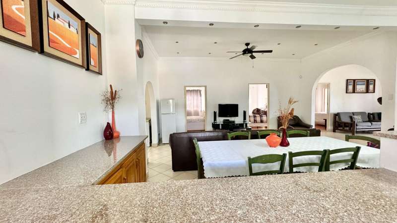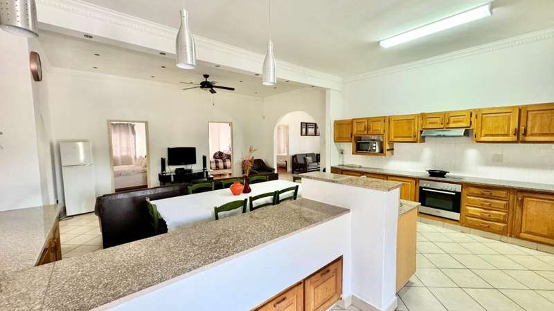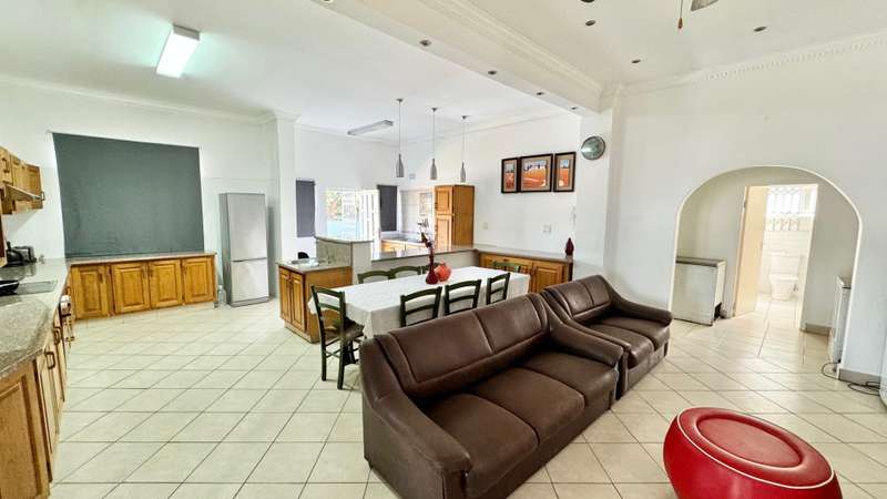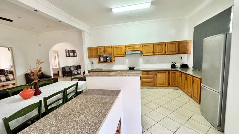 Featuring 5 bedrooms three of which have en suite bathrooms, it offers ample space and comfort. Open-plan kitchen with oak cupboards, granite tops, scullery, double sink, prep sink, electric undercover oven with hob and extractor fan. The kitchen overlooks the dining room and lounge leading off into the TV lounge and enclosed veranda.