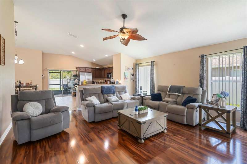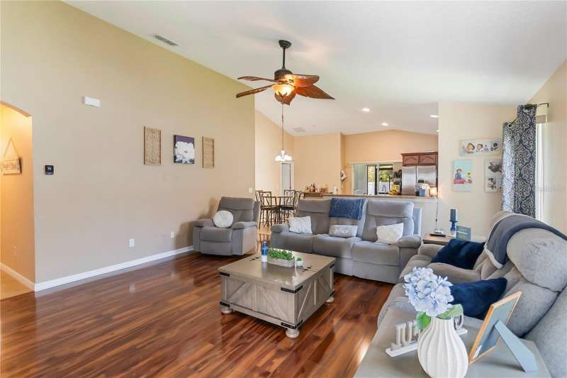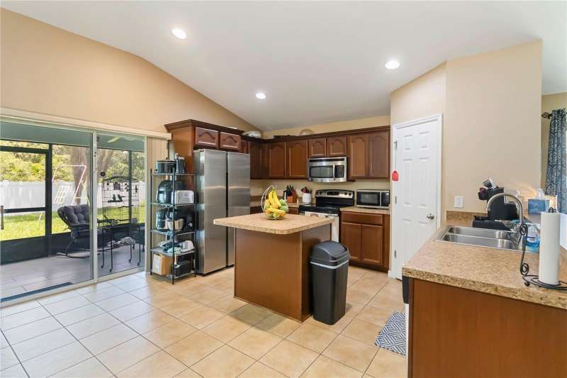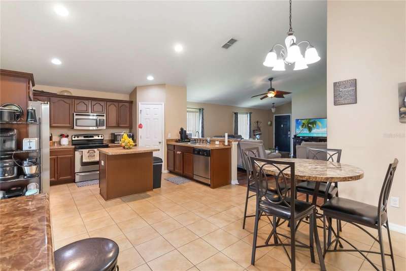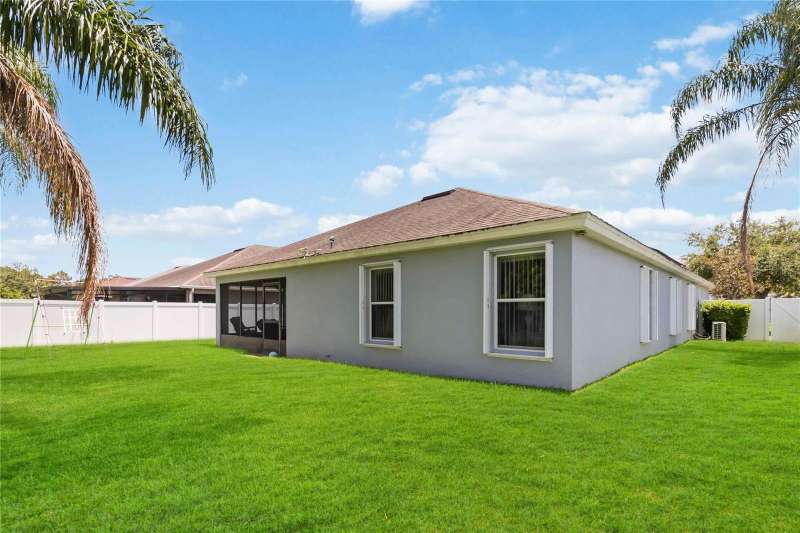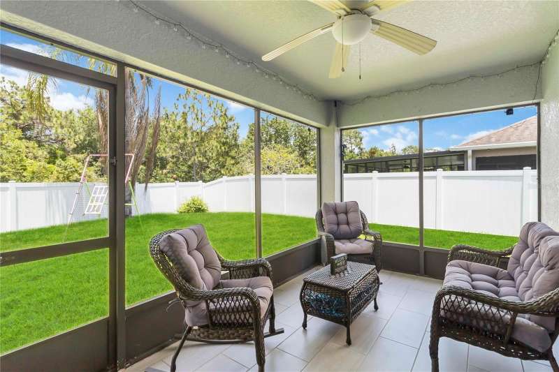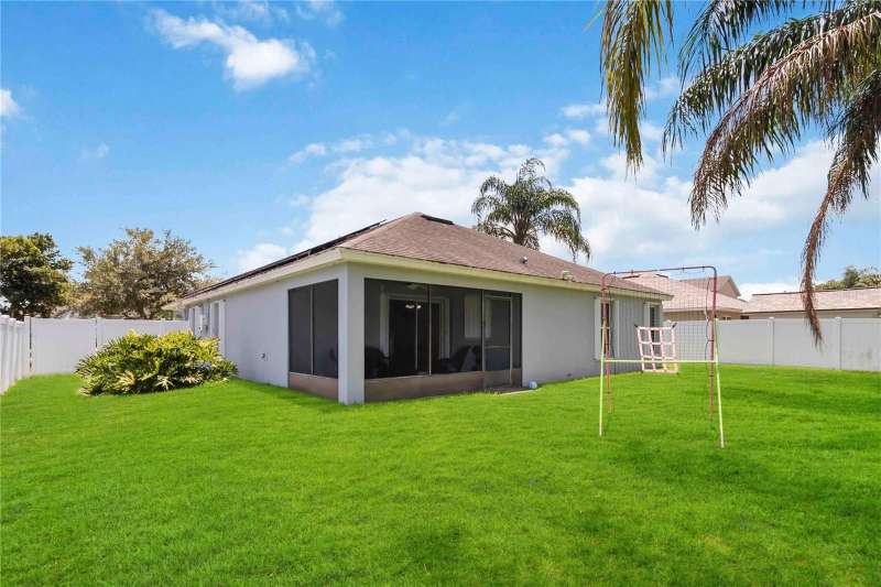 NO REAR NEIGHBORS | SOLAR PANELS PAID AT CLOSING | 2024 A/C | FLEX SPACE CAN BE USED AS A 5TH BEDROOM! Enjoy peace, privacy, and energy efficiency in this beautifully maintained 4-bedroom, 2-bath home featuring a NEW A/C (2024), FULLY PAID solar panels, and no rear neighbors! Located in a desirable community with low HOA and no CDD, this home offers the perfect blend of comfort and convenience. Step inside to an open floor plan with laminate and ceramic tile flooring throughout —no carpet here! The spacious kitchen boasts a center island, stainless steel appliances, and ample cabinet space, ideal for home chefs and entertainers alike. The large laundry room includes plenty of storage plus a washer and dryer. Relax year-round in the screened lanai, overlooking the fully fenced backyard, perfect for pets, play, or gardening. Home also includes whole-house hurricane shutters for peace of mind during storm season. Community amenities include a sparkling pool, tennis courts, and playground. All just minutes from the Turnpike, shopping, dining, grocery stores, the hospital & much more! This one checks all the boxes—schedule your private showing today!
