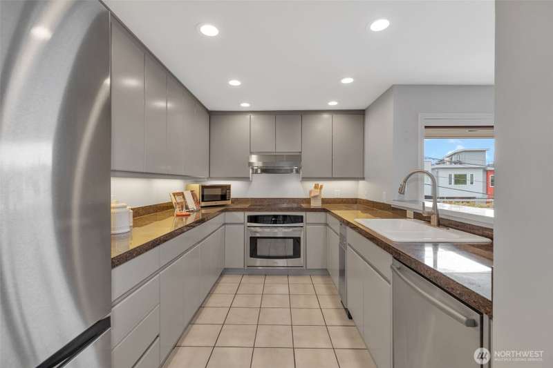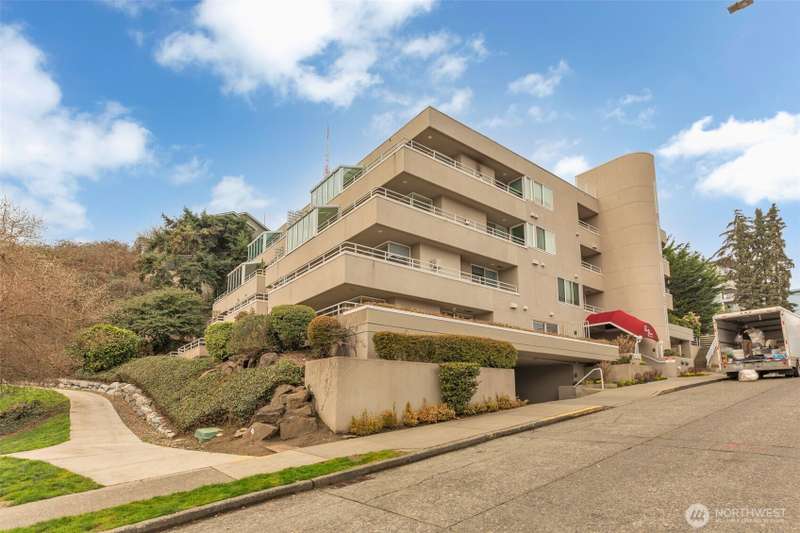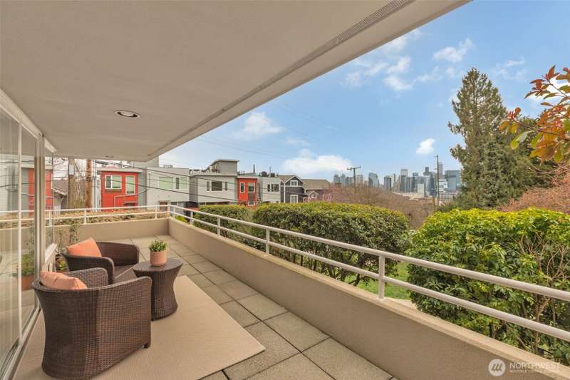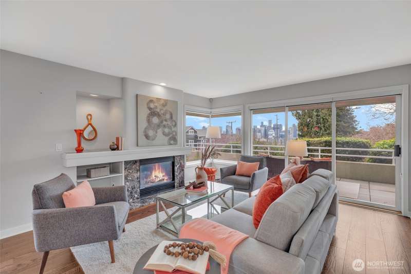 Iconic Queen Anne Corner Unit with Space Needle Views! Welcome to your Queen Anne escape, an exceptional home with panoramic skyline views! This updated 2-bedroom, 2-bath condo is filled with natural light and features hardwood floors, a wraparound patio with iconic South and East exposures, and an open living space with a gas fireplace. The primary suite is spacious, and the second bedroom works well for guests or a home office. Enjoy two side-by-side garage parking spots and a large private storage room. With strong Walk, Transit, and Bike Scores, you're close to cafes, restaurants, tech campuses, and everything Queen Anne has to offer. Well-managed HOA make for low-maintenance living in one of Seattle’s most sought-after neighborhoods.