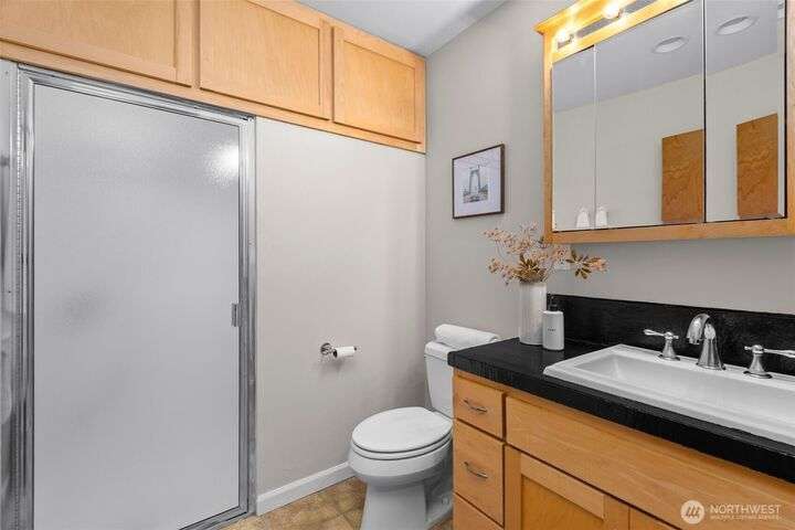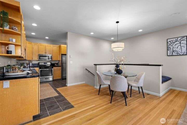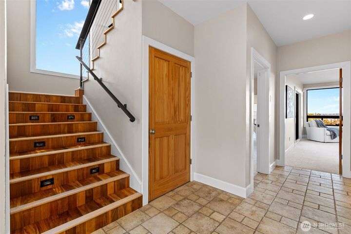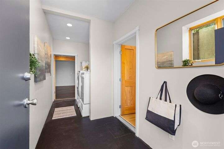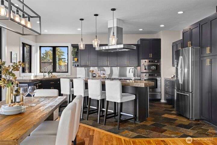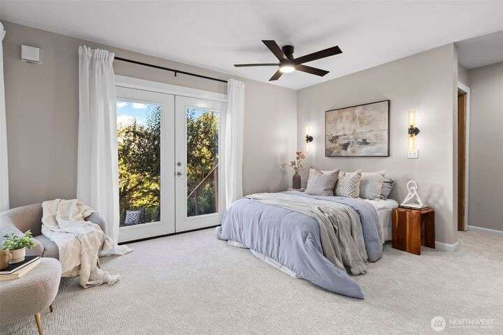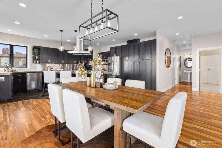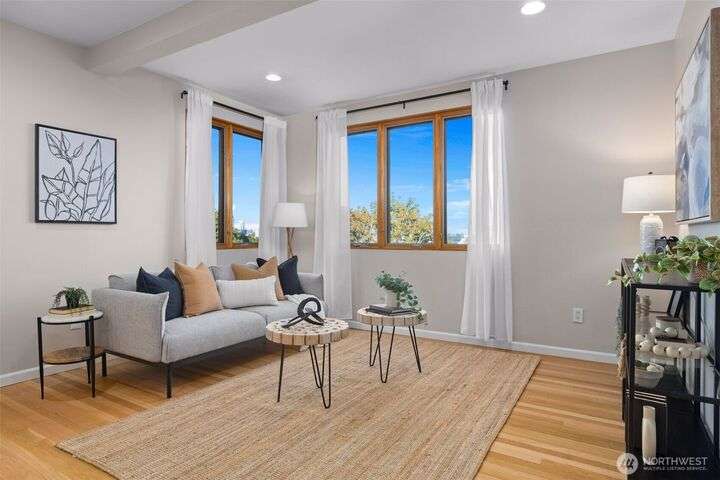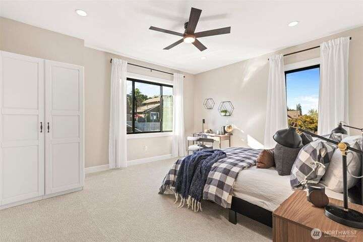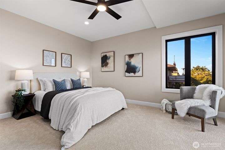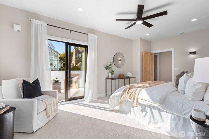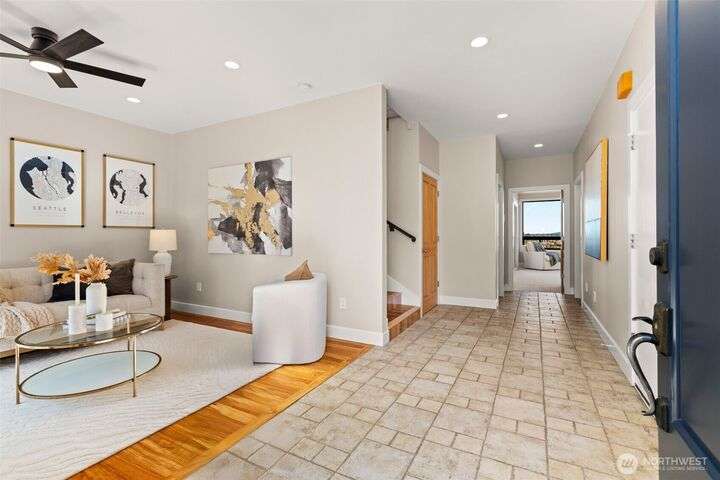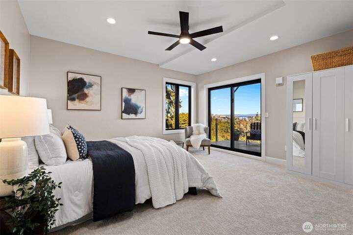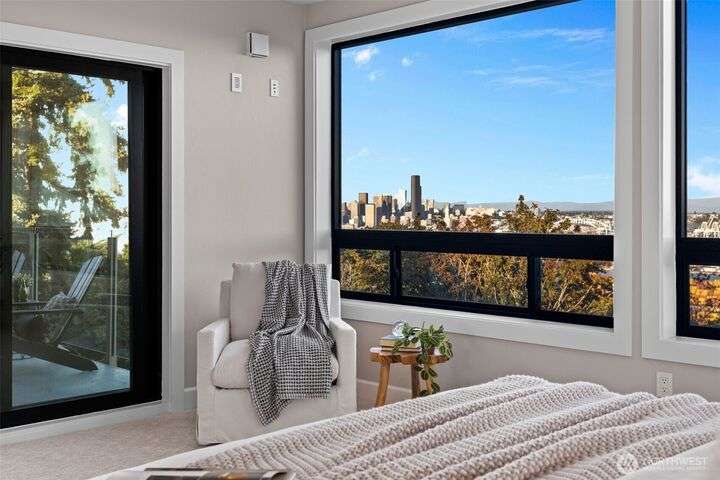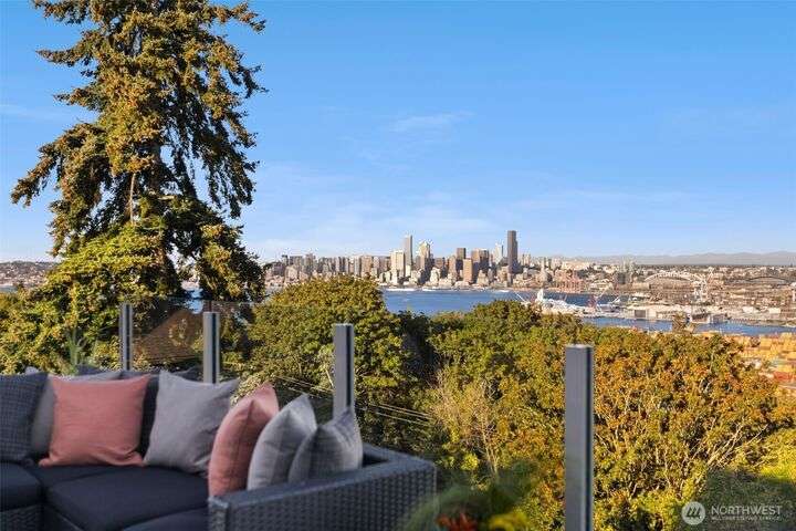 Located in the coveted Belvidere neighborhood, this modern city view home offers natural light, soaring ceilings, stunning views of Seattle, the Cascades, and Elliott Bay. The top floor showcases a dramatic great room w/ floor to ceiling windows, sliding doors to an expansive view deck, 2 bdrms & full bath. Main level has 2 more bdrms incl. a spacious primary suite, another full bath, a view deck & a bonus room. The lower level/ADU adds 2 bdrms (one a second primary), 2 baths & flexible living areas. Outside is a private fenced patio & garden. Refinished hardwoods, refreshed kitchens w/ updated appliances, steam showers, soaking tubs, new windows, solar panels, 2-car attached garage & a workshop complete this impressive West Seattle haven.