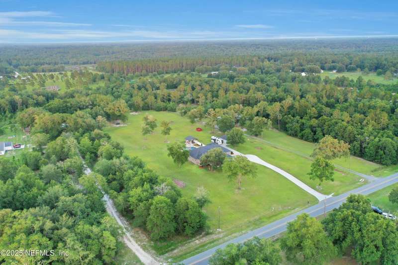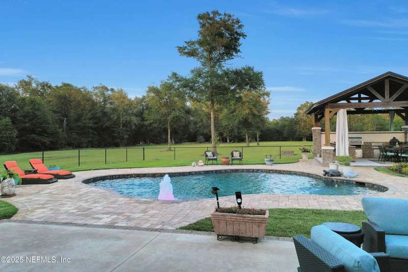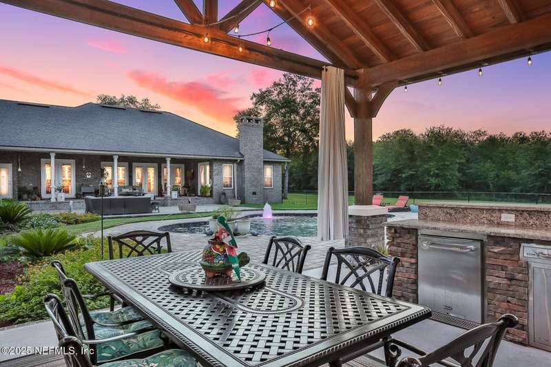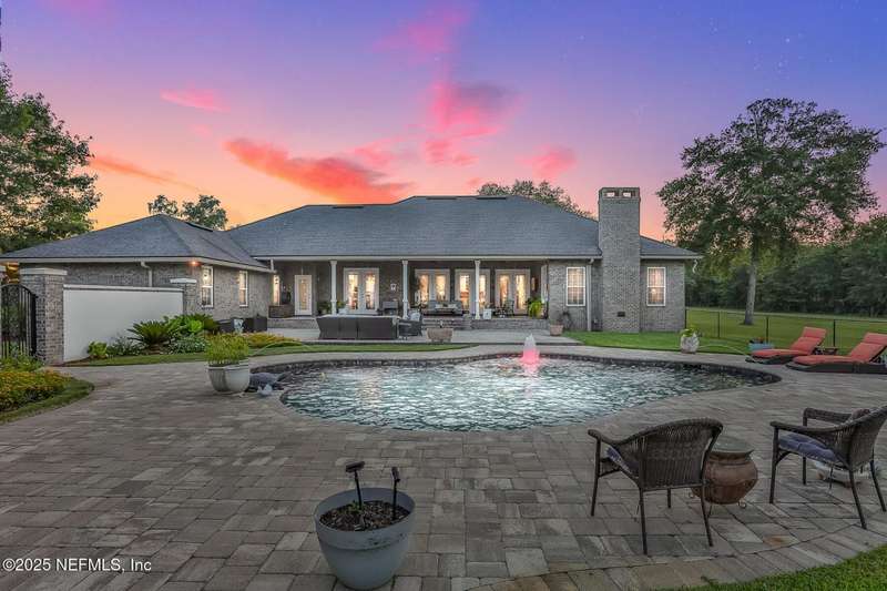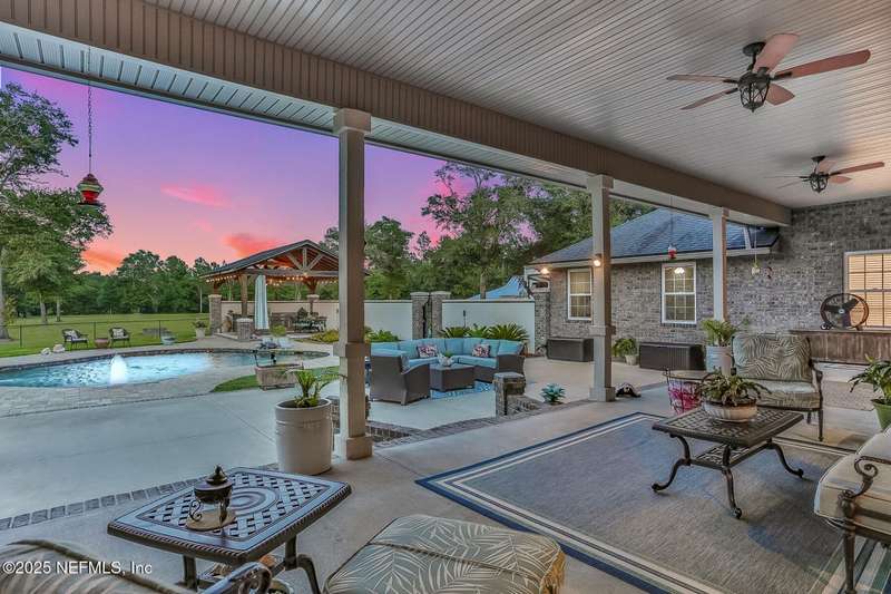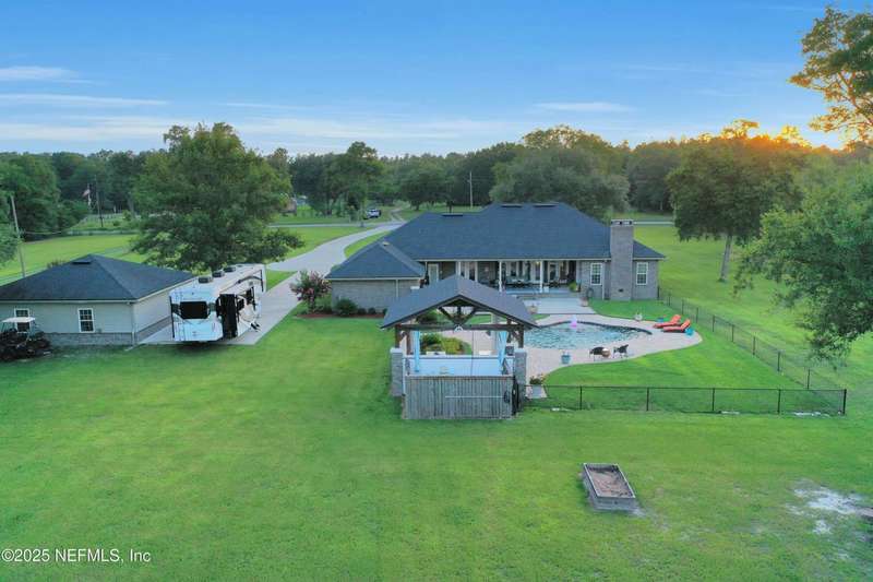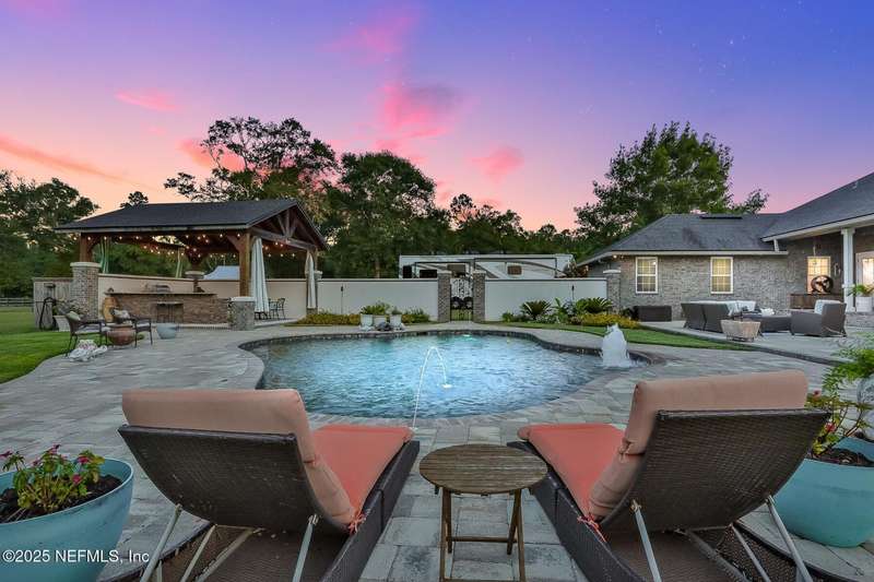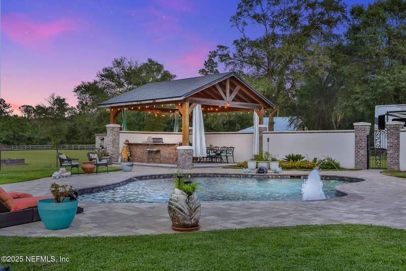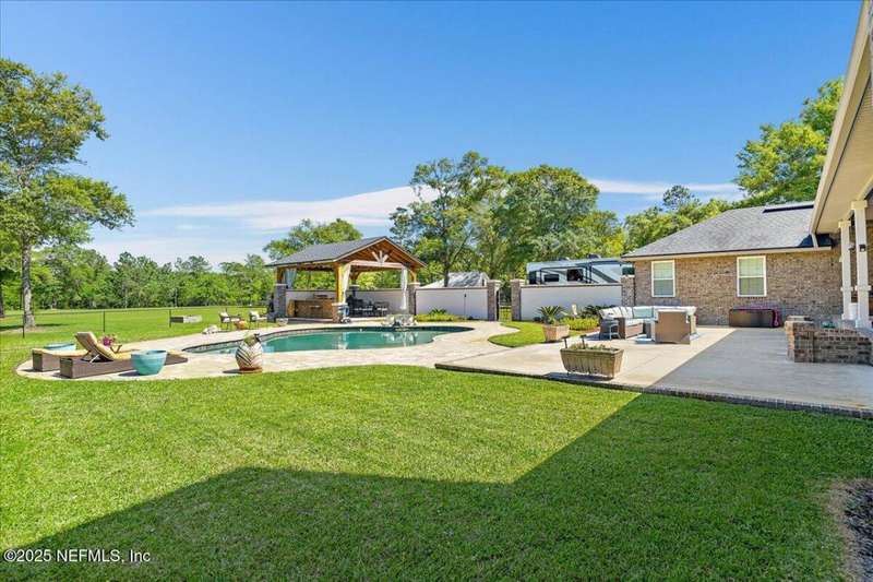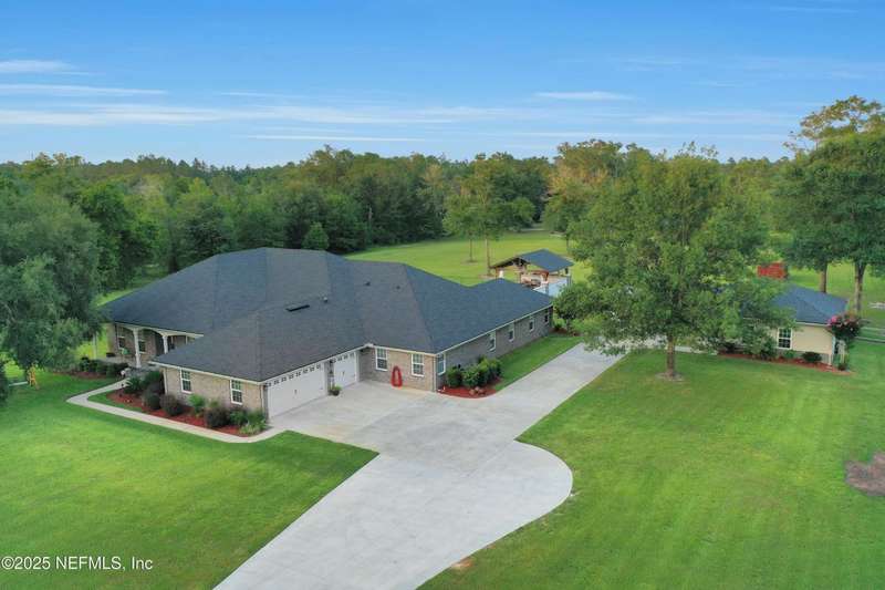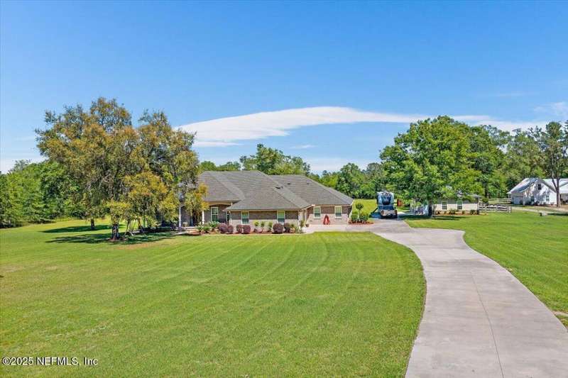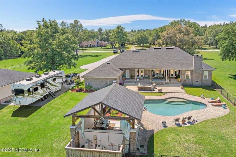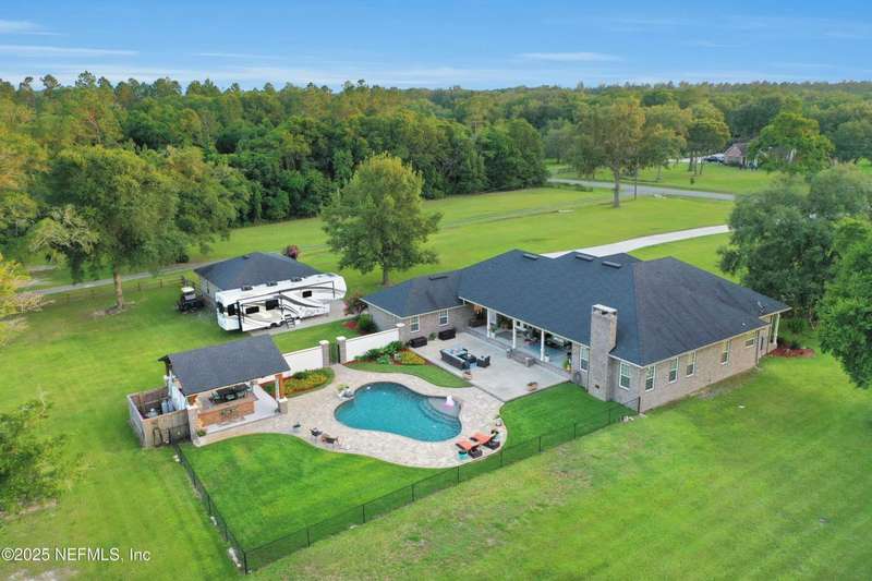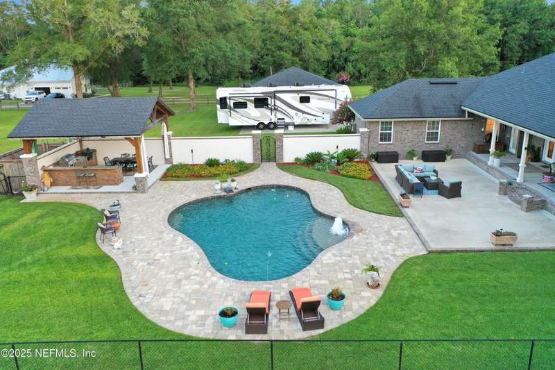 Luxurious 4BR/3.5BA pool home on 5+ acres, chef's kitchen, detached workshop. A luxurious oasis awaits on 5+ private acres with this stunning 4-bedroom, 3.5-bath custom pool home designed for both everyday comfort and high-end entertaining. Step through double mahogany doors into an open-concept living space with panoramic views of the saltwater pool, summer kitchen, and expansive property. The chef's kitchen is the heart of the home, featuring a 10-foot island with built-in cabinets, high-end appliances, stone backsplash, pull-out cabinetry, and a large walk-in pantry. Enjoy a dedicated butler's bar and seamless indoor-outdoor flow through oversized doors opening to the covered patio and pool. The spacious primary suite offers a sitting area with brick wood-burning fireplace, private patio access, and a luxurious en-suite bath with a custom walk-in closet. A split floor plan includes a private guest suite with en-suite bath and two additional bedrooms connected by a Jack-and-Jill bath. Outdoor living is elevated with a custom timber-framed summer kitchen featuring granite counters, gas burners, wood grill, refrigerator, and sink. Relax in the tranquil saltwater pool with soft lighting and water features. Additional highlights include a 5-car garage, detached insulated workshop with a mini split, cabinets, and ample space for tools, toys, or projects. Property includes a separate well and septic system ideal for homesteading or a garden. Located just minutes from I-10 for an easy commute to Jacksonville or Lake City