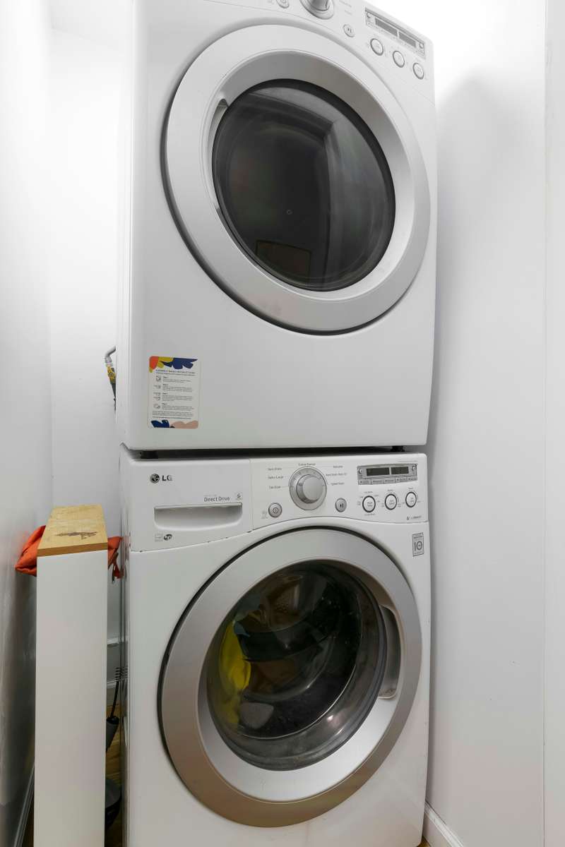 A restored stairwell leads upstairs to a bright and inviting duplex spanning the second and third floors. This residence offers three bedrooms, two full bathrooms, a living room, bar area, den, modern kitchen, home office, and an in-unit washer and dryer. A small private balcony extends the living space outdoors. The front portion of the fourth floor is designed to connect with this duplex, creating an expanded layout with an additional bedroom and den.