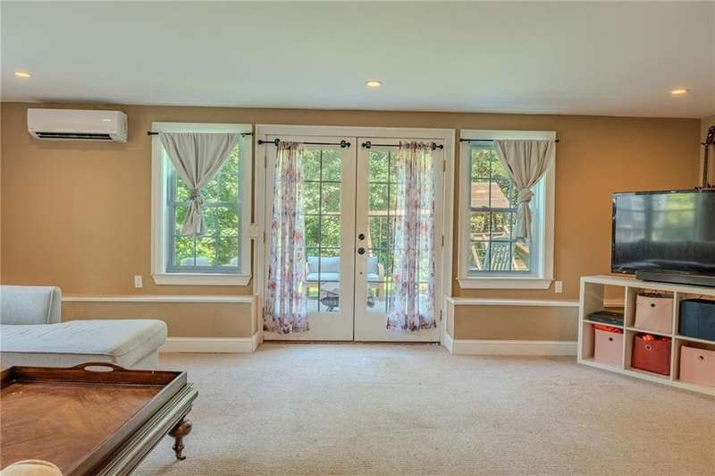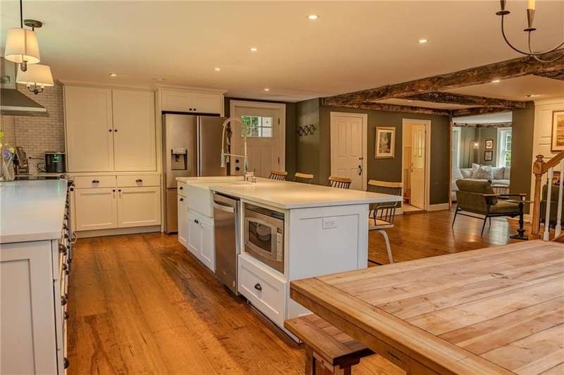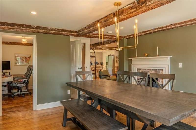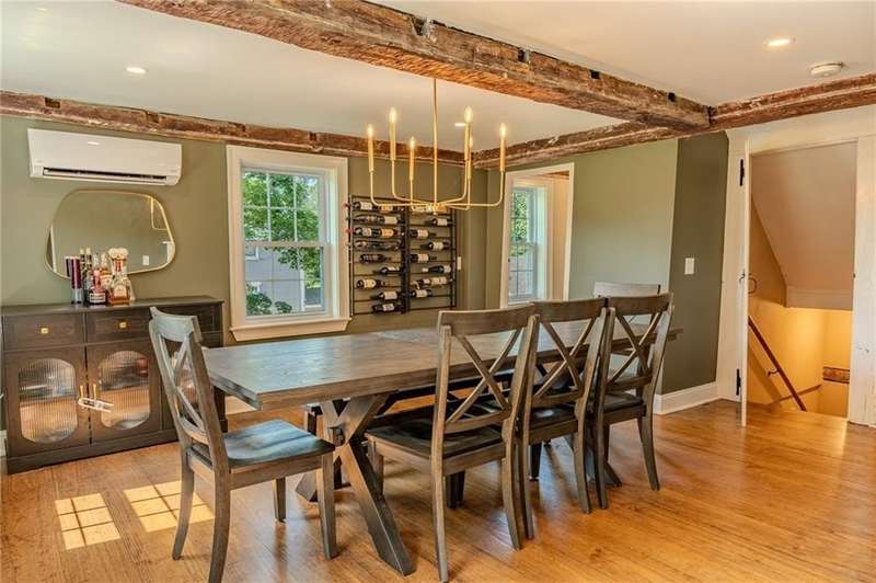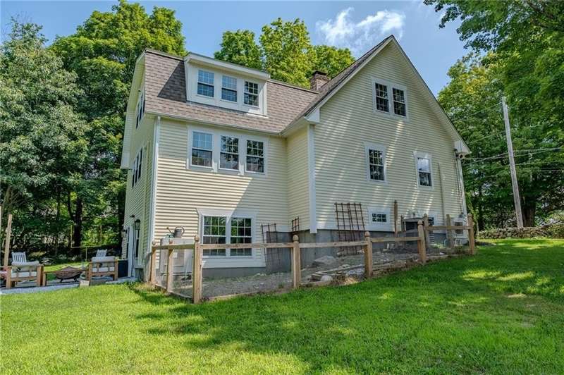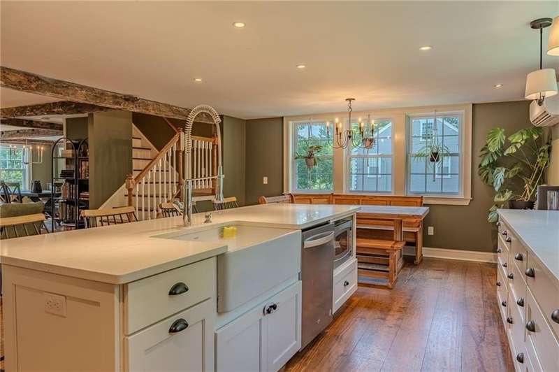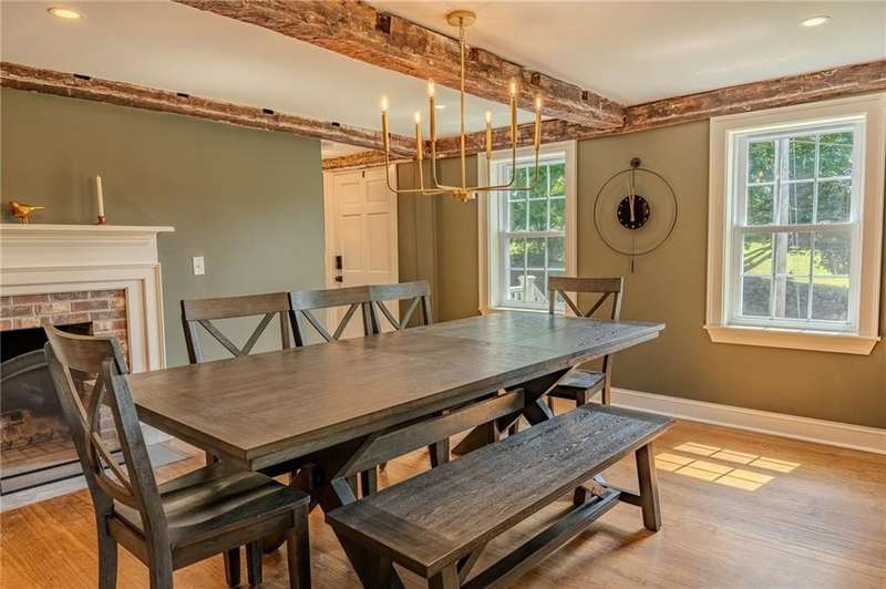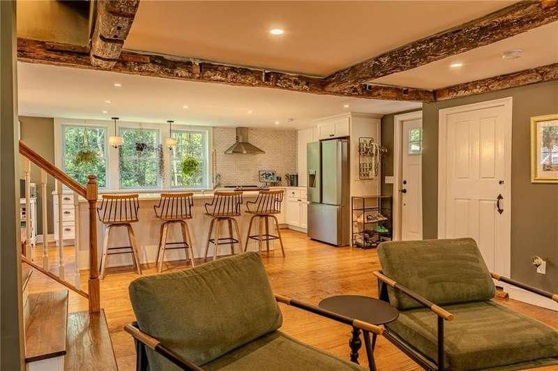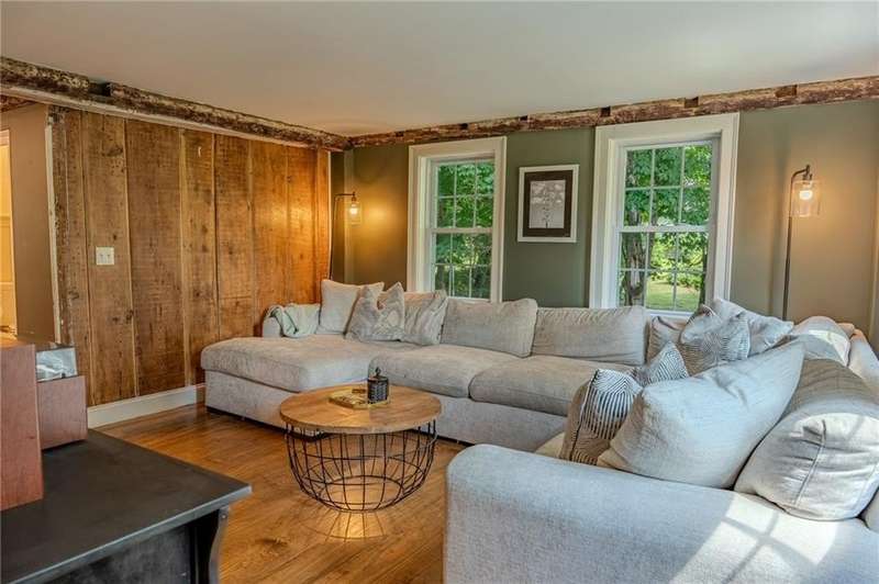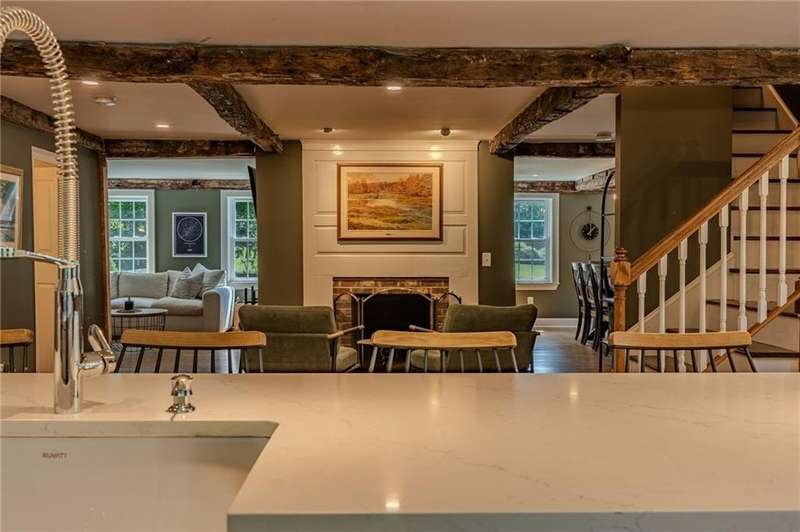 Modern Living Meets Historic Charm in Sought-After Smithfield! Once the historic Updyke Lawton home, this unique property was carefully moved and thoughtfully rebuilt into the stunning residence it is today. From the front, it presents as a classic Cape, but inside, this deceptively large property blends timeless character with modern updates in a uniquely inviting way. Featuring 4 generous bedrooms and 4 full baths, the home includes original wide plank wood flooring, exposed wood beams, and three working stone fireplaces. The modern kitchen is a stand-out, bright and airy, complete with a large center island, farmhouse sink, and adjacent dining area. The first floor also offers a formal dining room or lounge, a spacious living room, and a small dedicated office space. Upstairs, the expansive primary suite includes a private full bath and laundry area. Two additional bedrooms and another full bath complete the second floor. The finished lower level is bright and airy, offering incredible flexibility, with French doors, wall-to-wall carpeting, and walkout access to a serene patio and wooded backdrop. In addition to the large open space ? ideal for a family room, playroom, studio, gym - there is also a fourth bedroom, another full bath, and ample storage. Nestled in a serene setting conveniently located near Rt. 295, top-rated schools, recreation, shopping, and dining, this property offers historic beauty with modern functionality. Subject to seller finding suitable housing.
