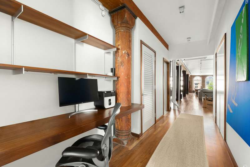 This fully furnished 3-bed, 3-bath loft at 307 West Broadway offers the rare opportunity to live in a full-floor residence in a boutique SoHo co-op of just seven units. Flooded with natural light from 16 windows across four exposures, the home spans an impressive 35 feet along a tree-lined stretch of West Broadway. Exposed brick, original columns, tin ceilings, and wood beams set the stage for a renovated interior that balances historic character with modern comfort. A private keyed elevator opens directly into the residence, where thoughtful separation of space includes three bedrooms, three baths, dedicated office and in-unit washer/dryer. Kitchen includes high end appliances from Sub Zero, Wolf, Miele and American Range.